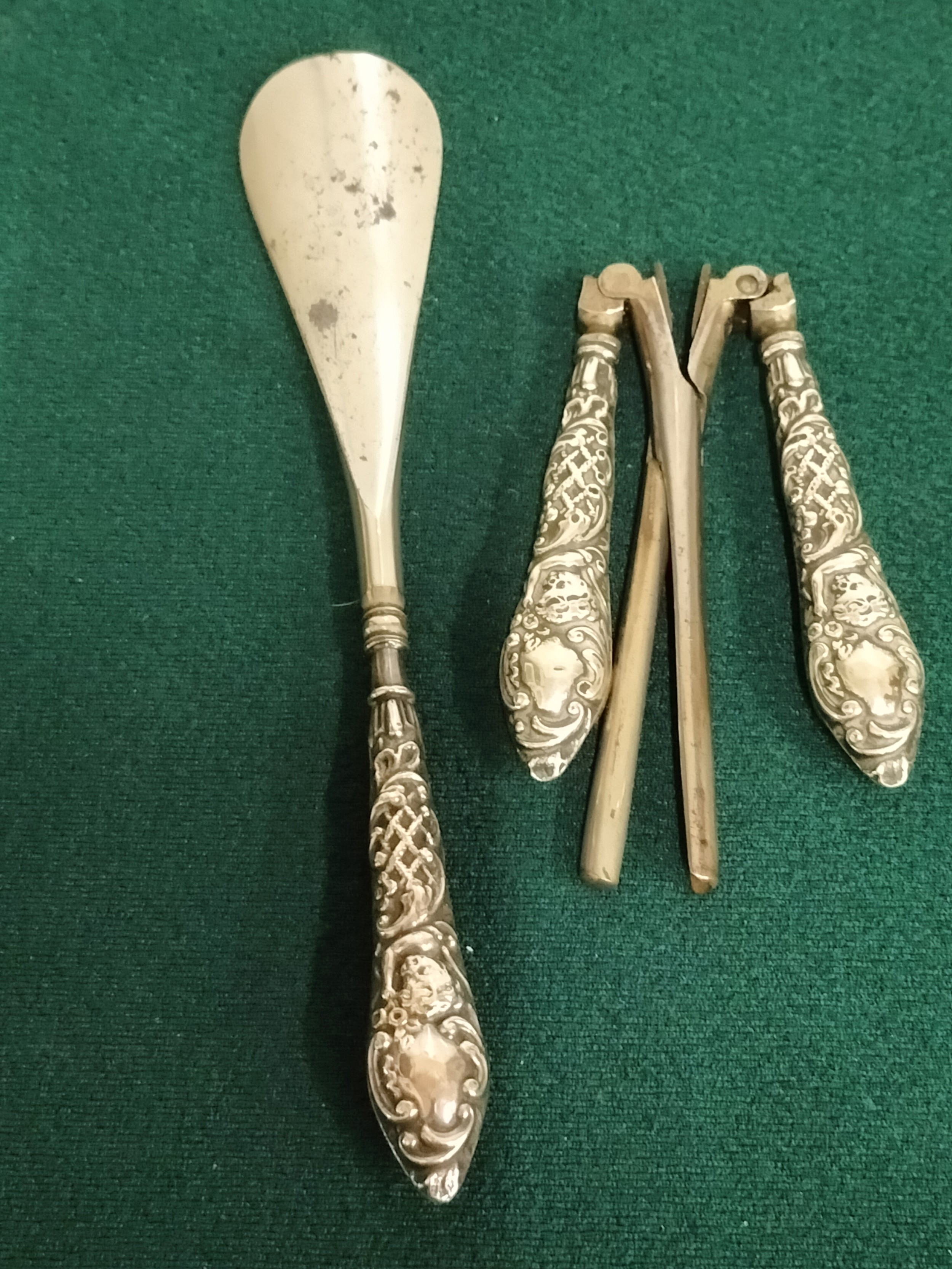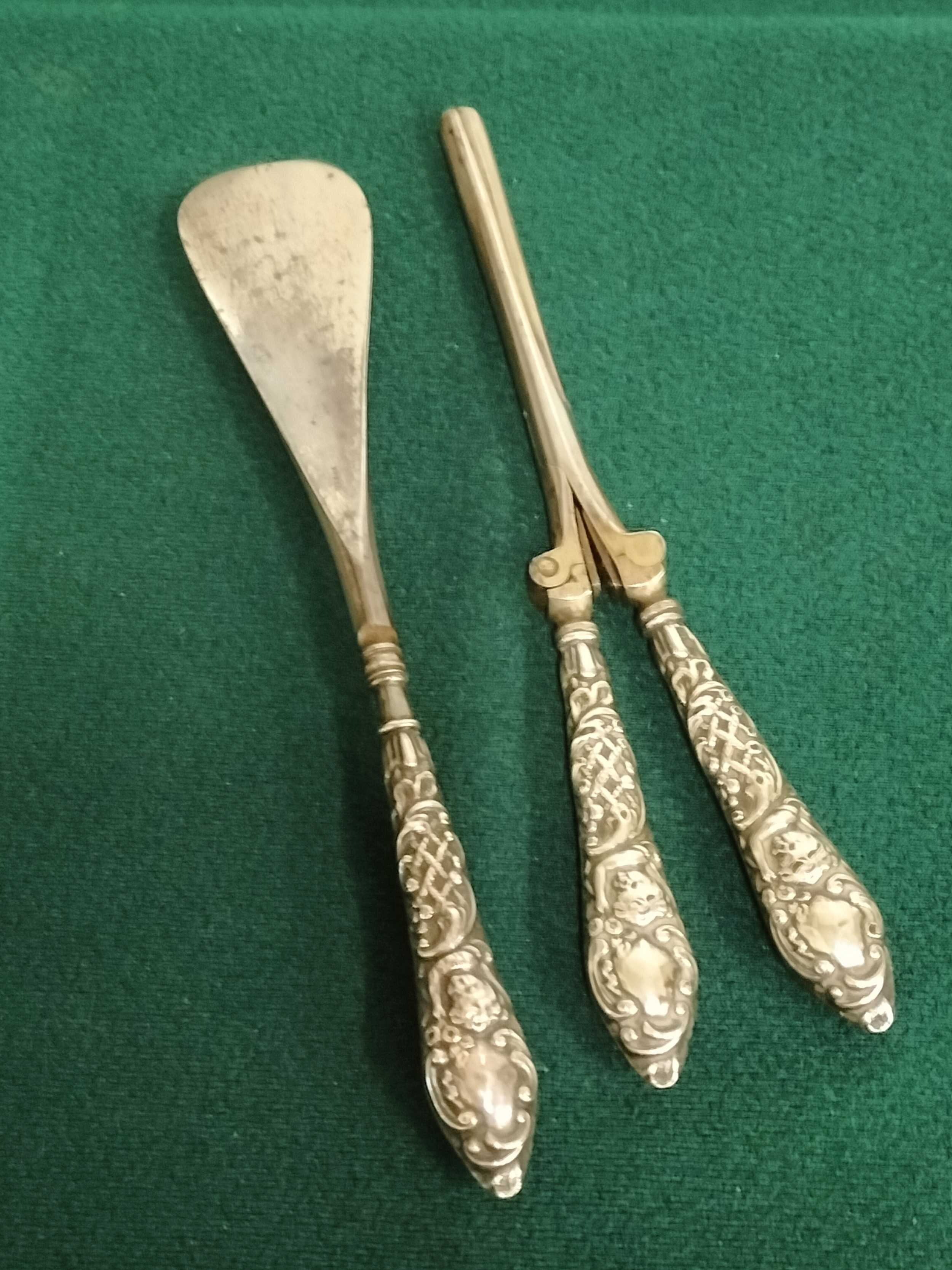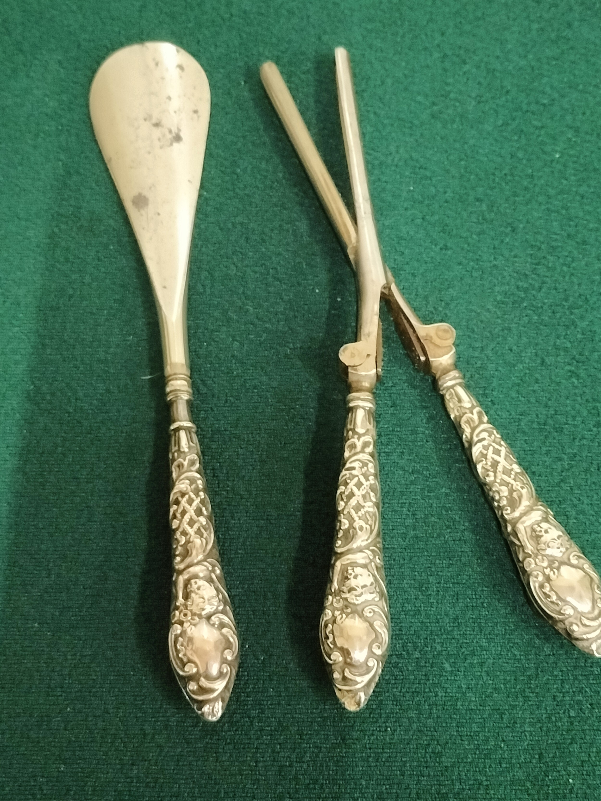 Silver handled curling tong and shoe horn