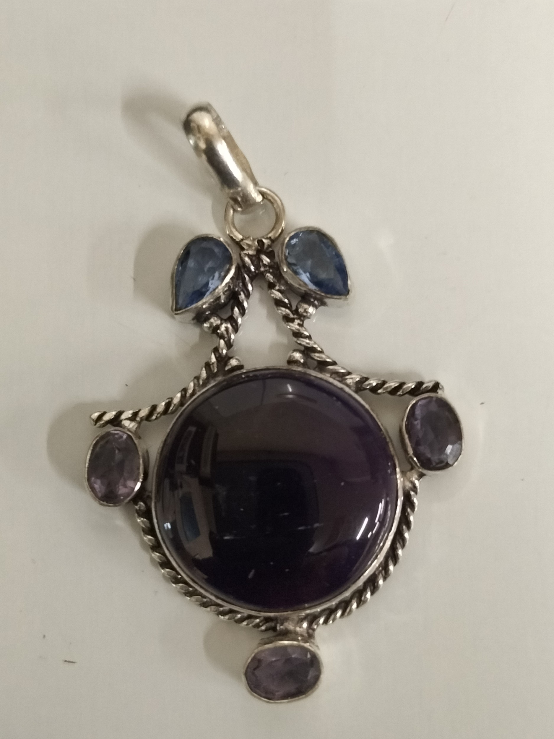 Silver Pendant Featuring a large central Amethyst Gem Stone and small Blue iolite accent Stones Approximately 2inch