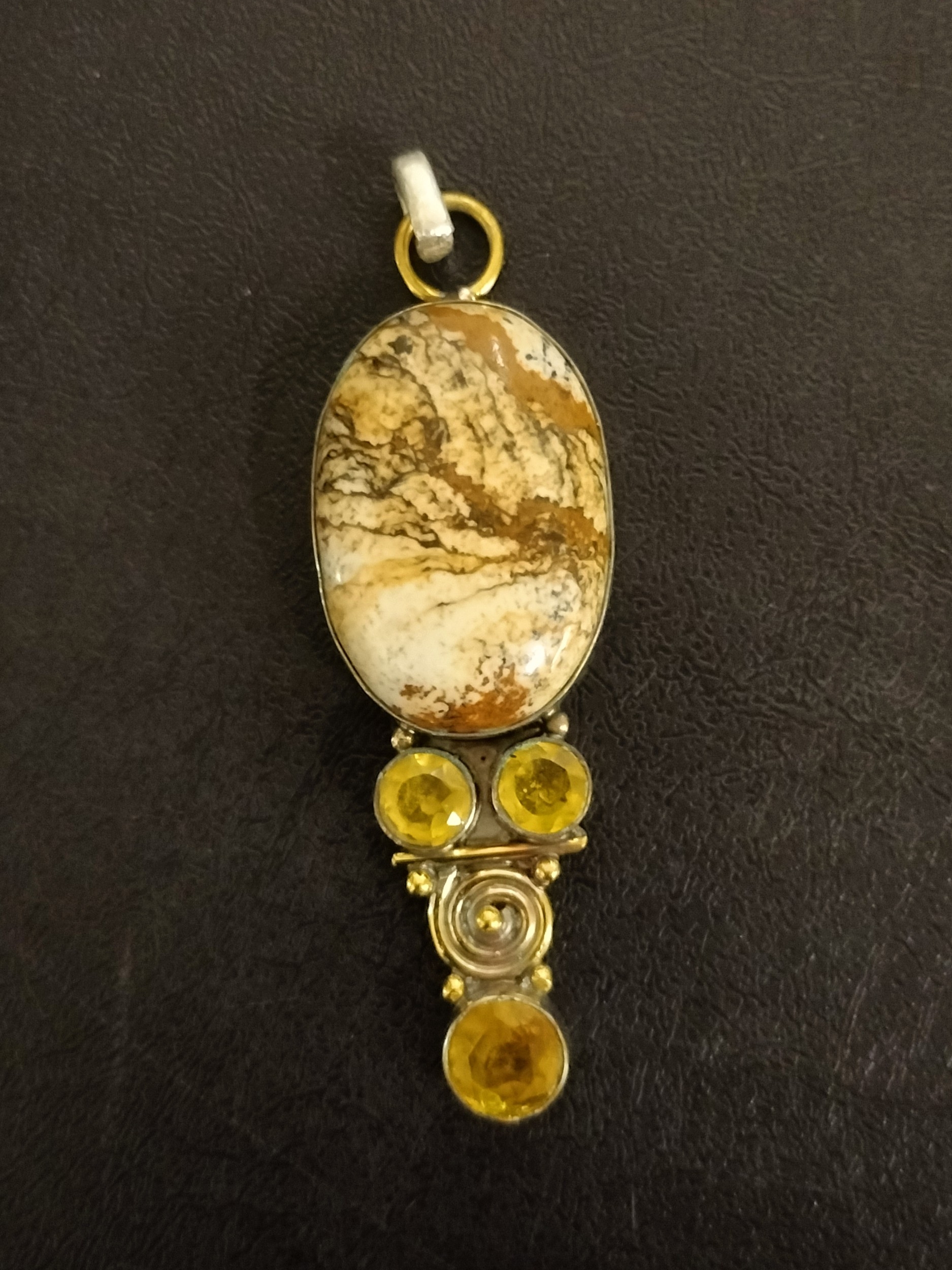Sterling Silver and Gold Plated pendant featuring a Large Oval Jasper Stone and 3 yellow Citrine Gem stones approximately 6cm