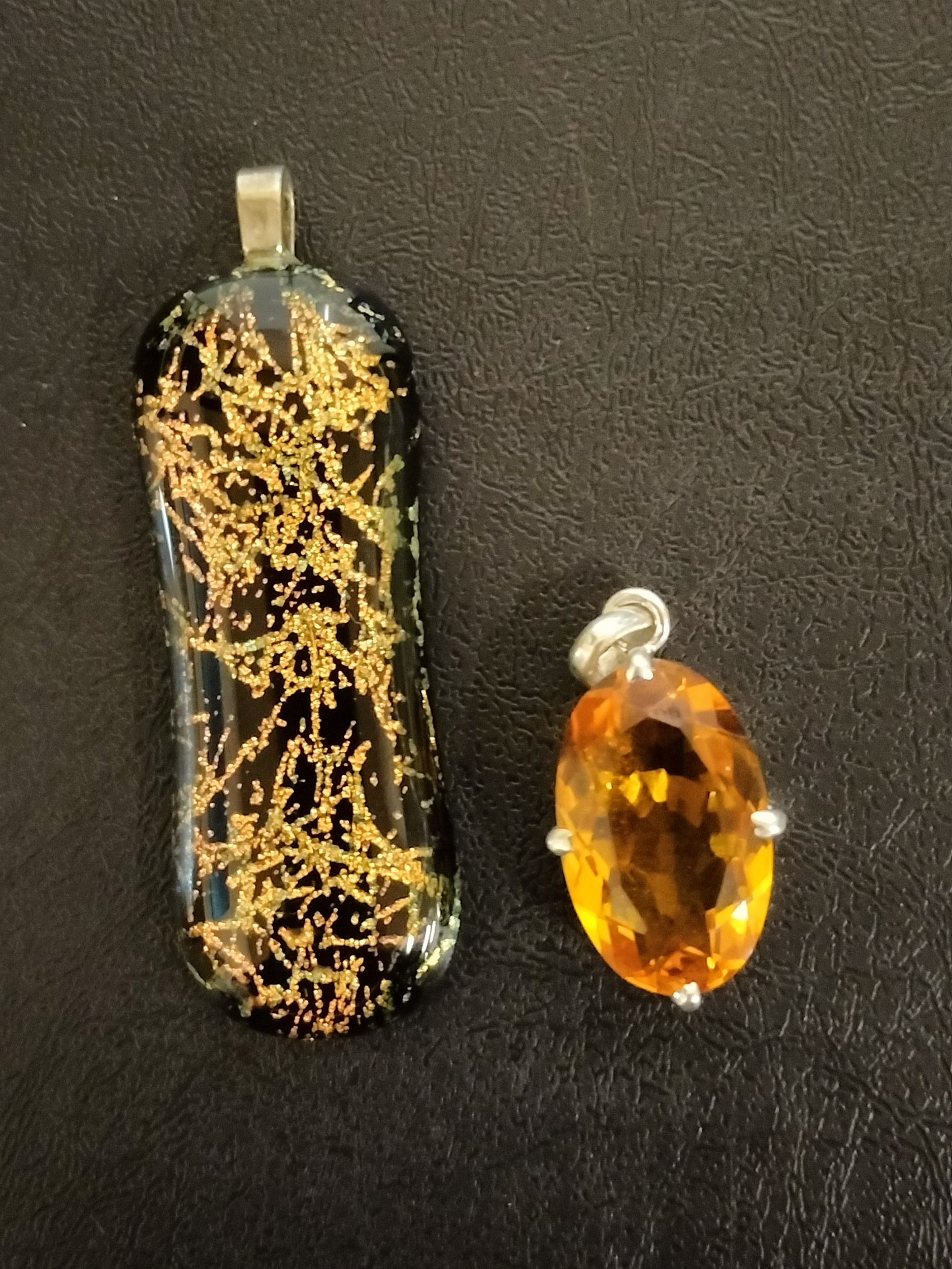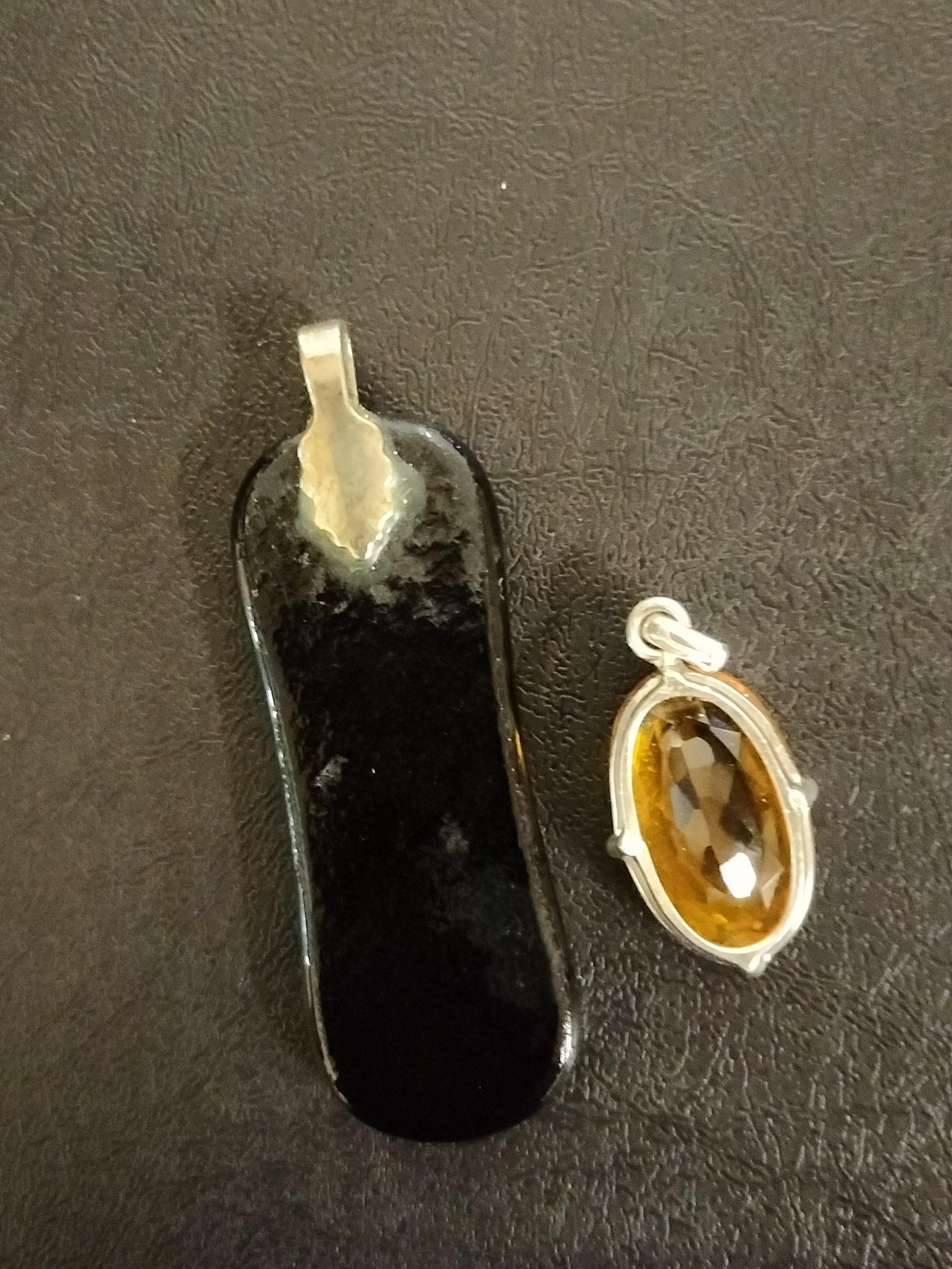 Hand Made Black and Gold Dichroic Fused Glass pendant with Silver Bale and a 925 Citrine Pendant. Approximately 6cm and 2.5cm