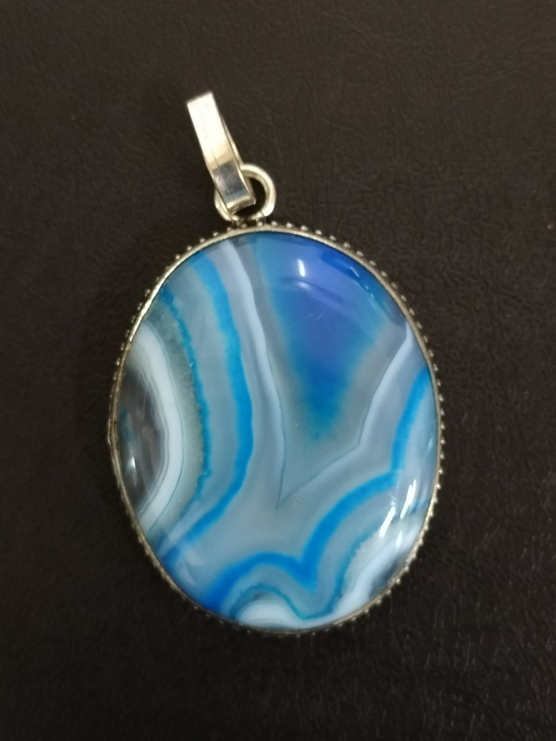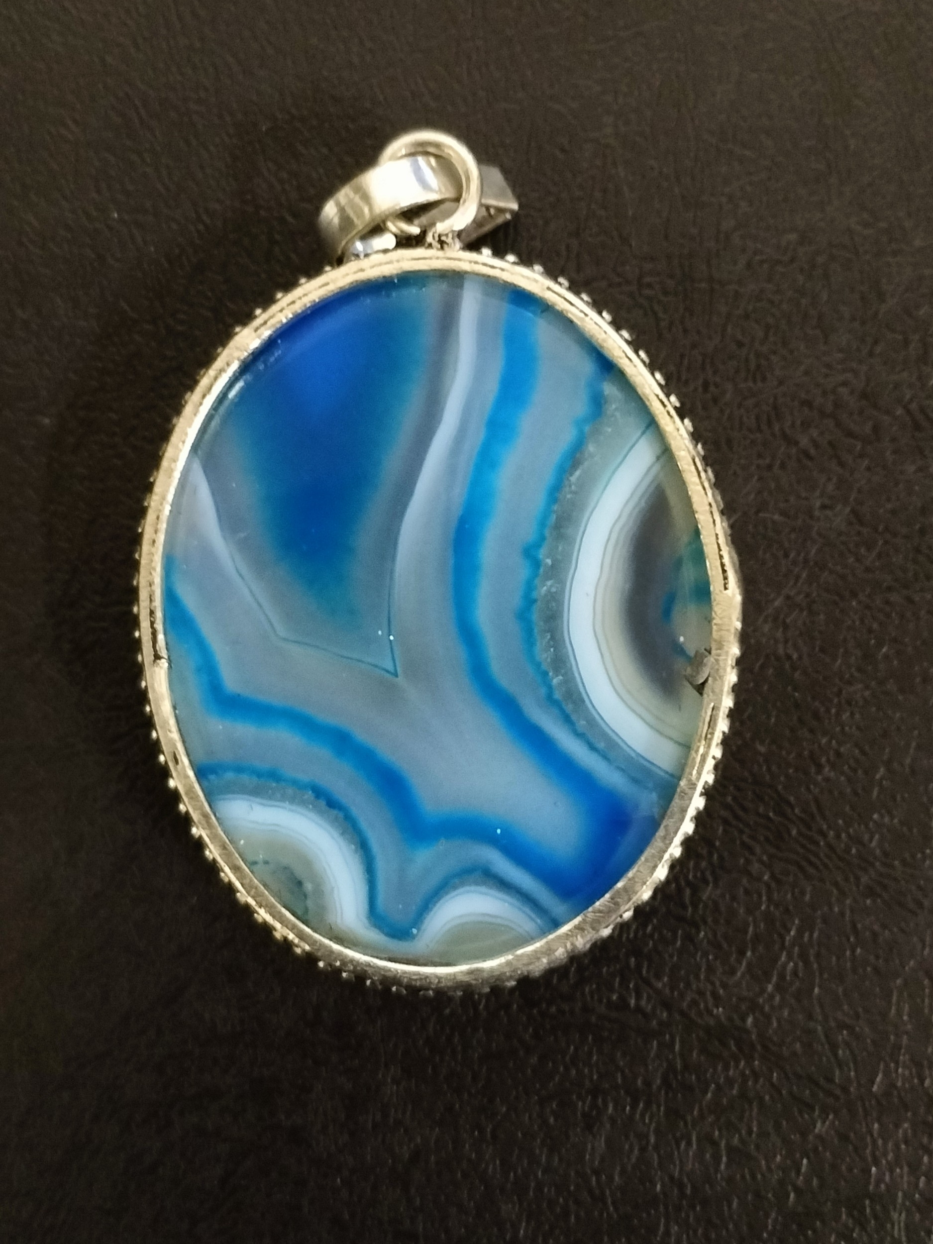 Agate Gem Stone Pendant with Banded Blue and Grey Pattern set in white Metal, Possibly Silver Approximately 4.5cm