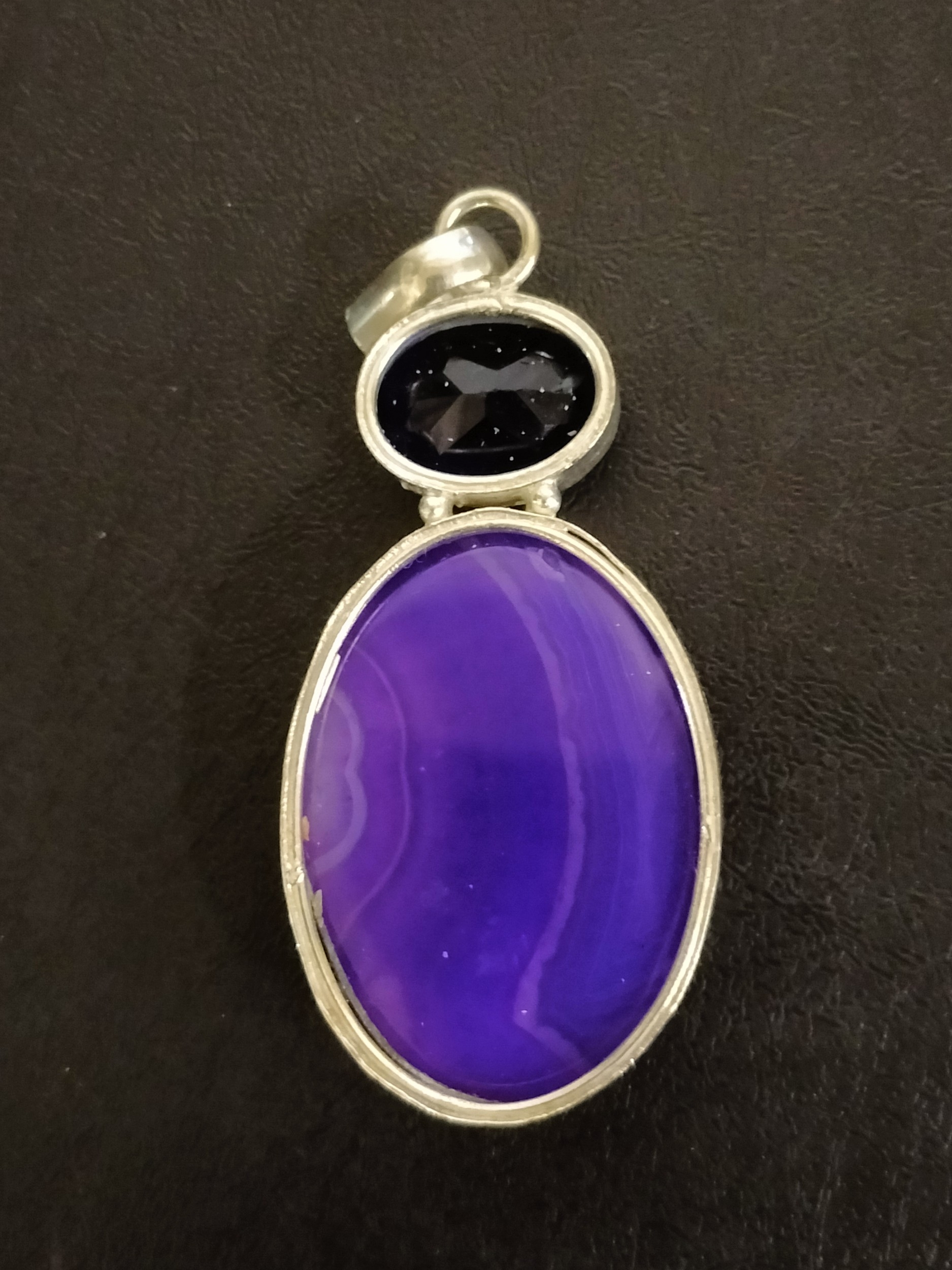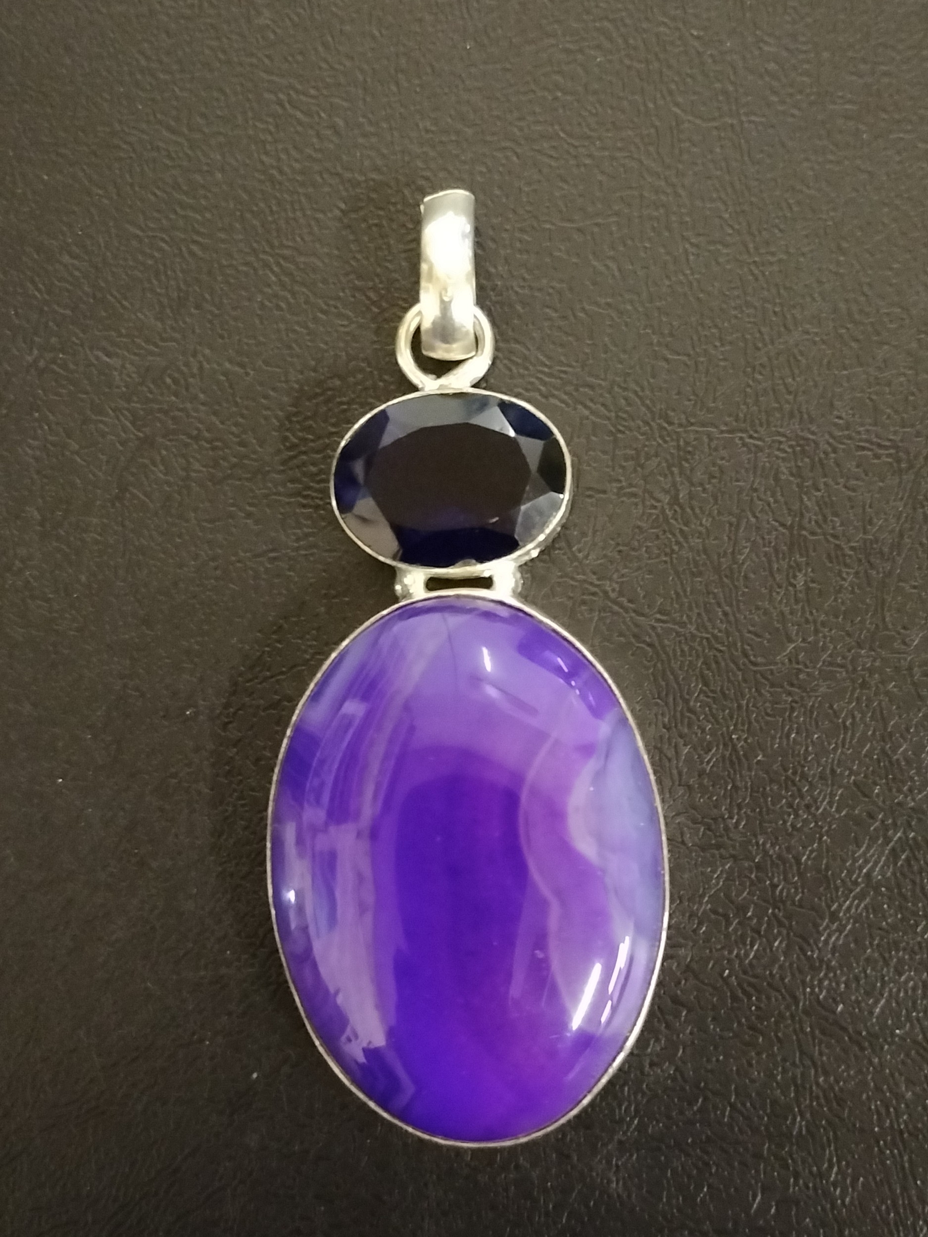 Sterling Silver Pendant Featuring a large Purple Agate and smaller Blue Gem stone, Approximately 6cm