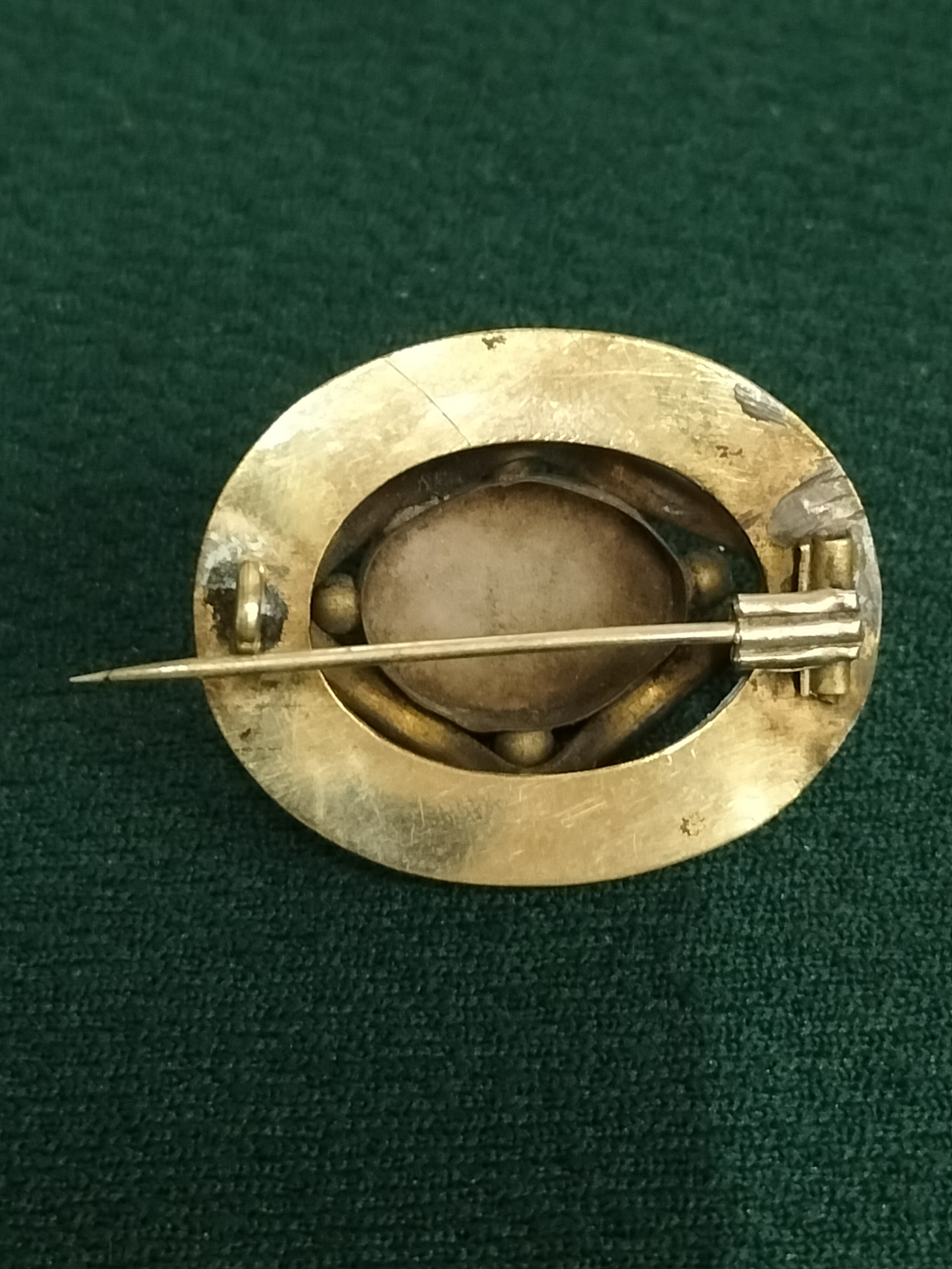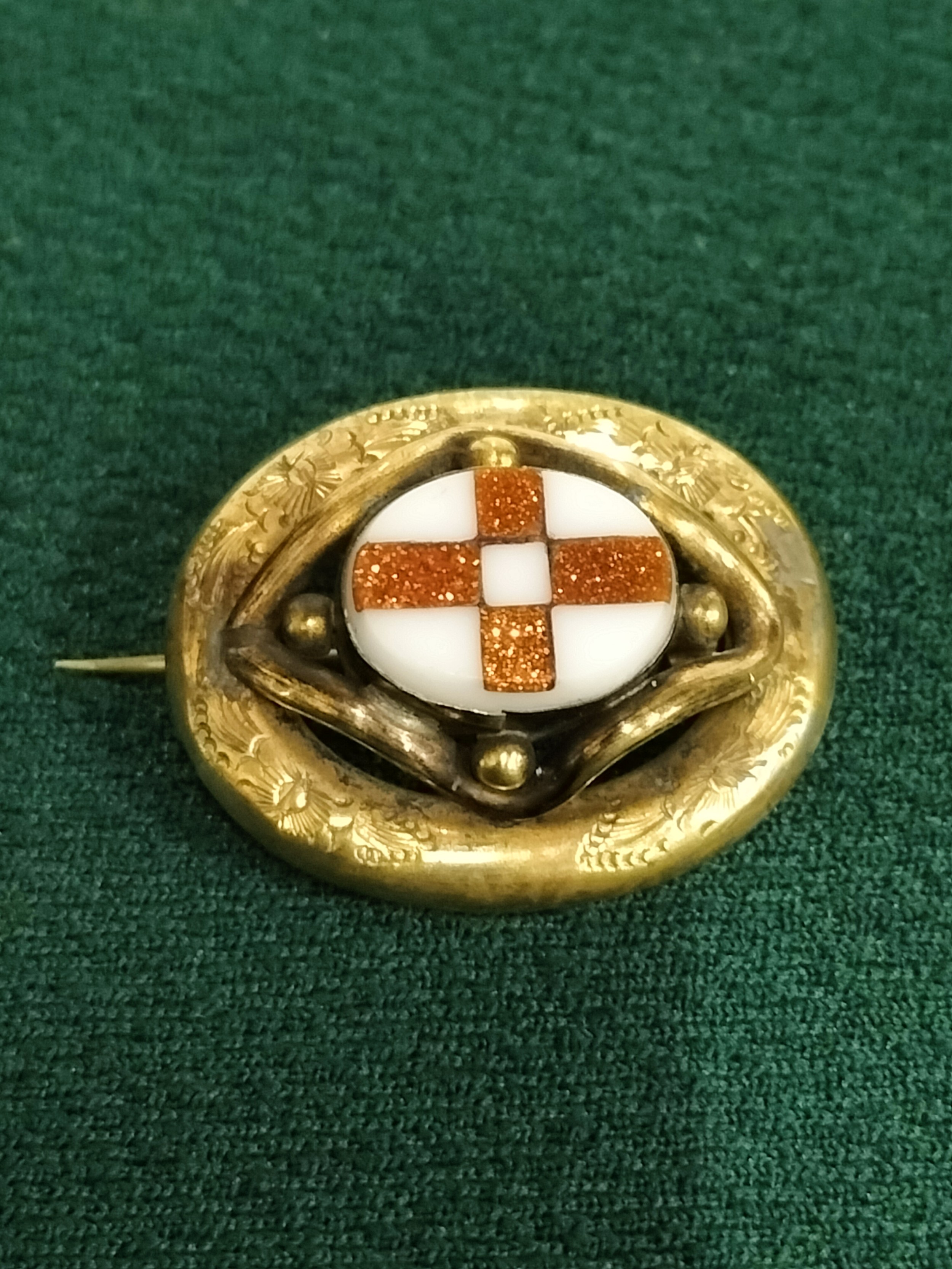 Antique Vintage Gold Tone Brooch with central cross motif, featuring white material and Gold stone