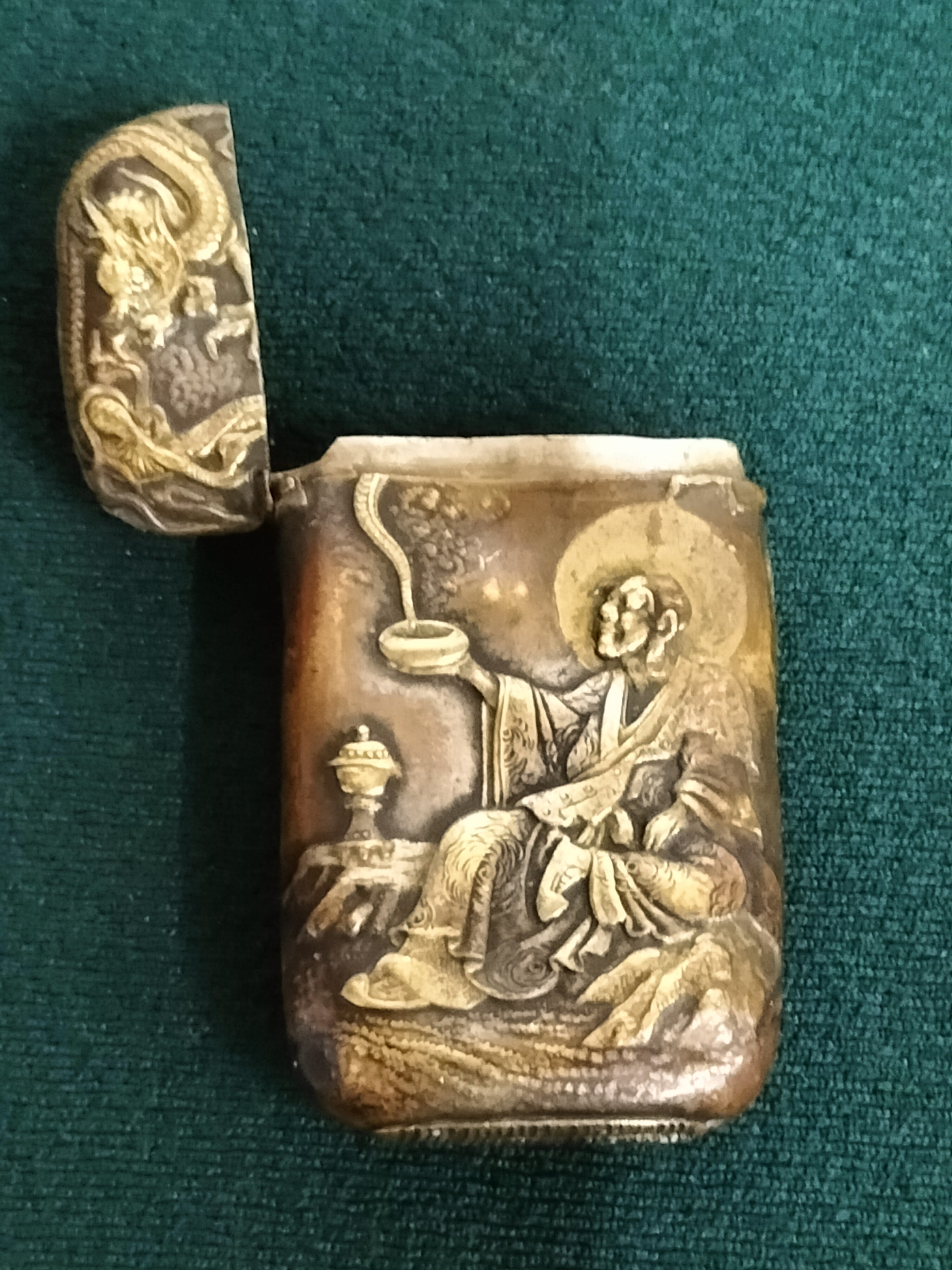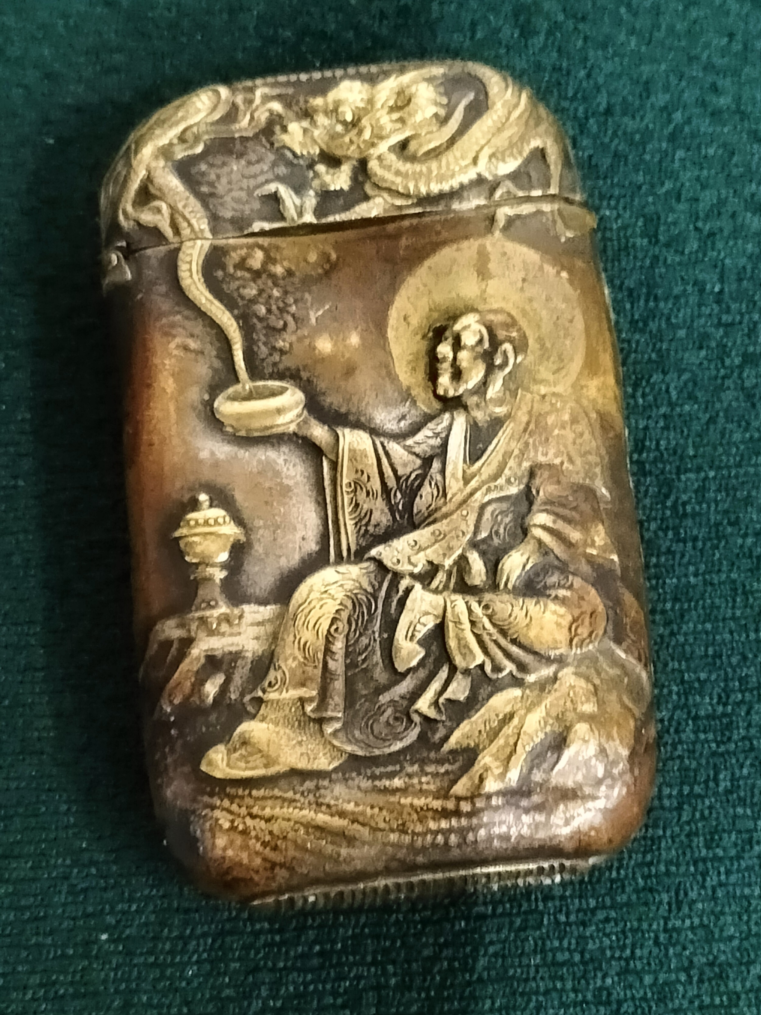 Japanese Meiji period vesta case Repoussé Samurai Bronze
