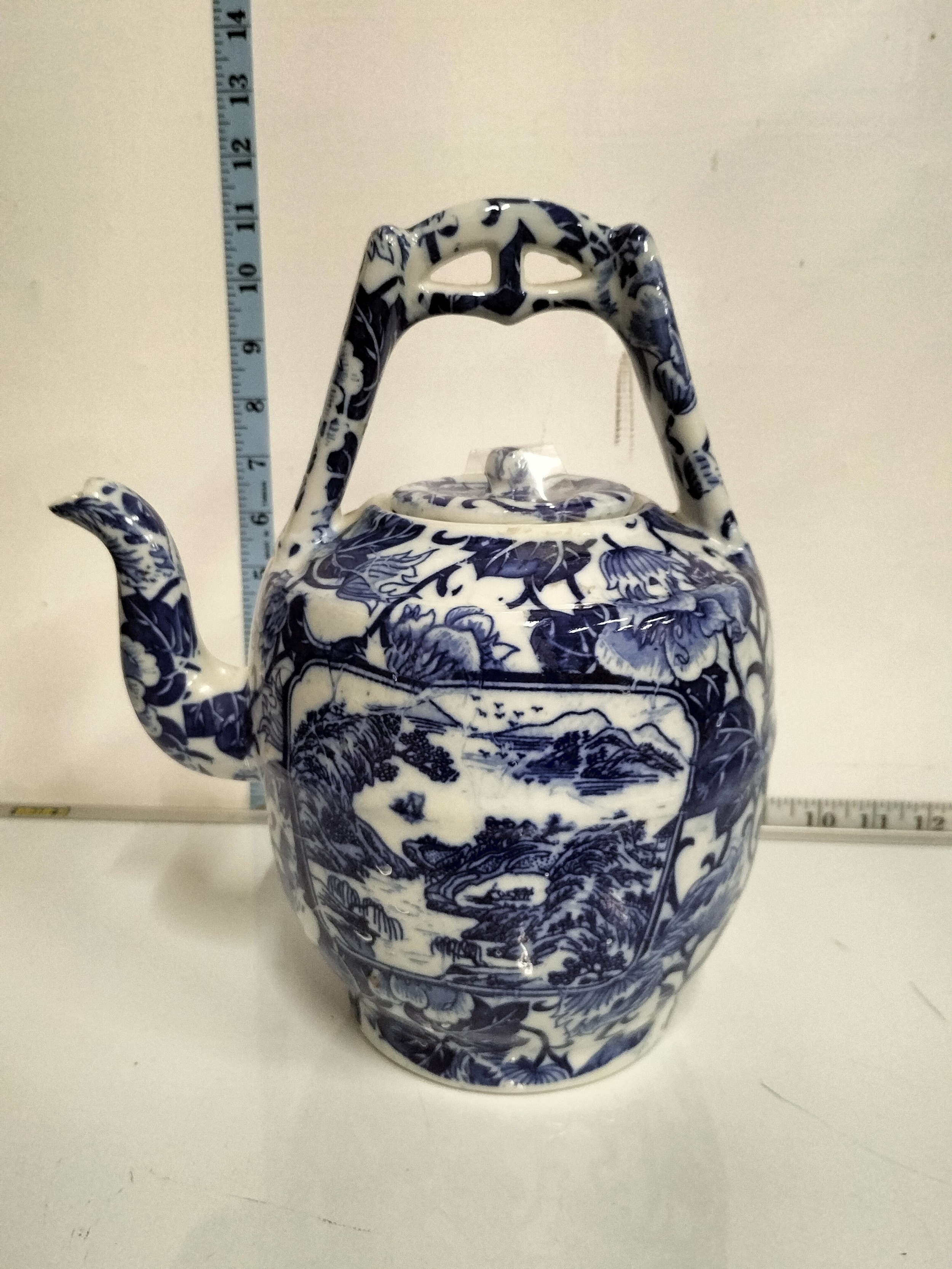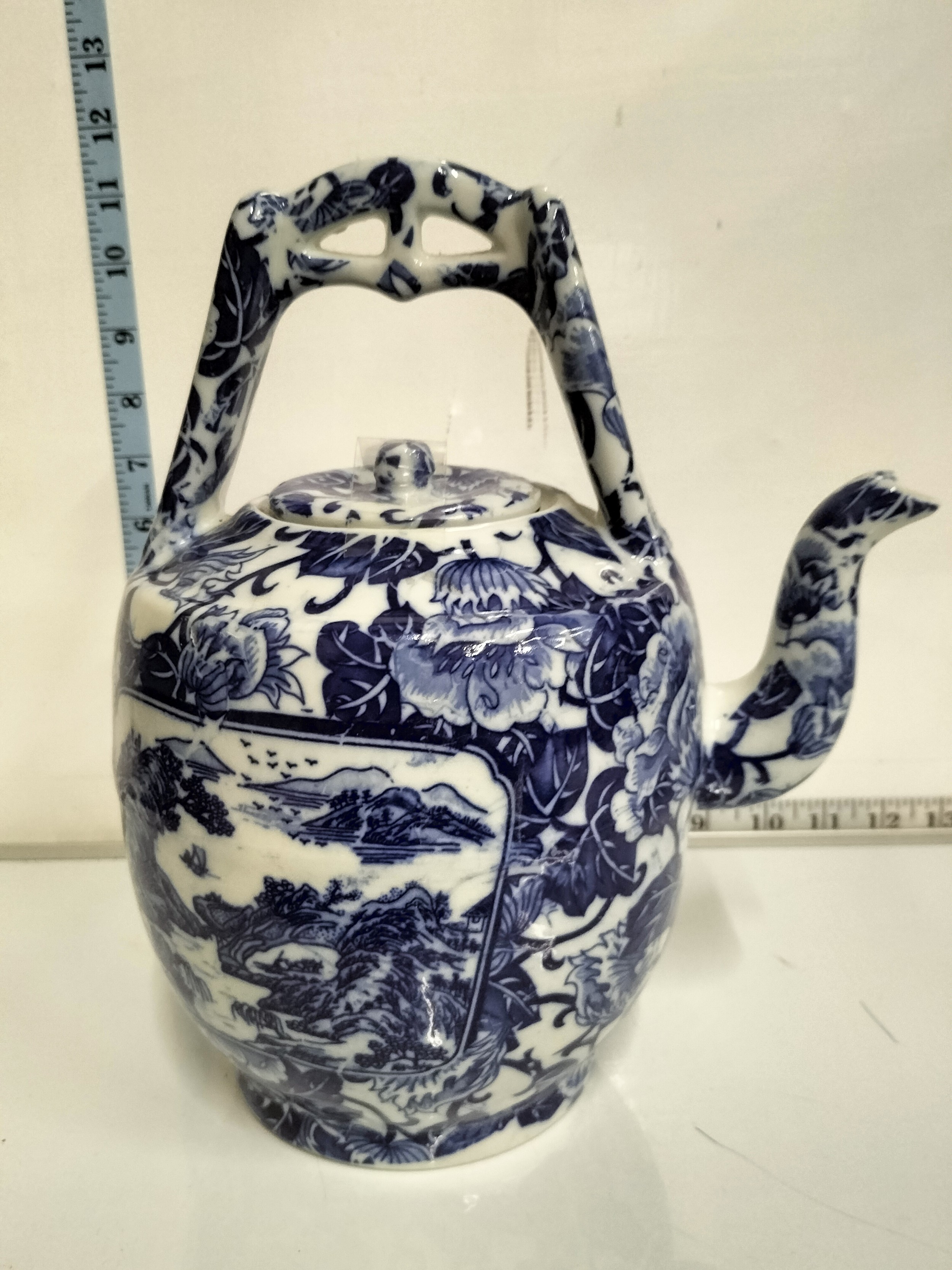 Large Chinese Blue and White Glazed Porcelain Landscape Scenery Teapot