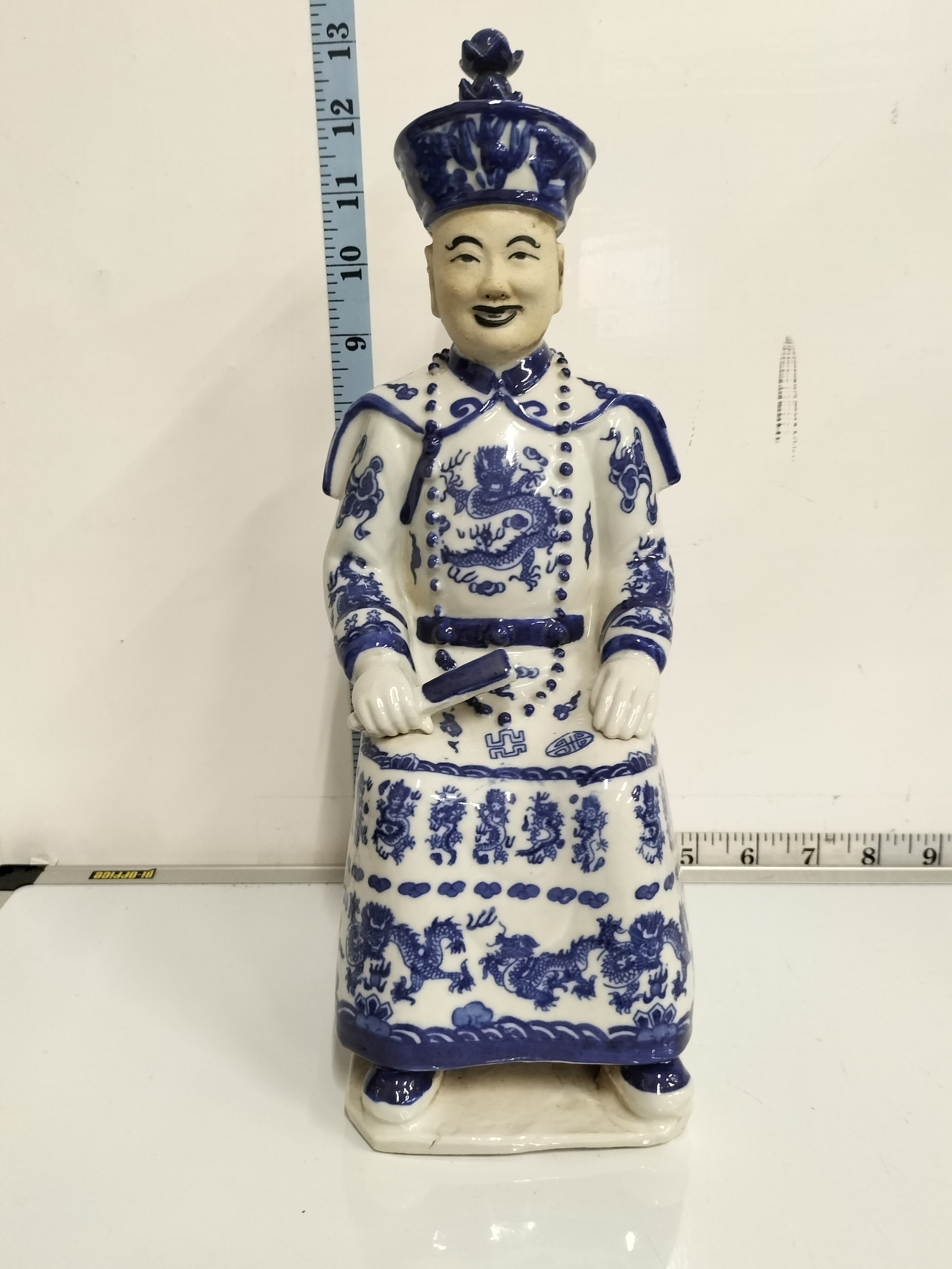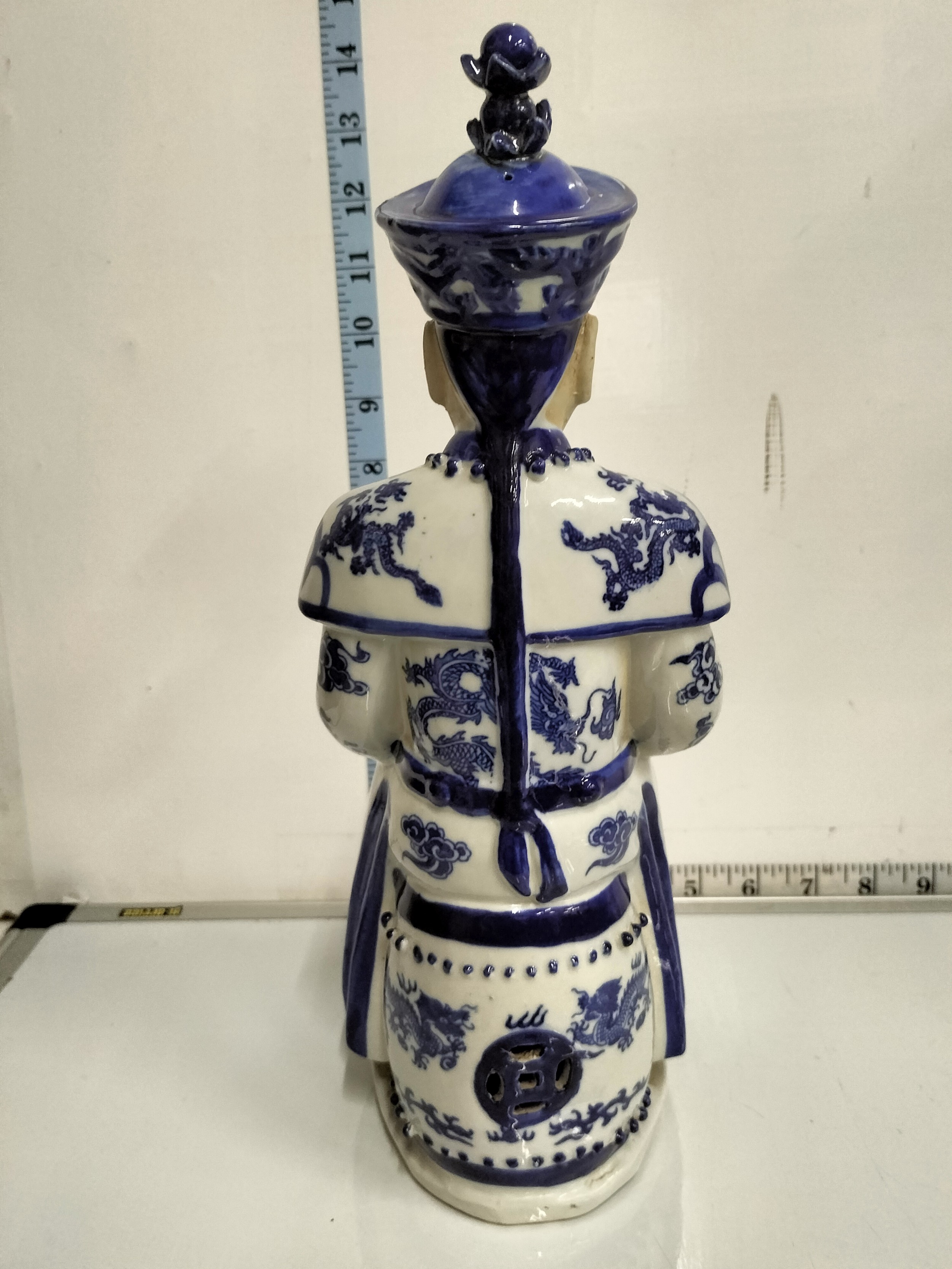 Vintage Chinese Emperor Figurine Blue and White Porcelain Statue Sitting