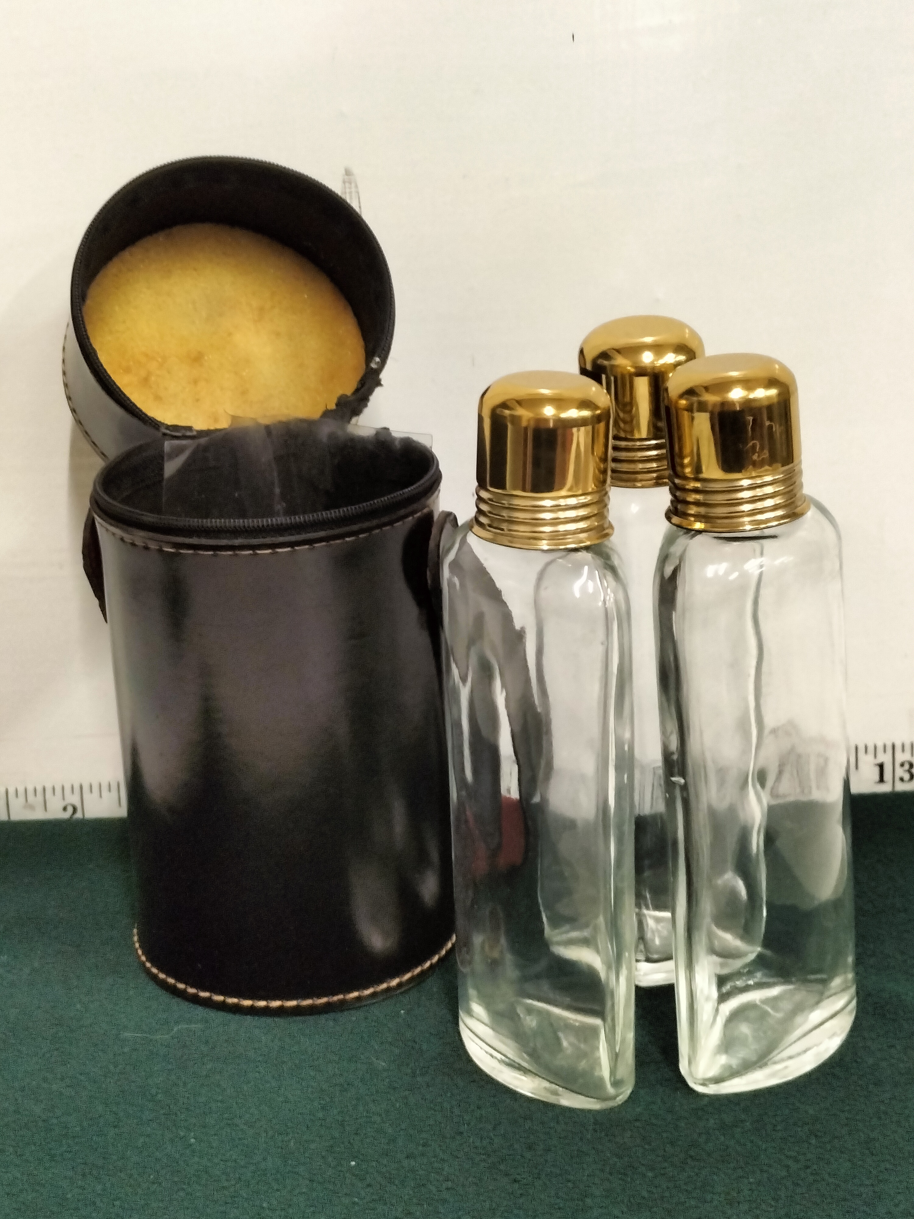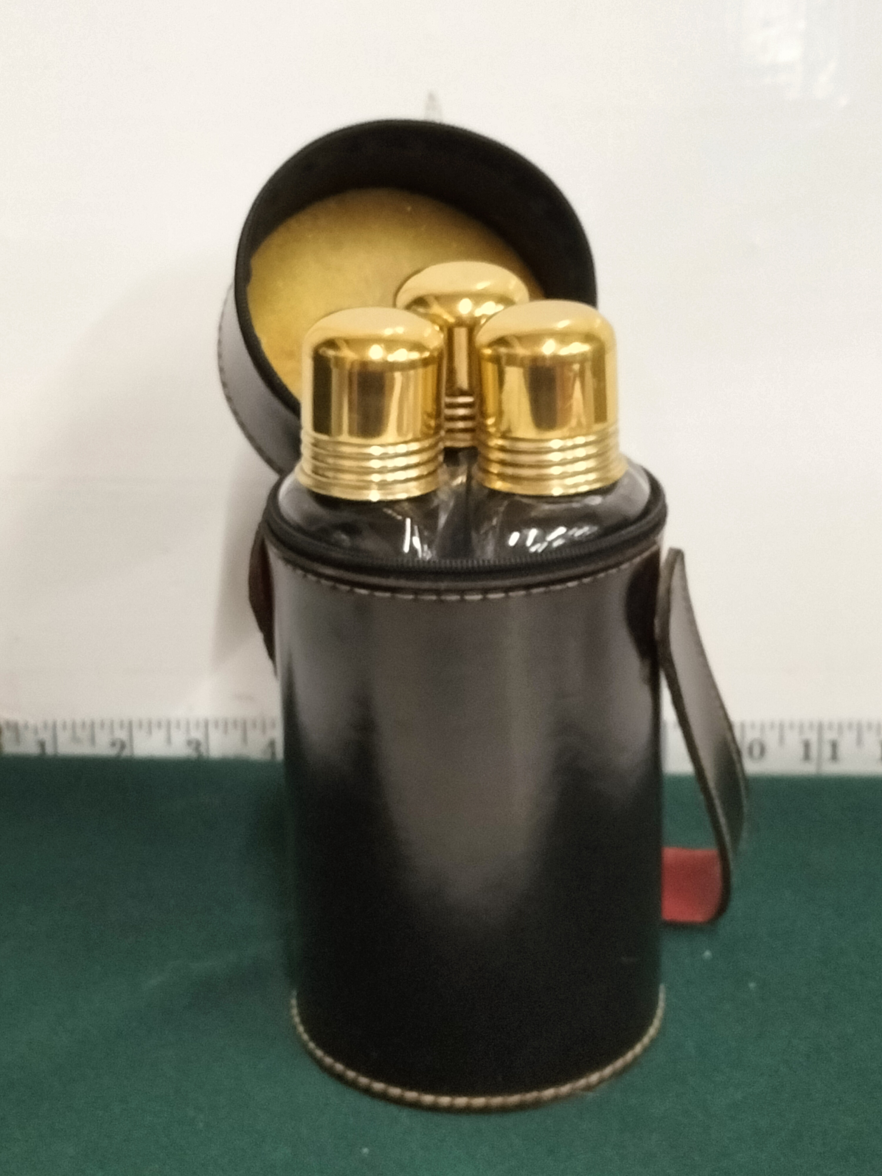 Travelling Flask set in Leather case, 3 Lidded Glass Bottles