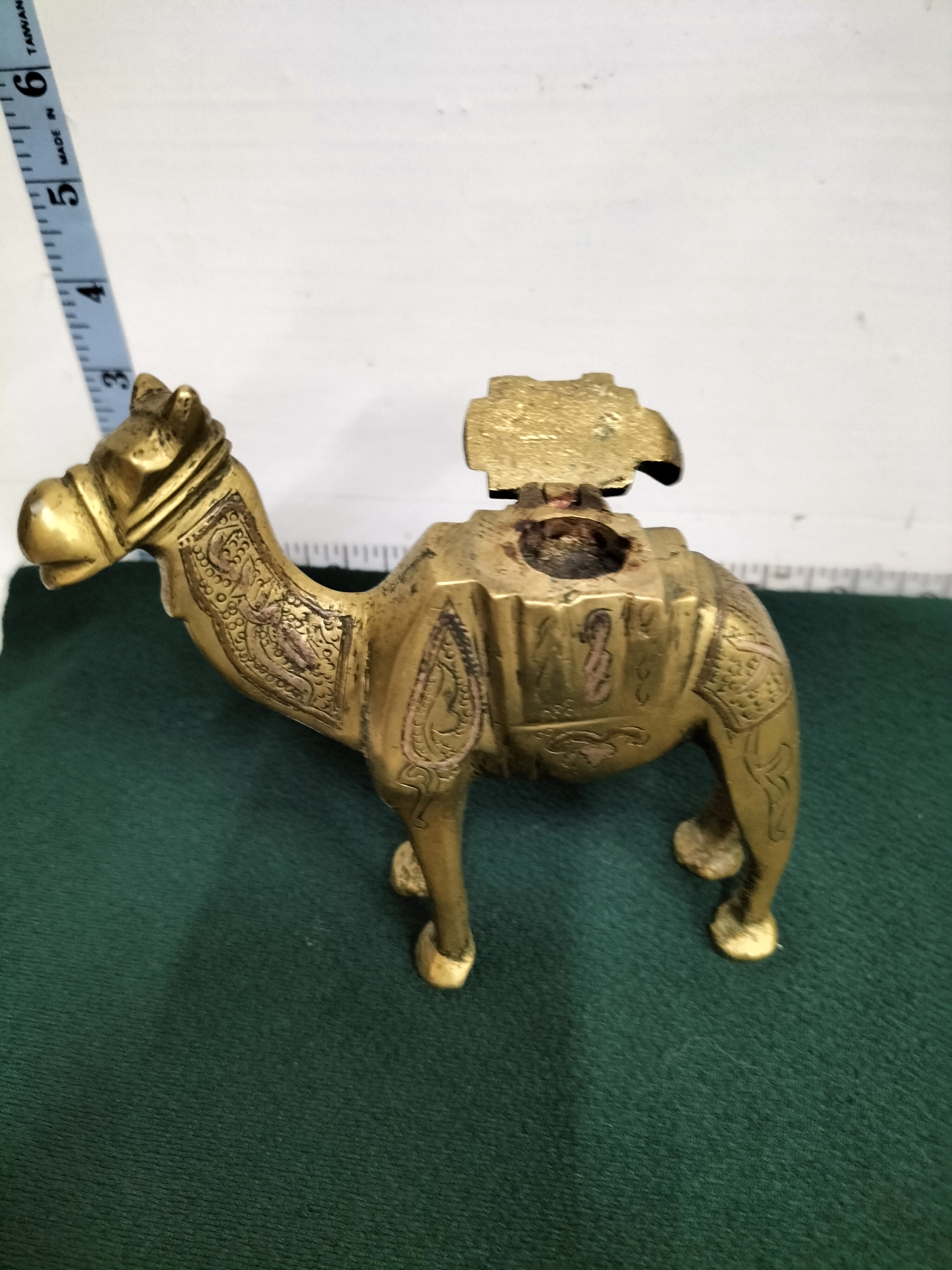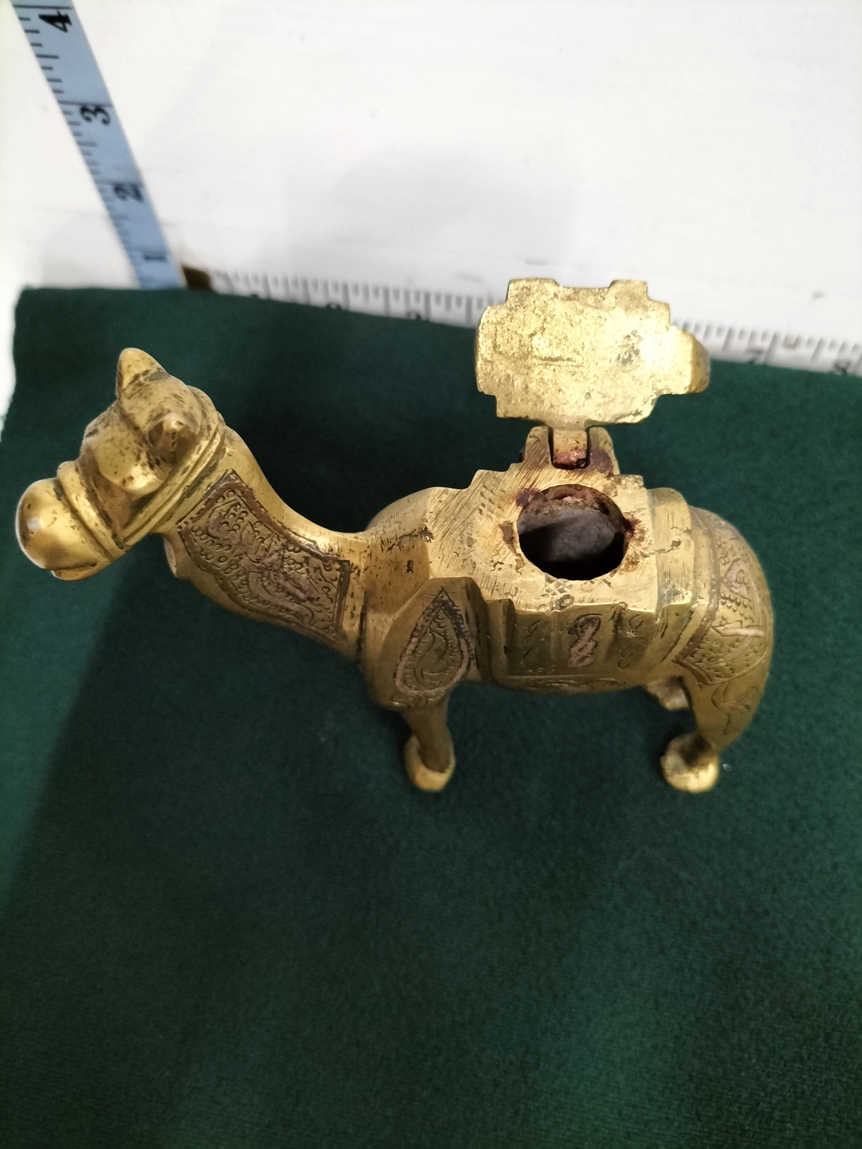 This cast brass figural inkwell is modelled as a standing dromedary camel, reflecting the Mamluk Revival style popular in the early 20th century. The piece is designed with a hinged saddle lid that opens to reveal a circular ink reservoir. The body is extensively decorated with hand-chased and engraved foliate and scrollwork patterns, particularly prominent along the neck, haunches, and saddlecloth. The brass exhibits a deep yellowish-gold tone with a natural aged patina. Such pieces were frequently produced in North Africa or the Middle East as high-quality desk accessories or Grand Tour souvenirs. No maker’s marks are present. Height: approximately 12.7 cm (5 inches).