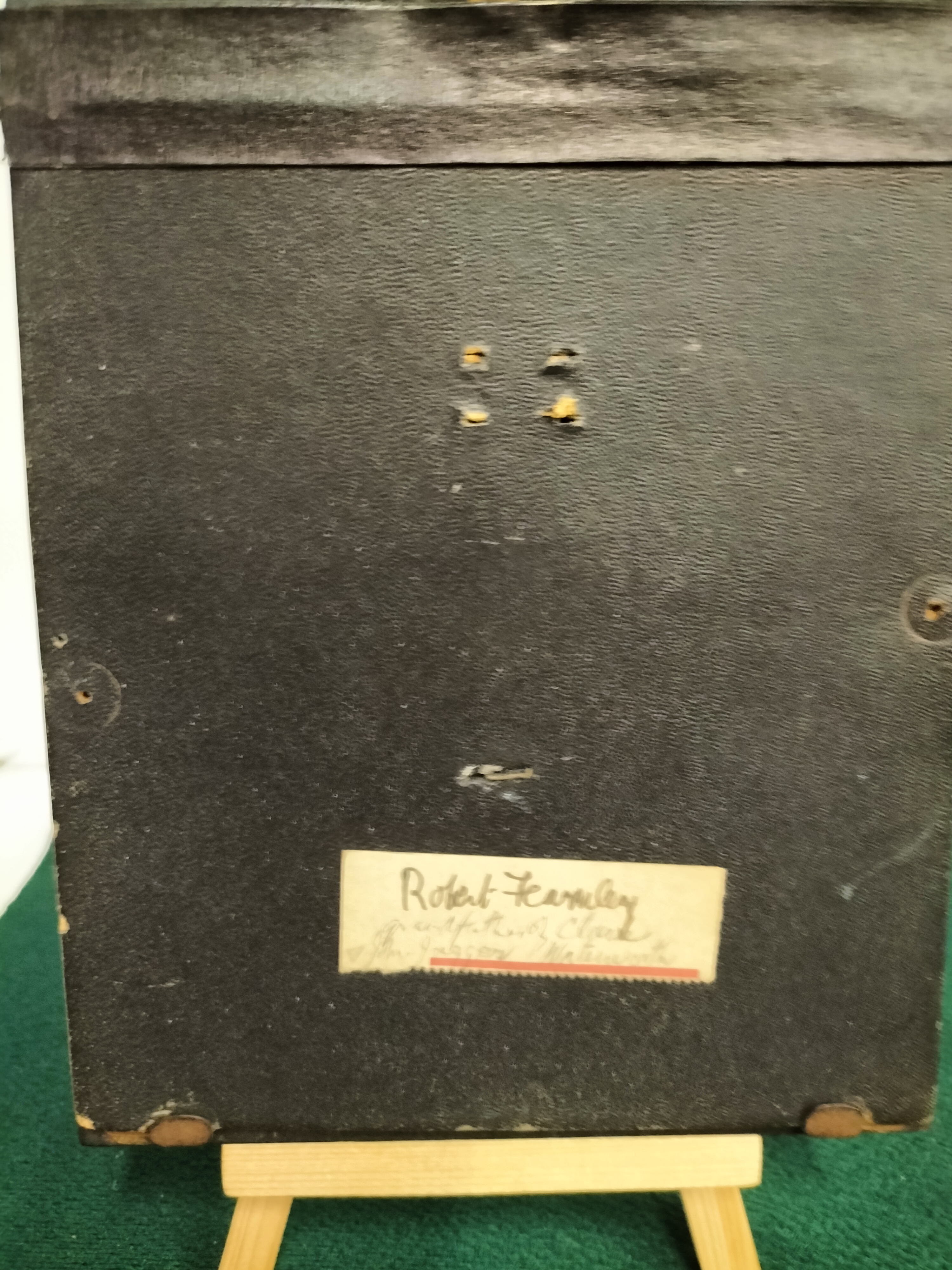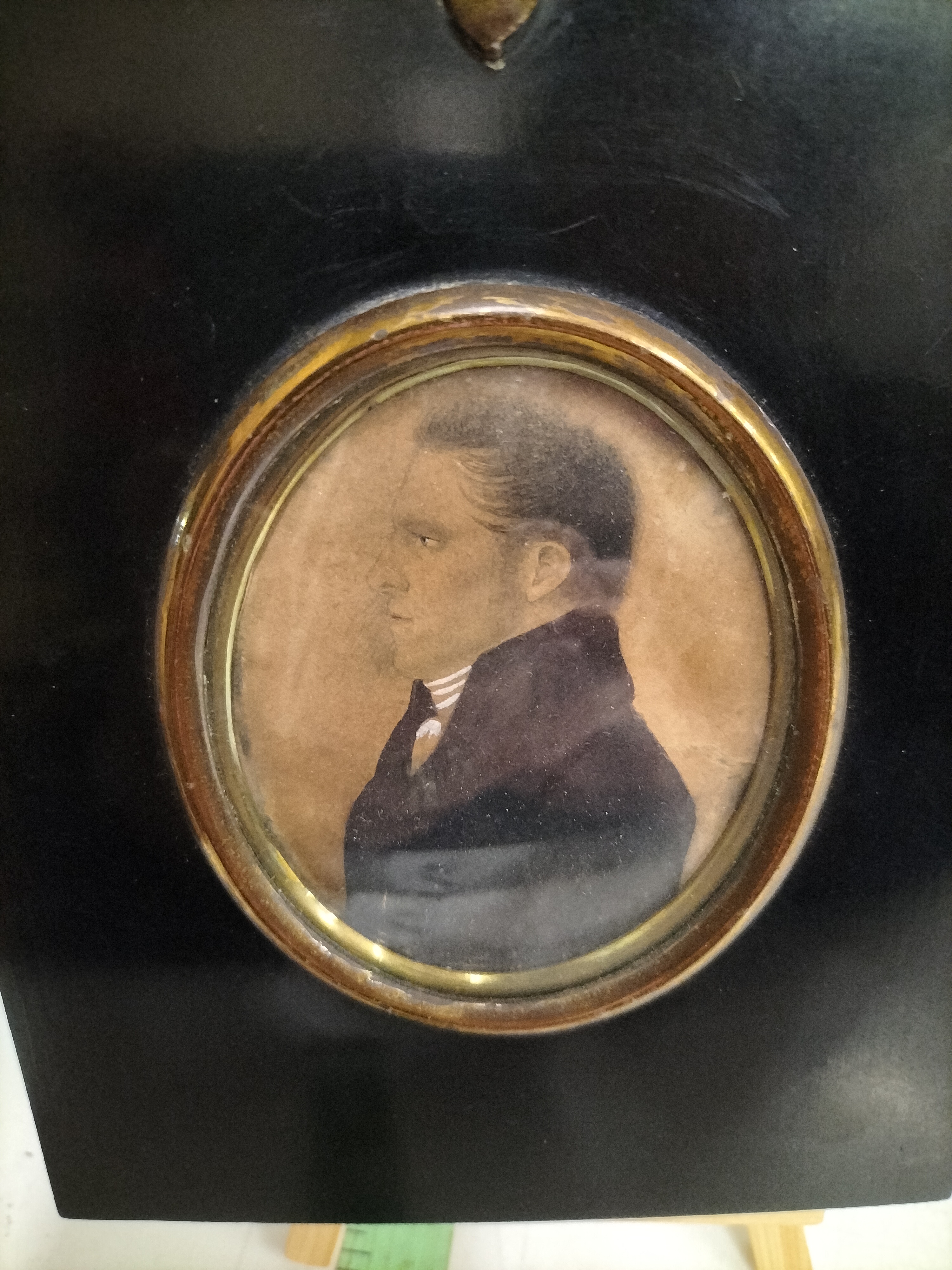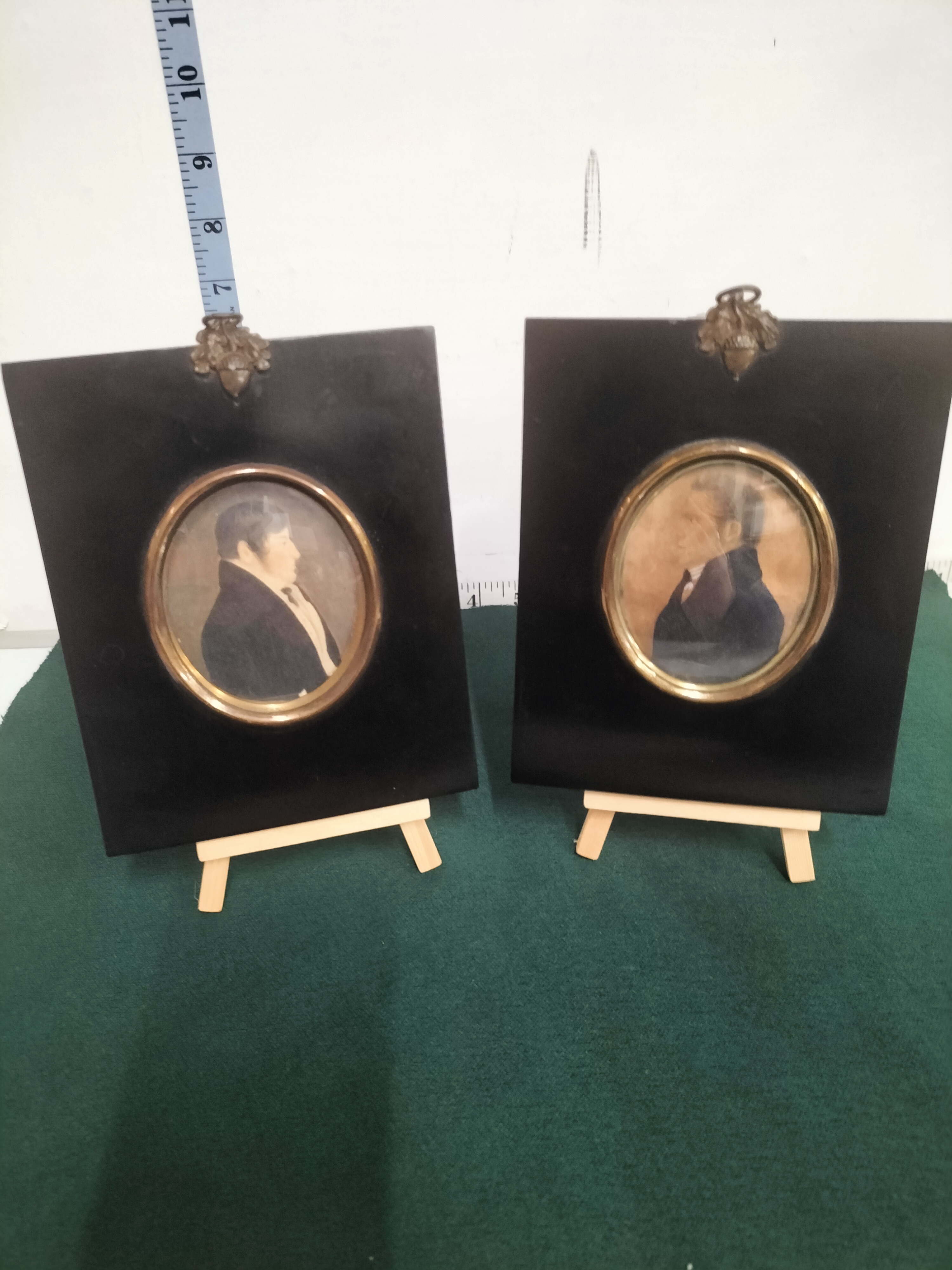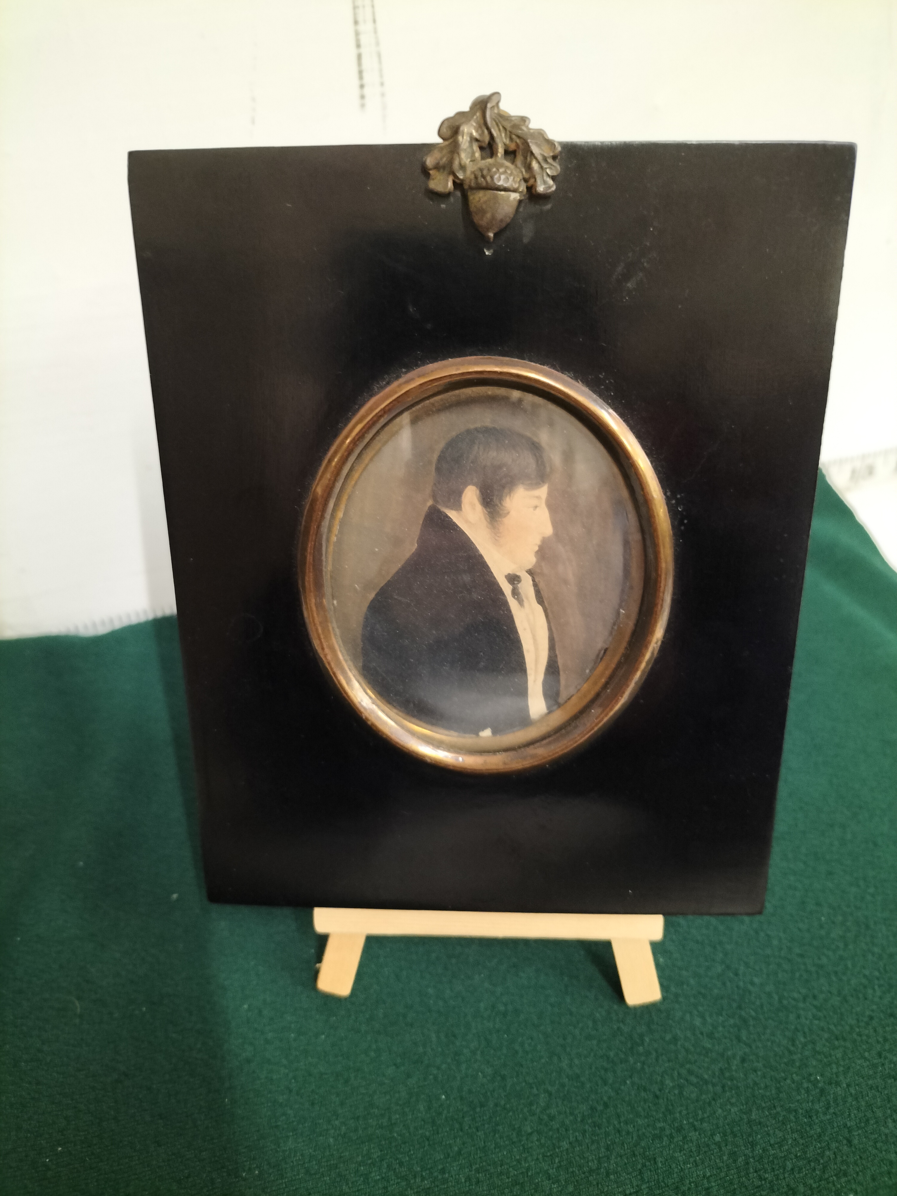 A pair of Georgian painted portrait miniatures on paper, circa 1815. Each depicts a gentleman in profile, rendered in watercolour and wearing Regency-period attire with high-collared coats and cravats. The portraits are set within oval gilt-metal bezels and housed in rectangular black lacquered or papier-mâché frames. Each frame features a cast metal hanger in the form of an acorn and oak leaves. The reverse of one frame retains a handwritten identification label that reads, Sam Fernnex and Robert Fearnley / grandfather of Clare / John Gregory Wadsworth.