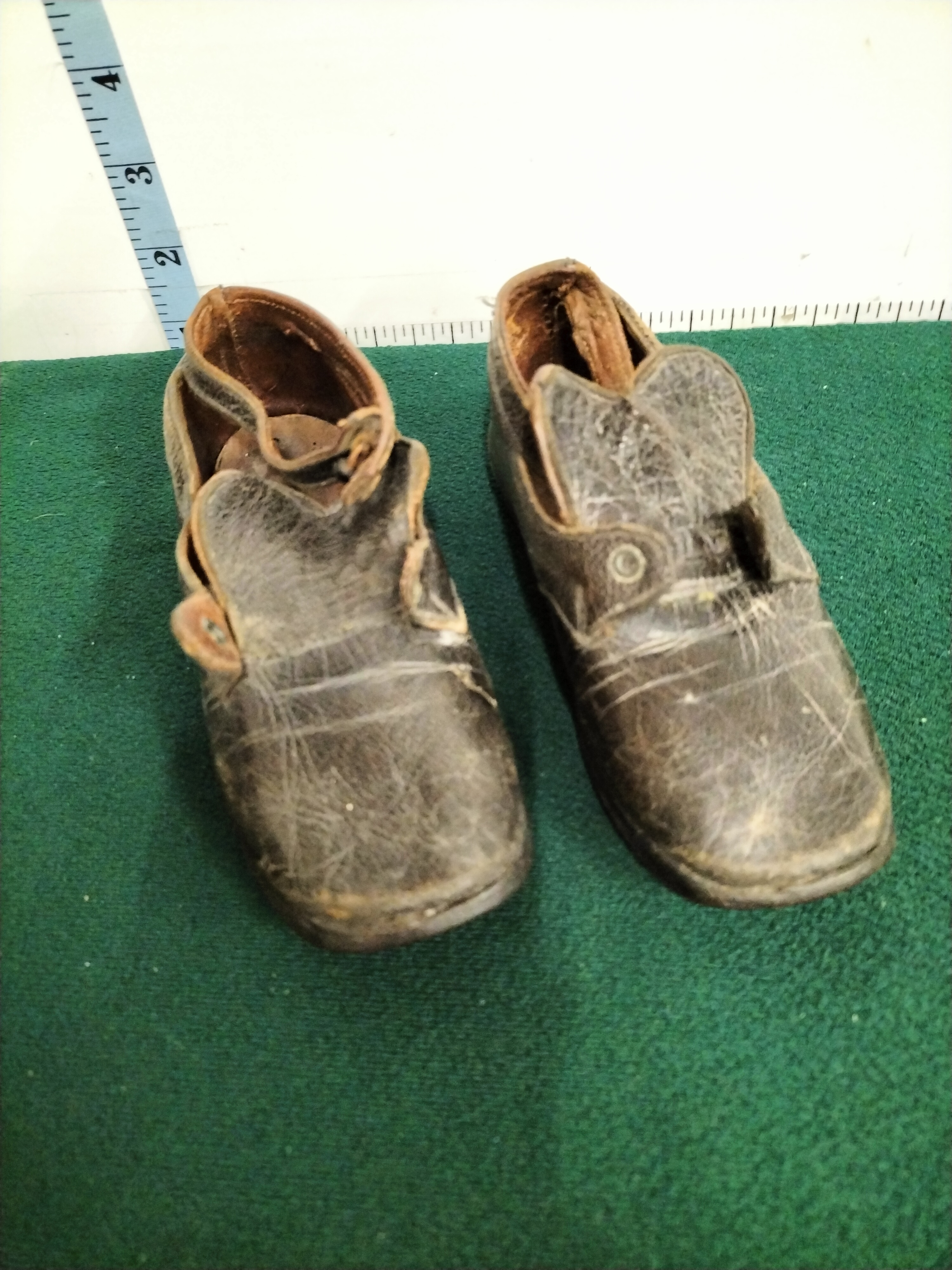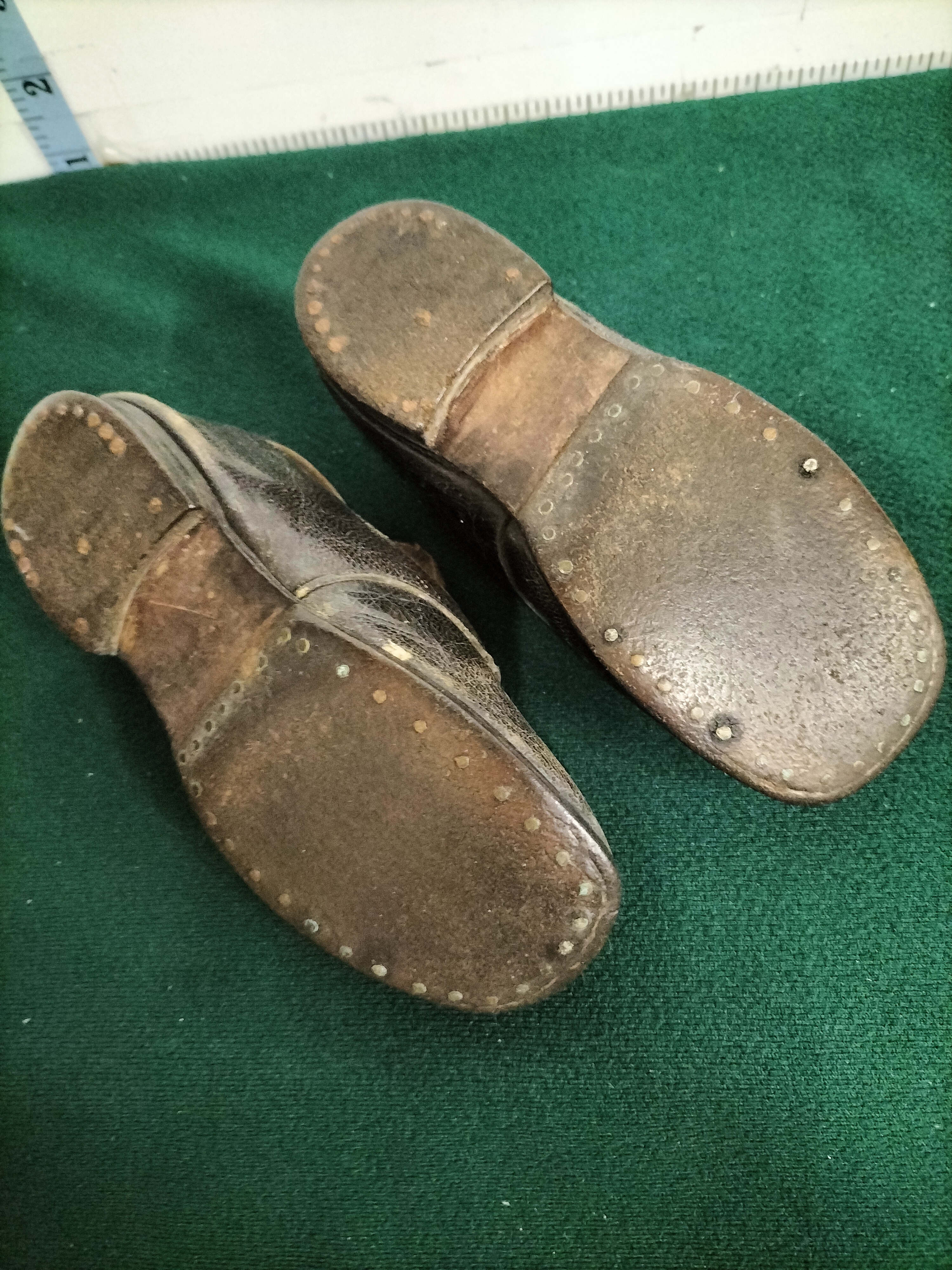 A pair of antique children’s shoes dating from the late 19th to early 20th century. These shoes are crafted from dark brown to black leather uppers with traditional leather outsoles. The construction features a distinctive row of small perimeter nails or pegs, characterised by footwear from this era. The design is a low-cut silhouette featuring a simple flap closure. There are no visible designer labels, brand markings, or size codes present. Authenticity not verified; sold as-is. Length: Approximately 4.5 inches (11.4 cm).