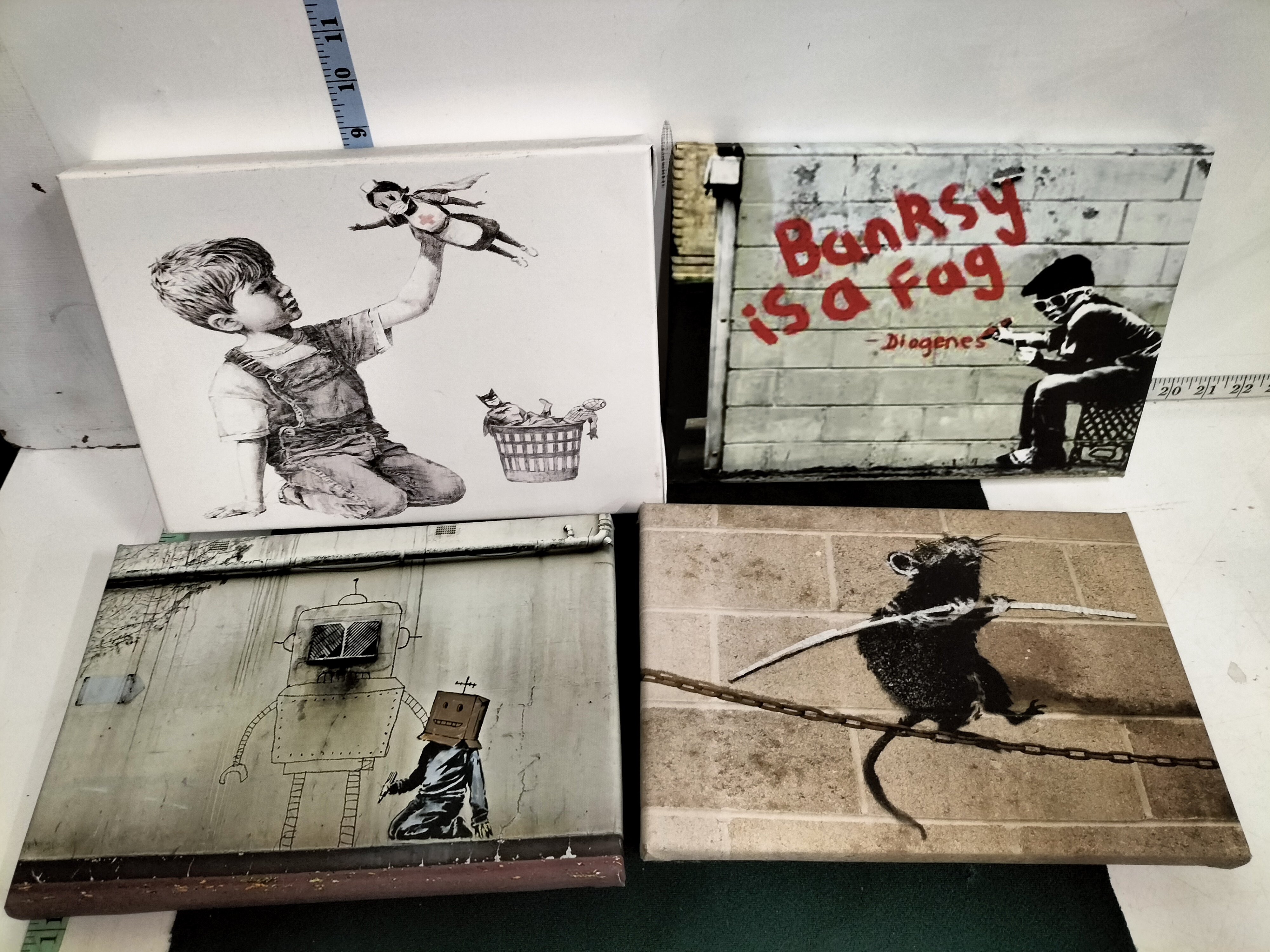 After Banksy, digital giclée prints on canvas. This lot features four urban street art motifs including the NHS tribute Game Changer, a child spray-painting Banksy is a fag – Diogenes, a boy painting a robot, and a rat on a tightrope. These are contemporary commercial reproductions and are not original limited editions or works authorised by the artist’s studio. The prints are unsigned and unnumbered, with no publisher or printer stamps present. Each canvas is gallery-wrapped over wooden stretcher bars. Provenance: Private collection. Dimensions: Each approximately 20.3 x 30.5 cm.