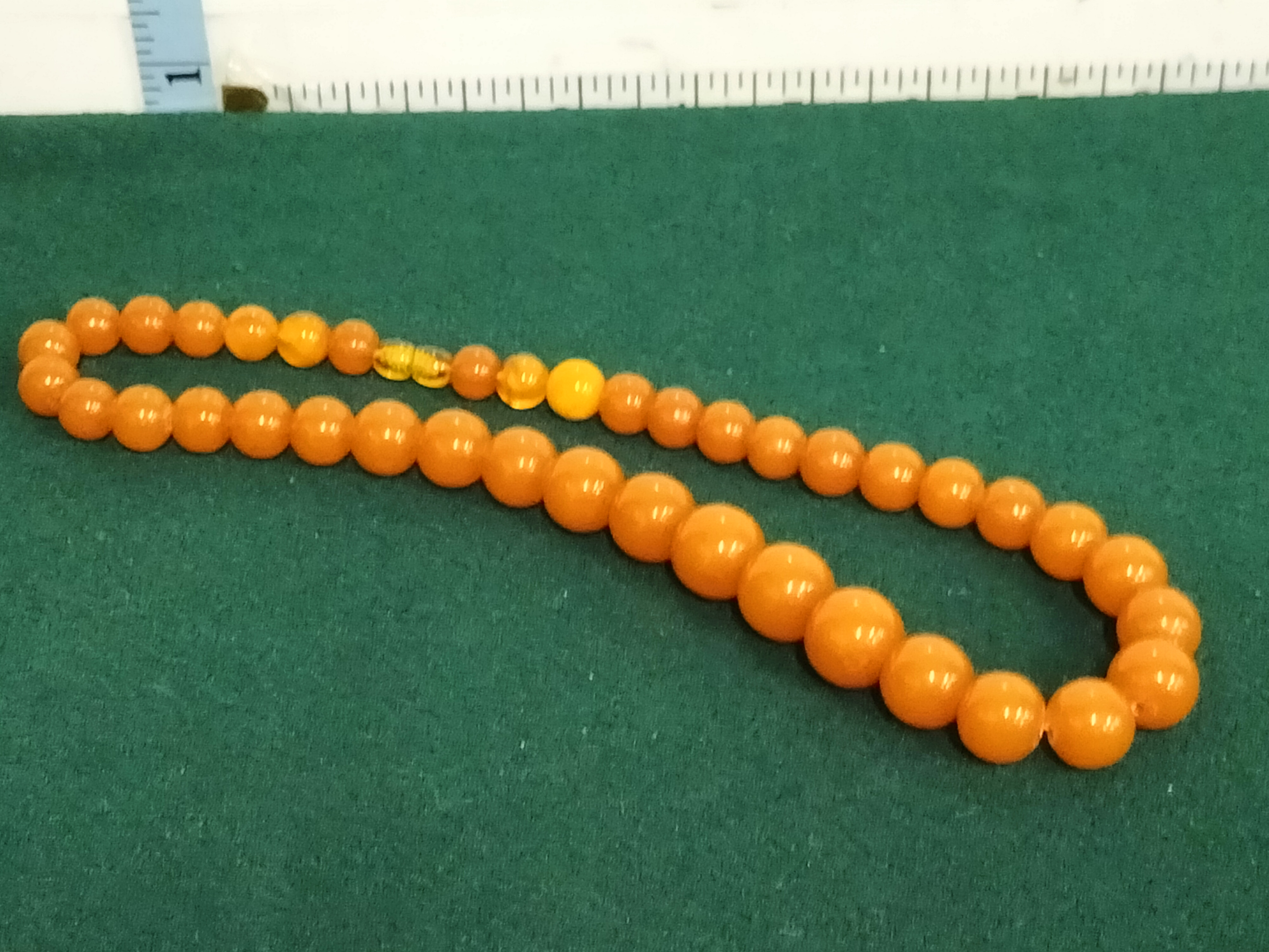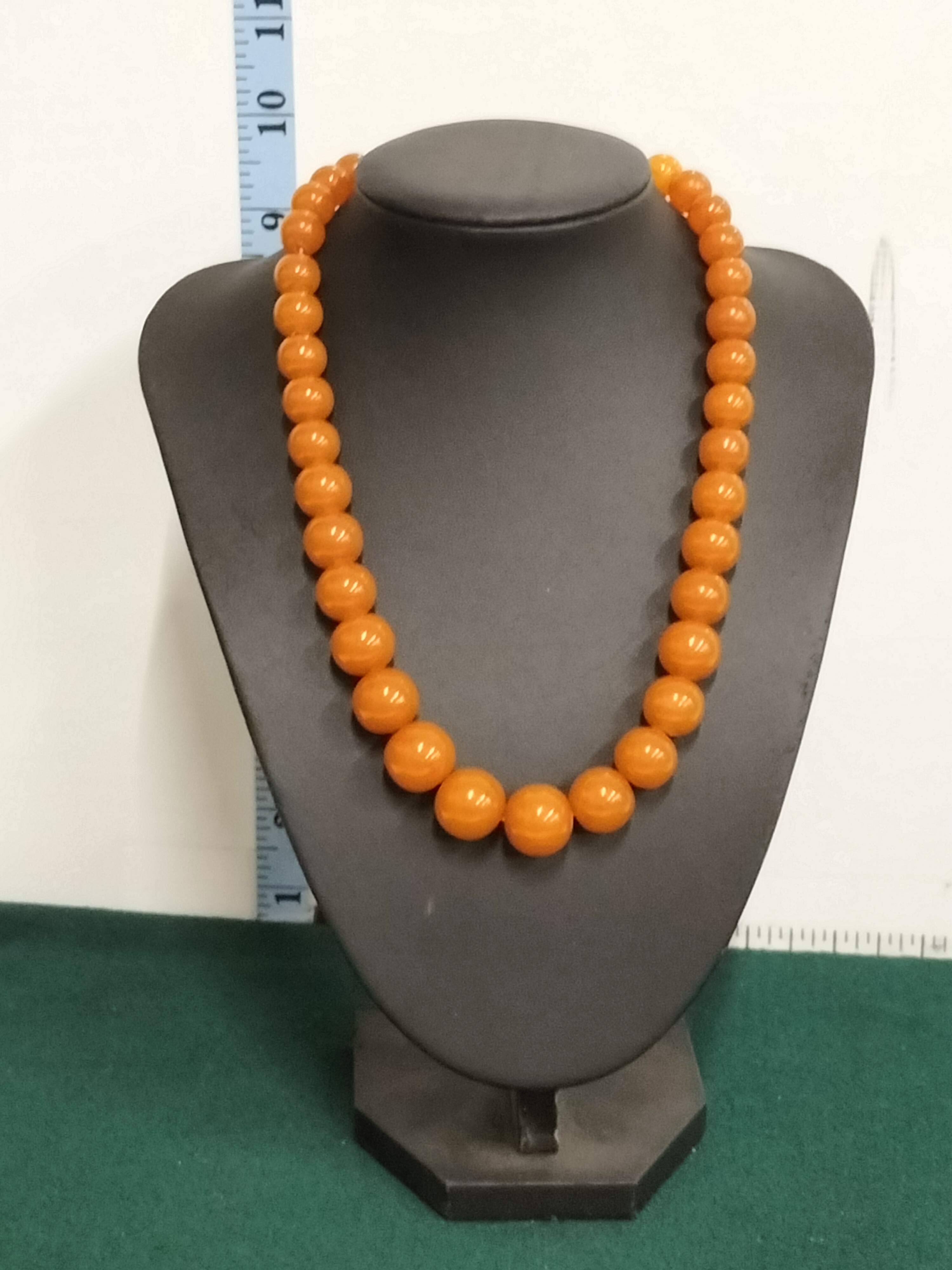 This vintage necklace, reflecting the Art Deco period, comprises a single strand of graduated round beads that appear to be butterscotch or egg yolk Baltic amber. The beads possess a vibrant, opaque orange-yellow colour and a high-lustre polished finish. The strand increases in diameter towards the centre and is fastened with a concealed screw-type clasp constructed from the same resinous material. No metal hallmarks are present. Length approximately 18 to 20 inches.