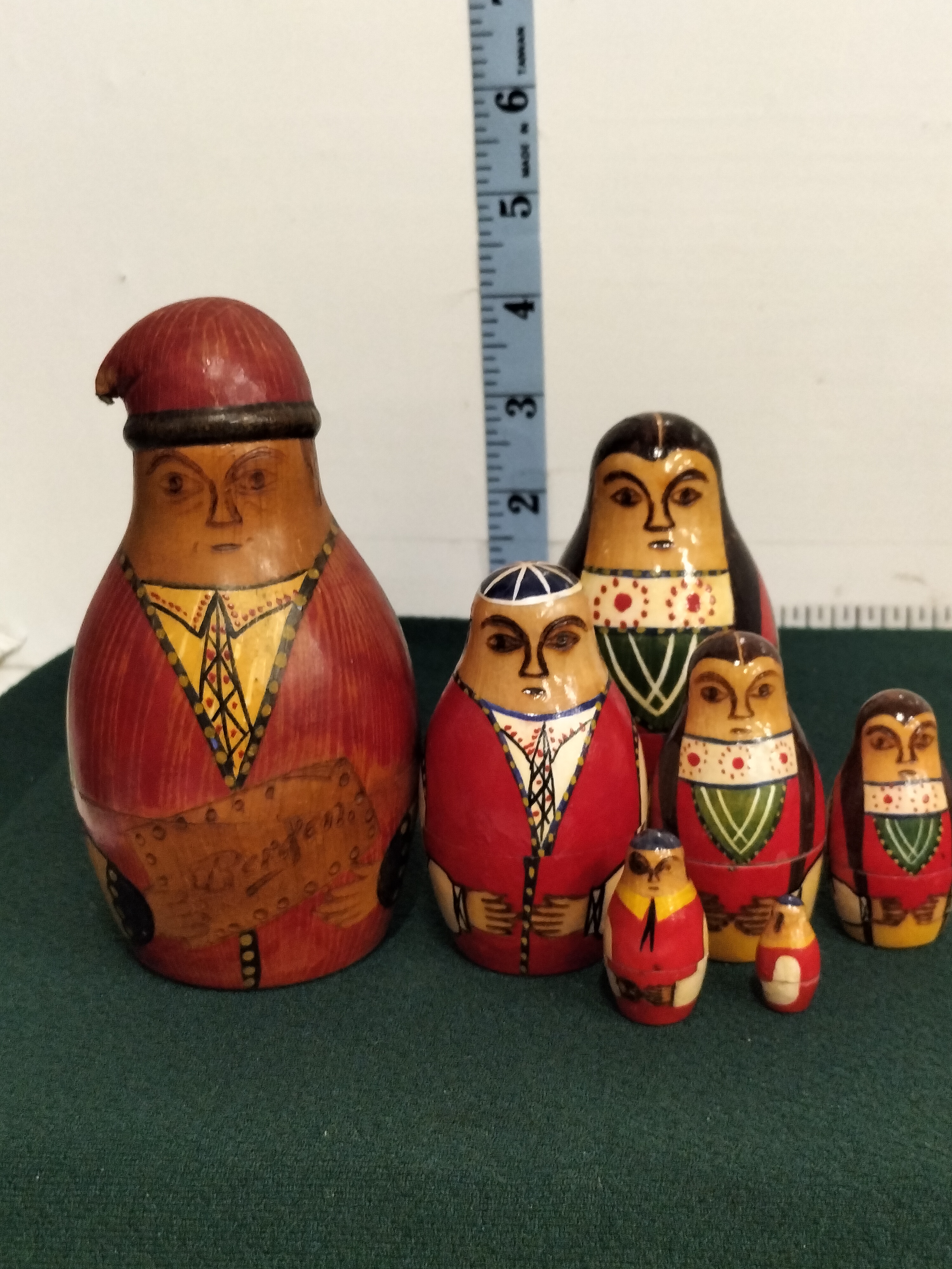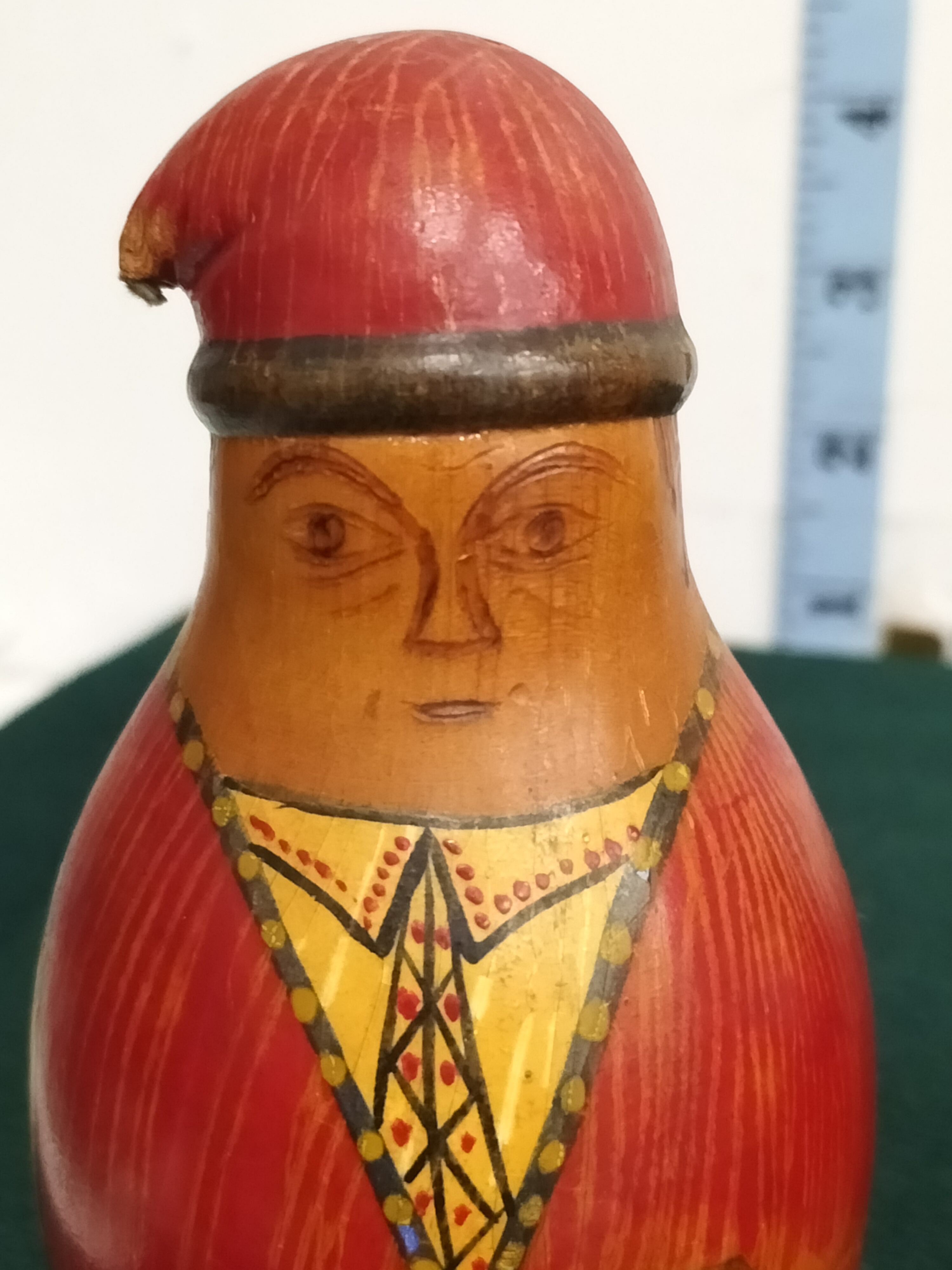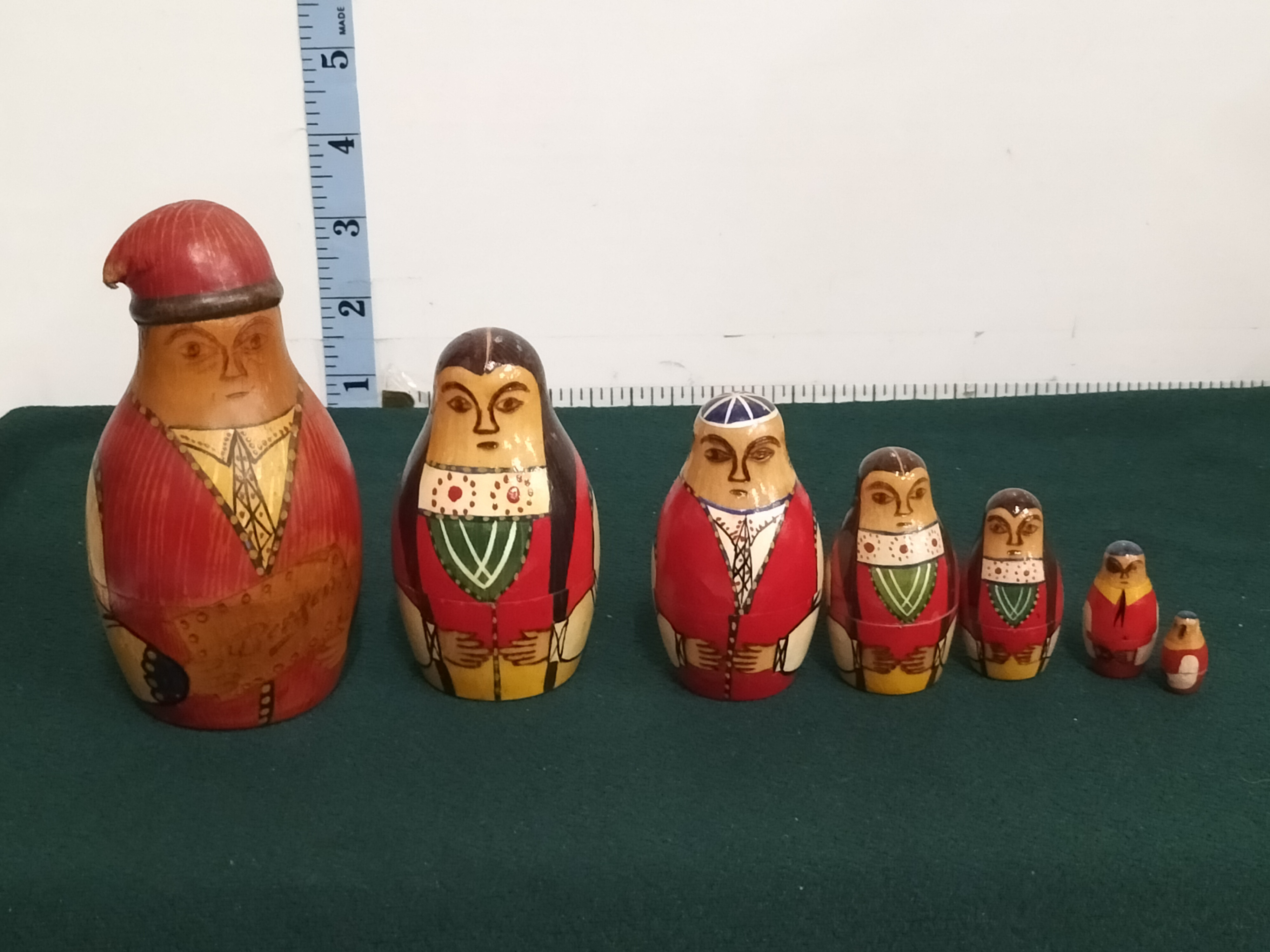 Produced as a Norwegian folk art souvenir, this set consists of seven hand-painted nesting dolls crafted from turned wood. The figures feature a classic nesting mechanism where the two halves pull apart to reveal the next doll. No original box is present. The set dates from the mid-20th century and depicts figures in traditional Bunad attire, with the largest doll representing a figure from Bergen holding a commemorative plaque.