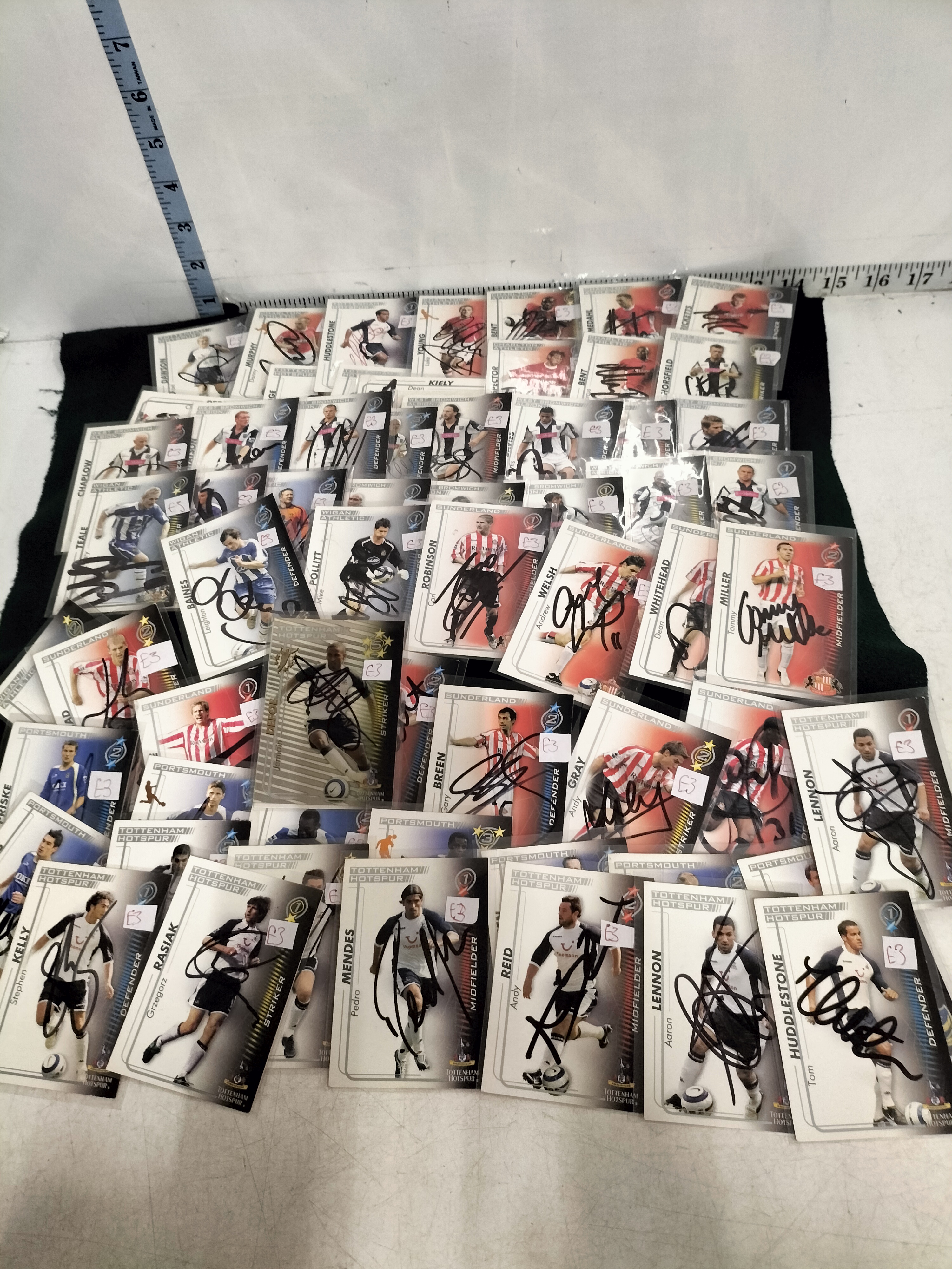 Brand: Merlin (Topps). Year: 2005-06. Set: Premiership. This collection features approximately 50 base cards from the 2005-06 season, the majority of which have been hand-signed in black permanent marker. Key players featured in this lot include Aaron Lennon (Rookie Card), Leighton Baines (Rookie Card), Tom Huddlestone (Rookie Card), Andy Reid, Pedro Mendes, Grzegorz Rasiak, Stephen Kelly, Dean Whitehead, Tommy Miller, Andrew Welsh, Gary Breen, Andy Gray, and Mike Pollitt. These are aftermarket hand-signatures and have not been third-party authenticated.