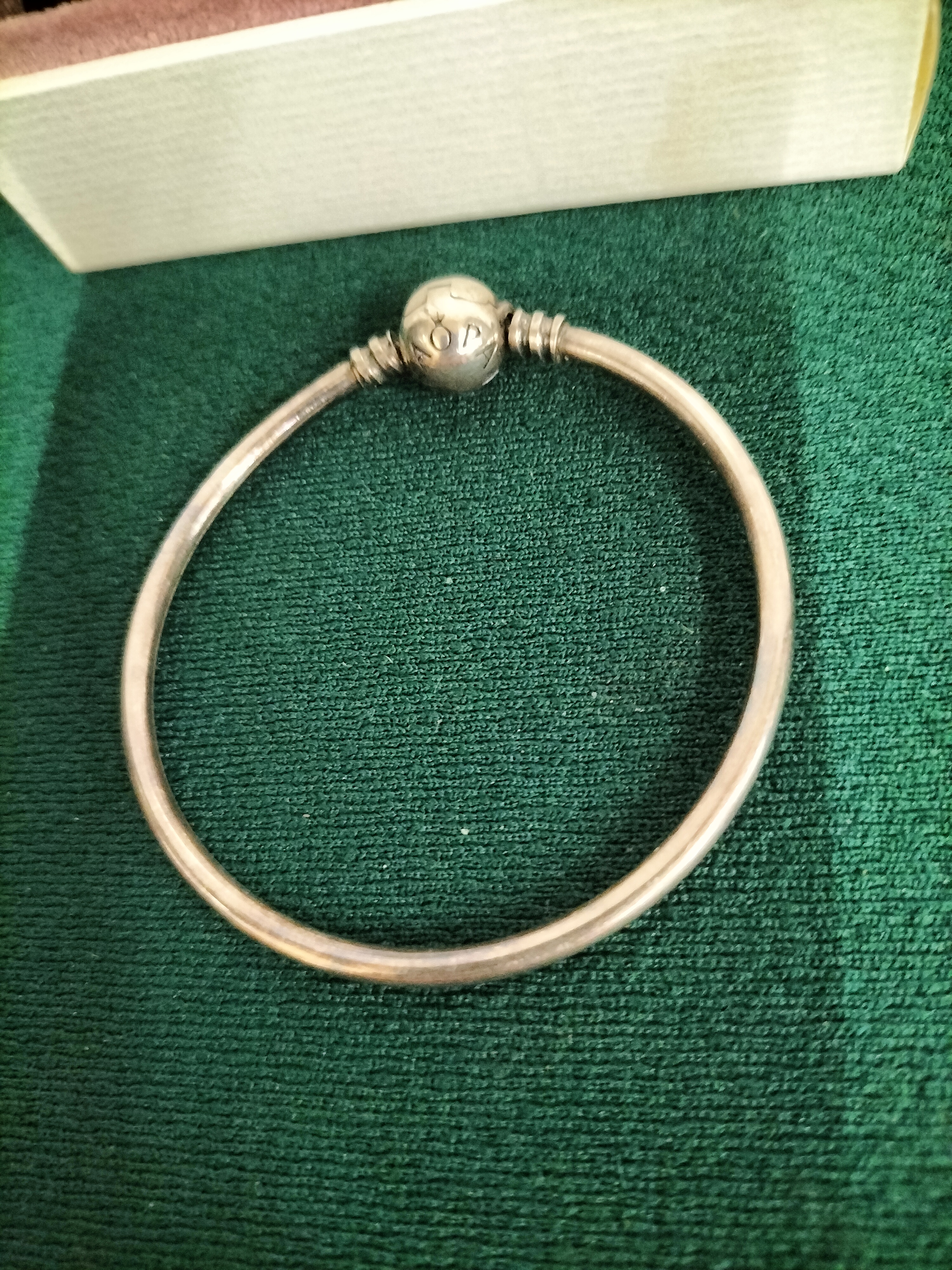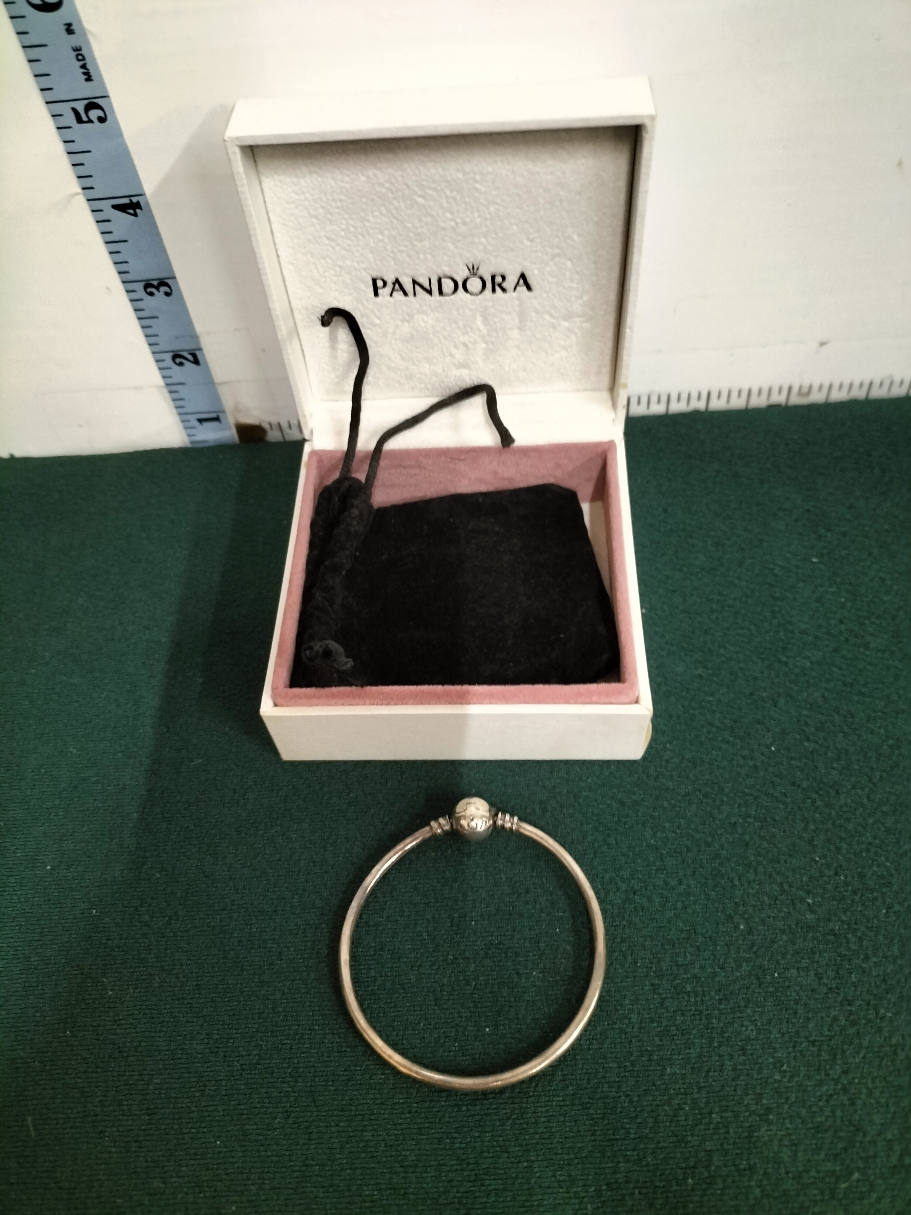 A silver rigid bangle by the designer Pandora. The piece features a signature ball-shaped snap clasp and two threaded sections intended for charms. The clasp is engraved with the PANDORA brand name and the hallmark crowned O logo. While typical for this brand, no specific metal purity hallmarks were observed in the provided images. The item is accompanied by an original white Pandora presentation jewellery box with a pink interior and a black velvet-style drawstring storage pouch. Interior diameter: Approximately 2.5 inches. Weight: Not determined.
