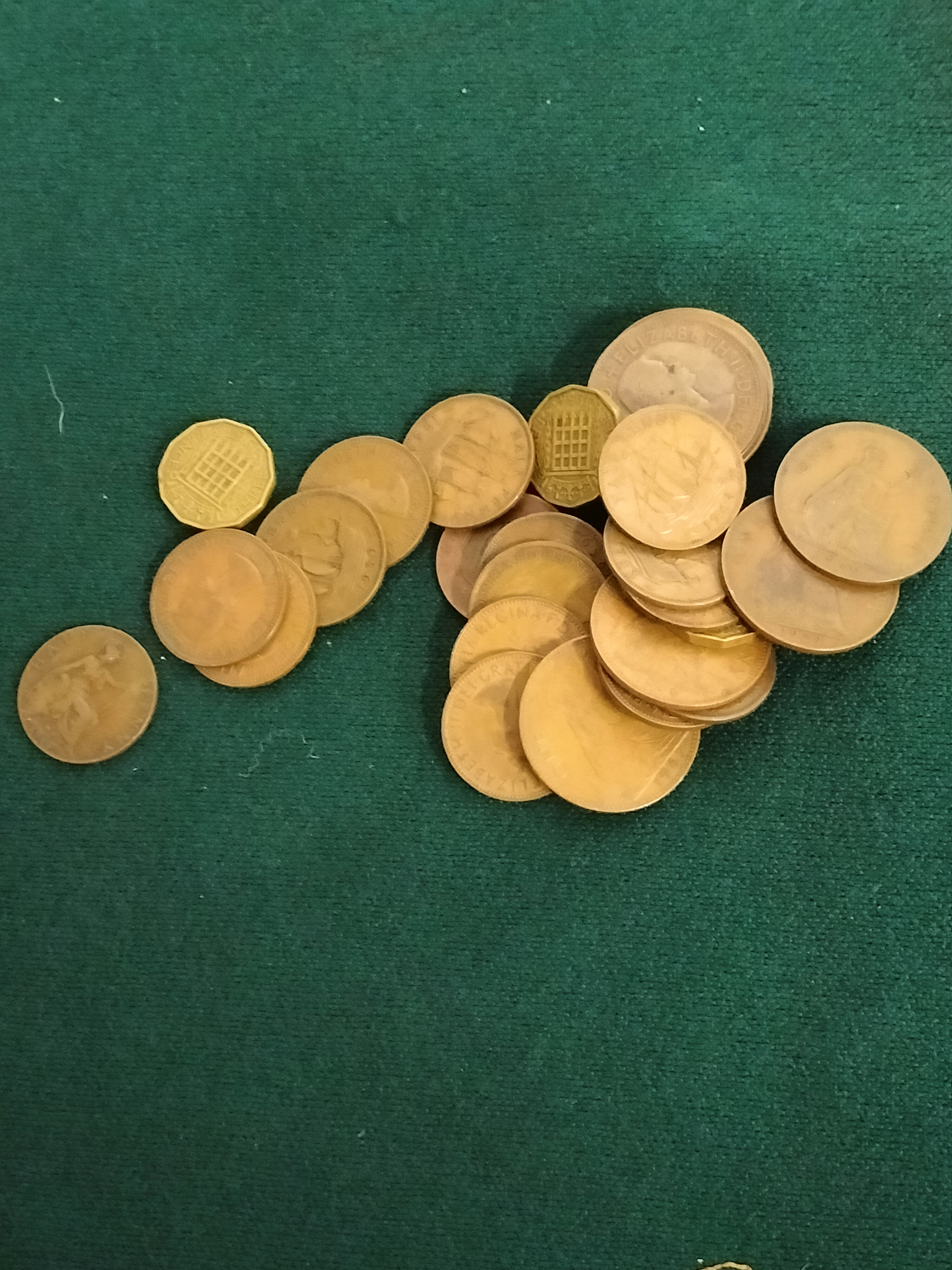 A Lot of UK coinage comprising pennies, halfpennies, and twelve-sided threepence denominations. The group includes issues from the reigns of King George VI and Queen Elizabeth II. Design types include Britannia reverse, Golden Hind reverse, and Crowned Portcullis reverse. Catalog references include KM# 844, KM# 845, KM# 849, KM# 896, KM# 897, and KM# 900. These coins represent the final decades of the British pre-decimalisation currency system.