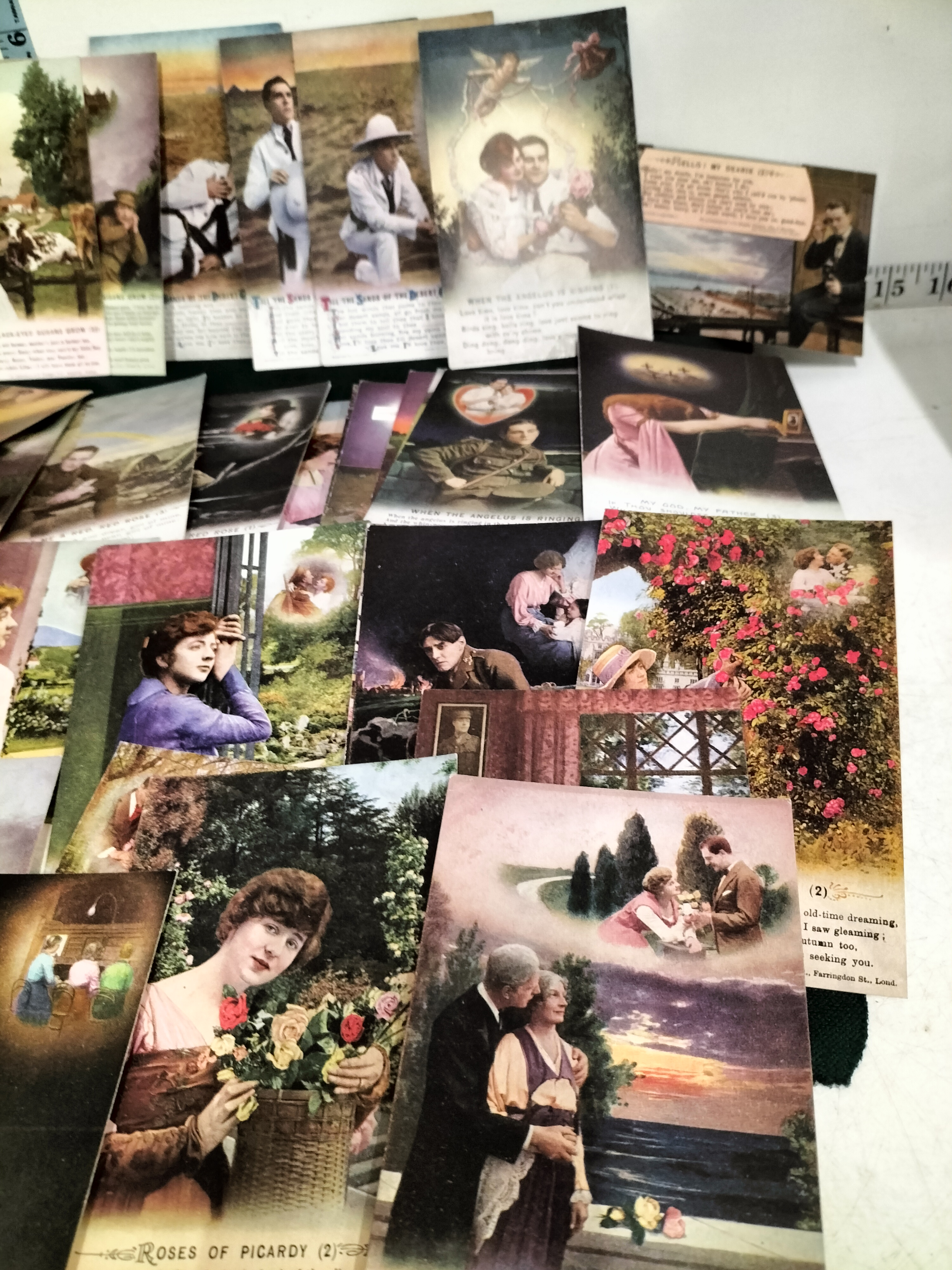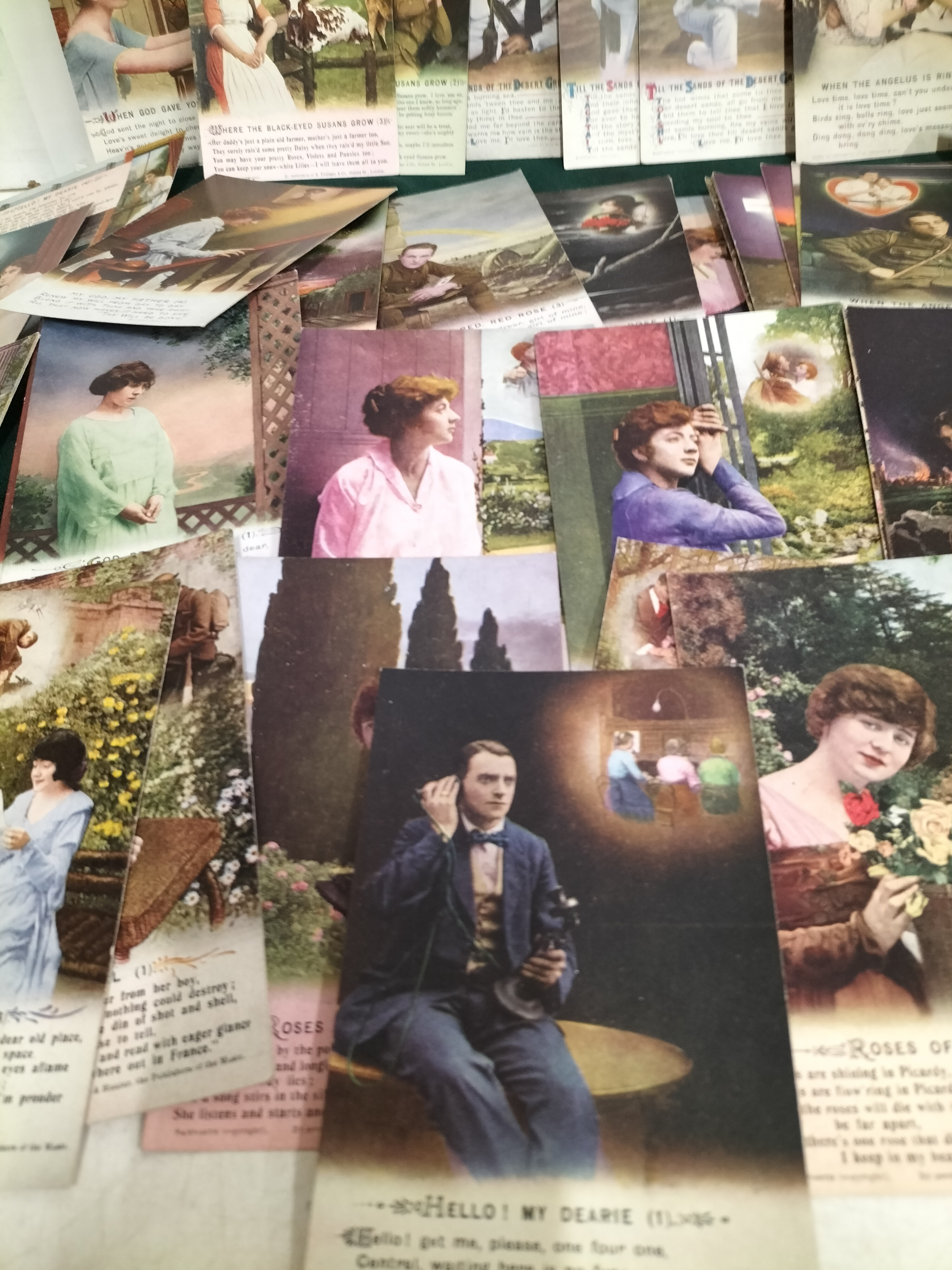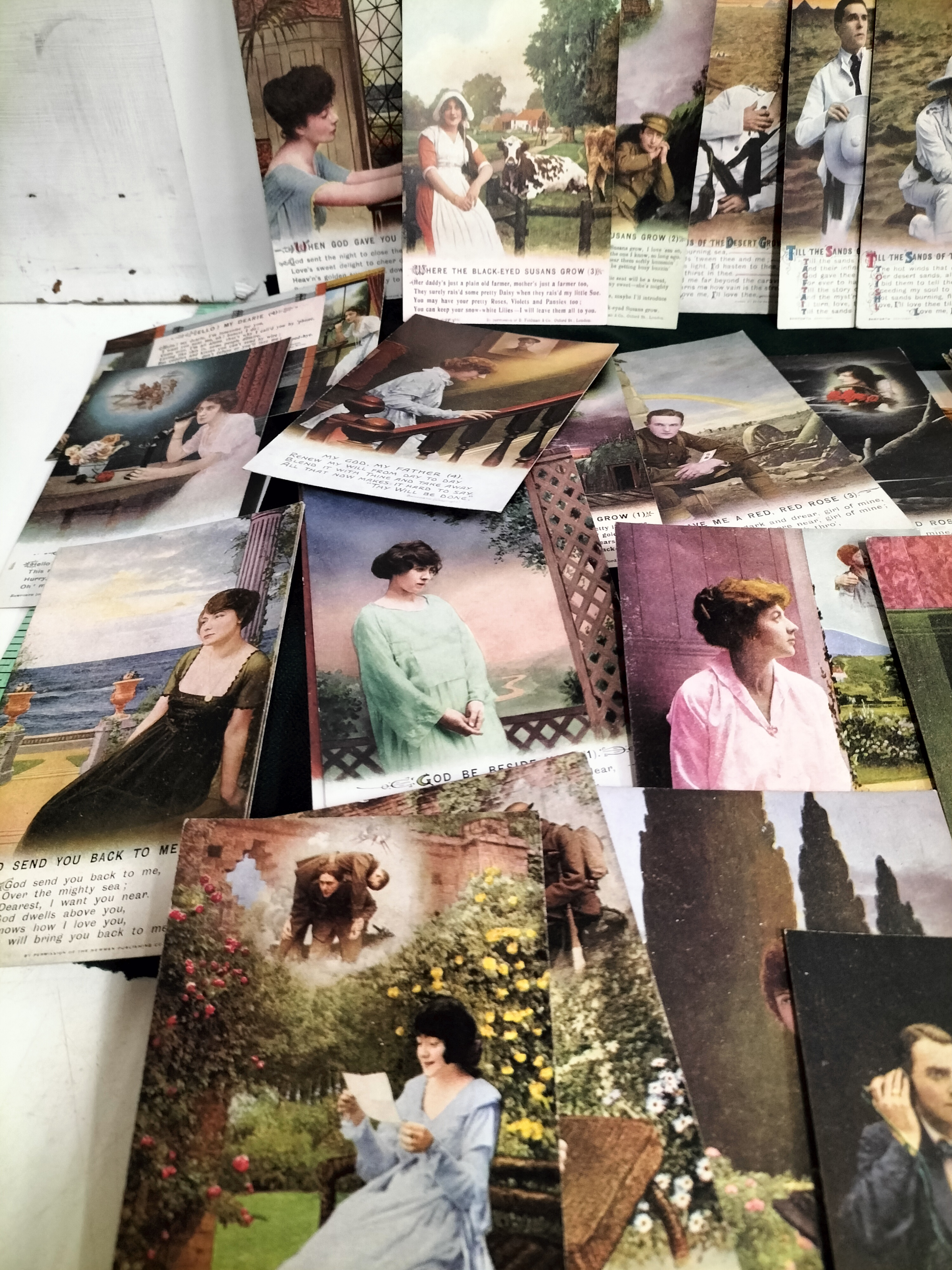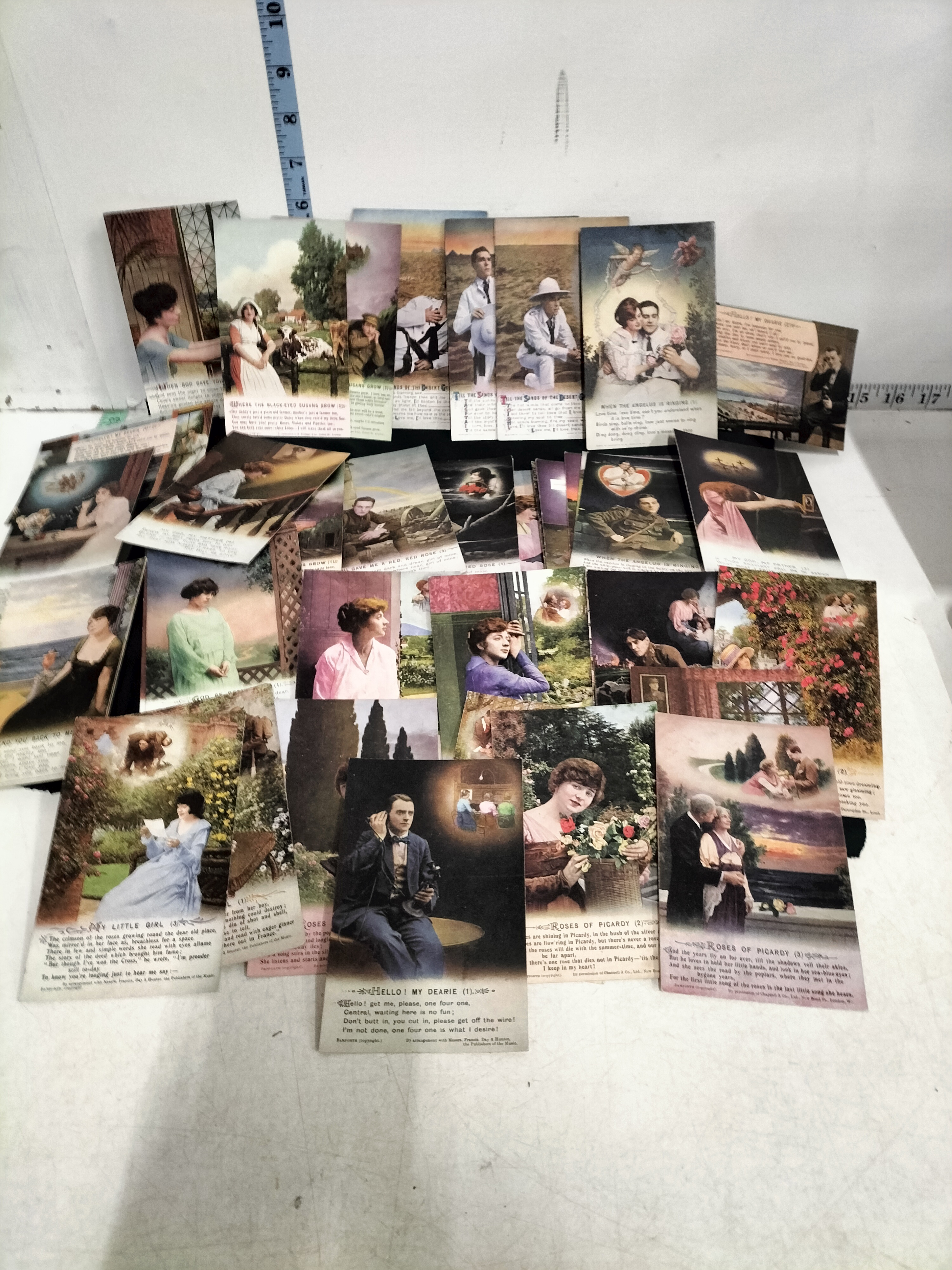 This is a substantial collection of vintage song postcards, a popular genre of early 20th-century ephemera. These cards were typically produced in sets of three or four to illustrate the lyrics of contemporary sheet music. The lot features a mix of hand-tinted photographic styles and colour lithographs. The subject matter is deeply rooted in the sentimental and patriotic themes of the Edwardian period and the First World War, depicting soldiers in uniform, romantic couples in pastoral gardens, and domestic scenes of longing. Identifiable song titles in this collection include the famous 1916 wartime ballad Roses of Picardy, as well as Hello! My Dearie, Where the Black-Eyed Susans Grow (1917), Till the Sands of the Desert Grow Cold, When the Angelus is Ringing, God Send You Back to Me, and the hymn My God, My Father. The cards bear the imprints of prominent London music publishers such as B. Feldman and Co., Chappell and Co., Ltd., and Francis, Day and Hunter. Many of these series were manufactured by Bamforth and Co. of Holmfirth, England, who were the leading specialists in song card production. These items served as both affordable collectibles and a means of sharing popular culture through the post. Dimensions: Approximately 140 mm x 90 mm each.