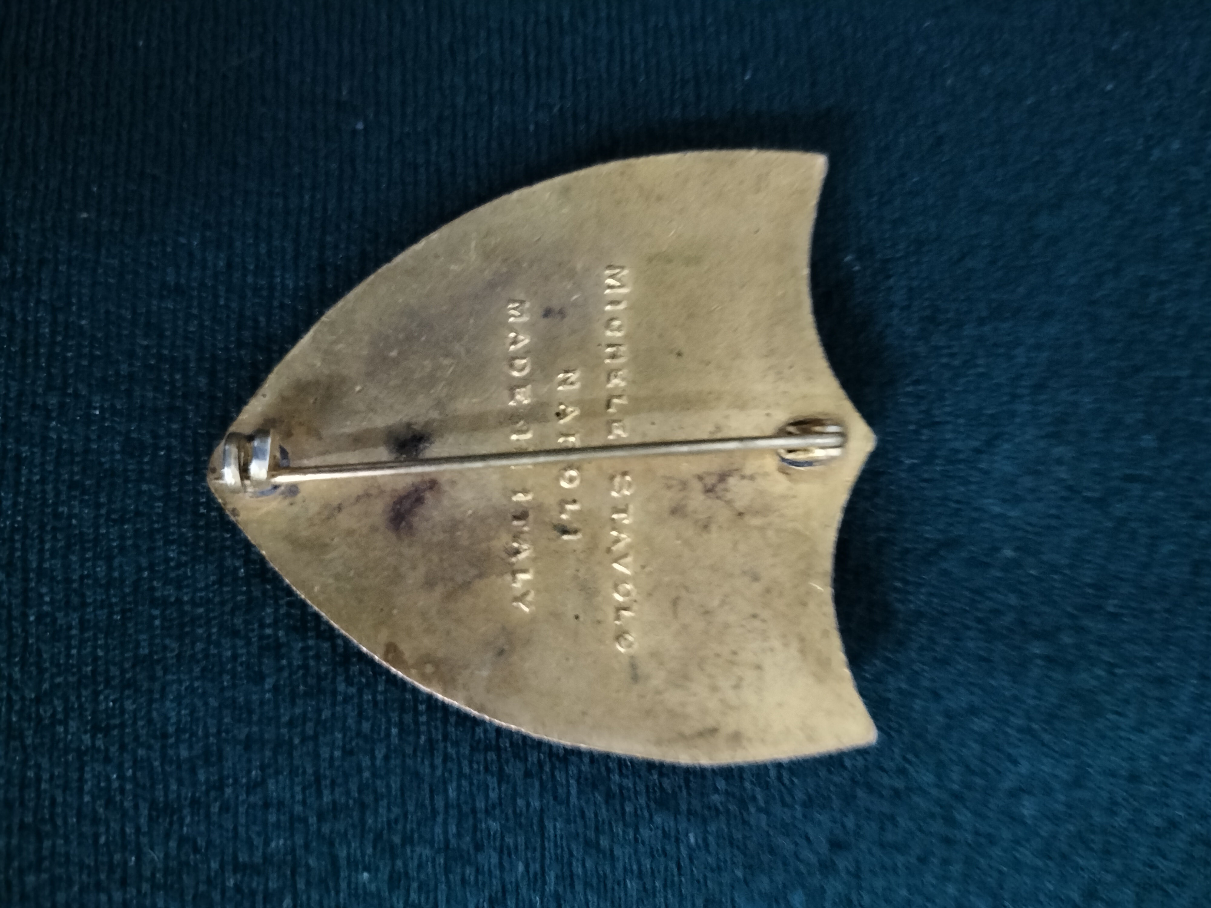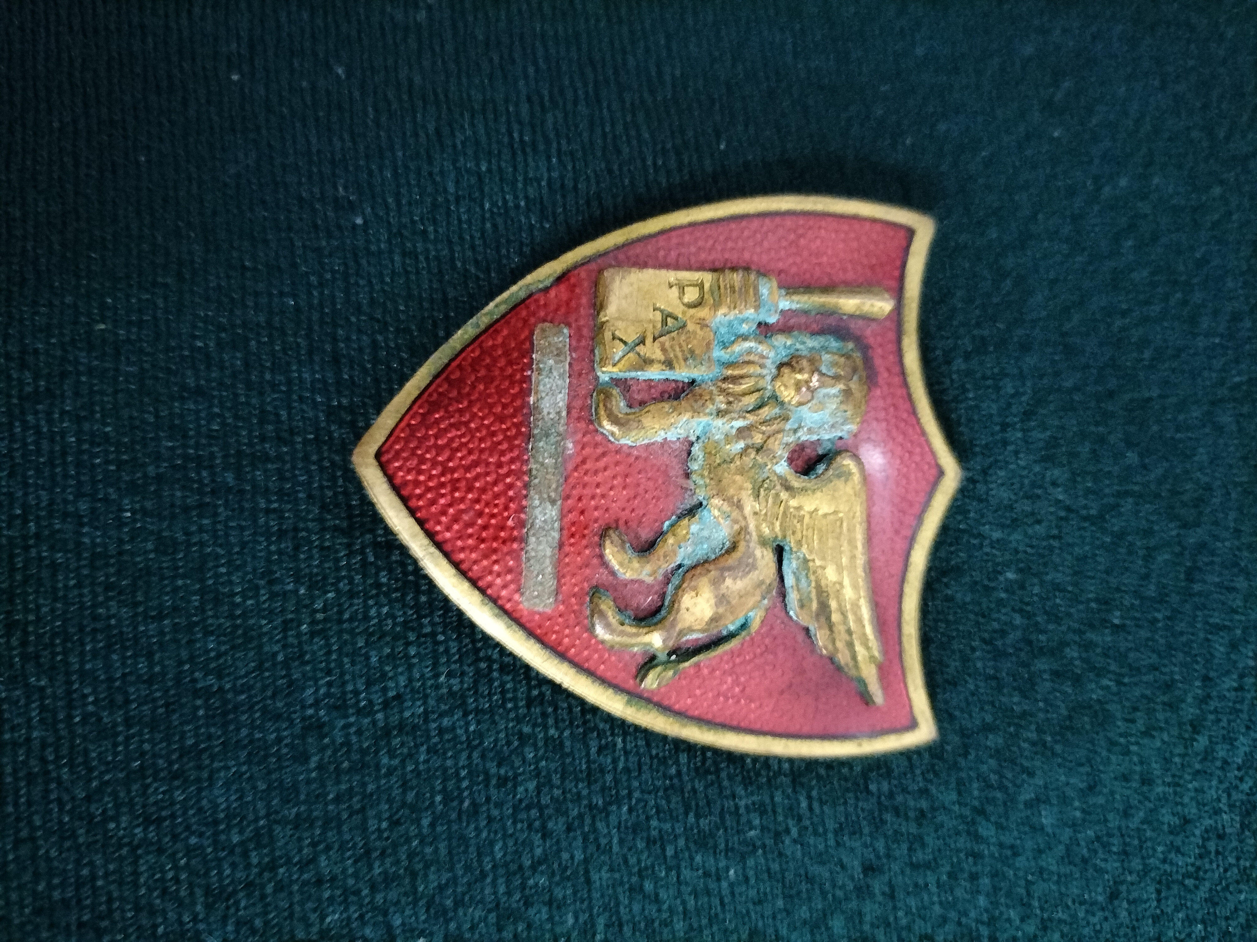 A fine example of a mid-20th century Italian-made military insignia, specifically associated with the Allied Forces Southern Europe (AFSOUTH), a NATO command established in Naples in 1951. The badge is designed as a shield with a notched top, featuring a raised, gilded relief of the winged Lion of Saint Mark set against a vibrant red guilloché enamel background. The lion holds an open book inscribed with PAX (Peace), a motif central to the heraldry of the Naples-based command. To the left of the lion is a single raised vertical bar. The reverse is finished with a gilt wash and bears the clear maker’s mark of Michele Stavolo, Napoli, along with the English text MADE IN ITALY. This indicates the piece was a private purchase or theatre-made item intended for Allied personnel, such as US or British forces stationed in Italy during the early Cold War period. The manufacturer, Michele Stavolo, was a well-regarded producer of high-quality jewellery and military insignia for international servicemen in the Naples area.