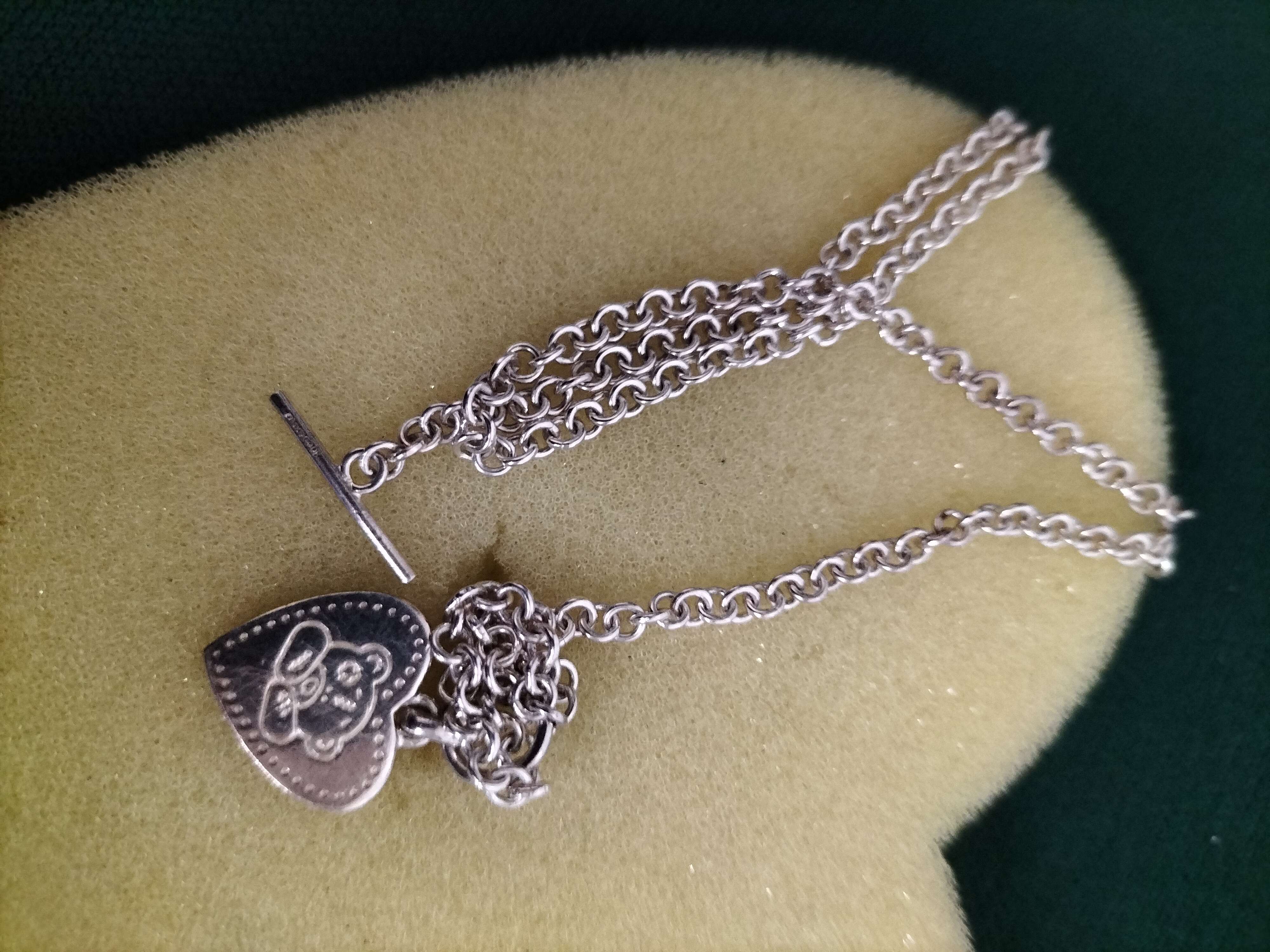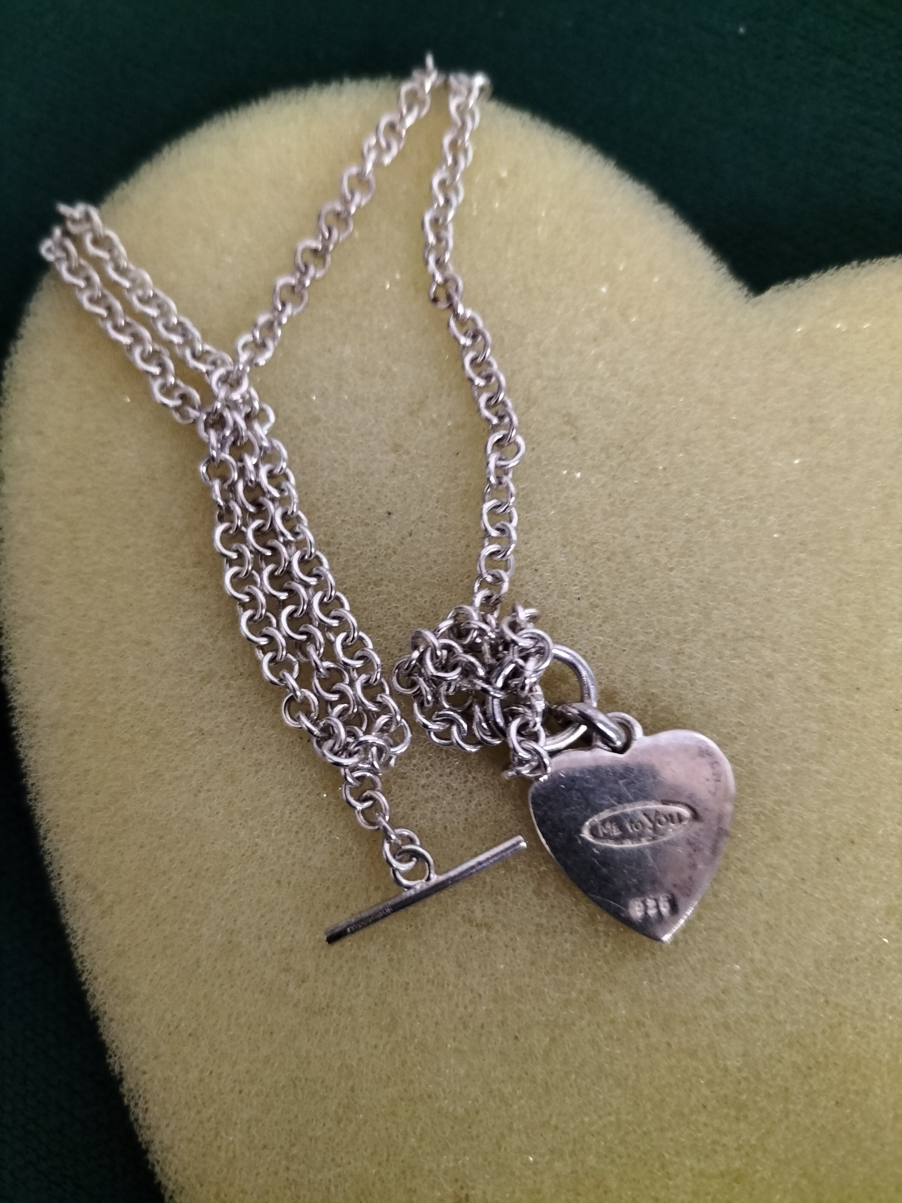 A sterling silver necklace featuring a rolo-link chain with a multi-strand section near the fastening. The piece is secured by a classic toggle (T-bar) clasp. The necklace is adorned with a heart-shaped pendant featuring a stamped teddy bear motif on the obverse. The reverse of the pendant is stamped with an oval cartouche reading Me to You and a 925 purity mark, confirming sterling silver content. Hallmarks: Stamped 925 and Me to You. Weight and measurements not provided.