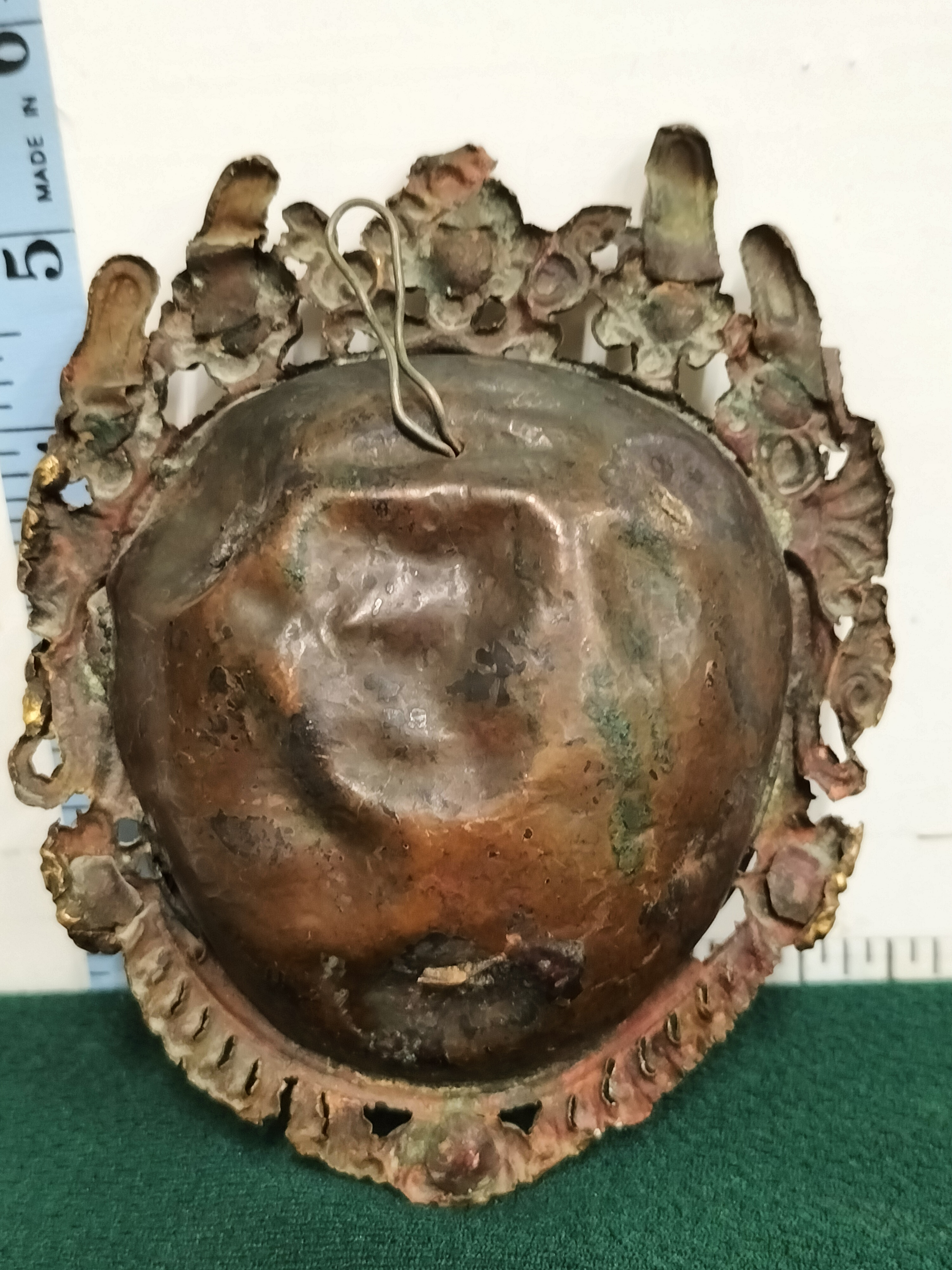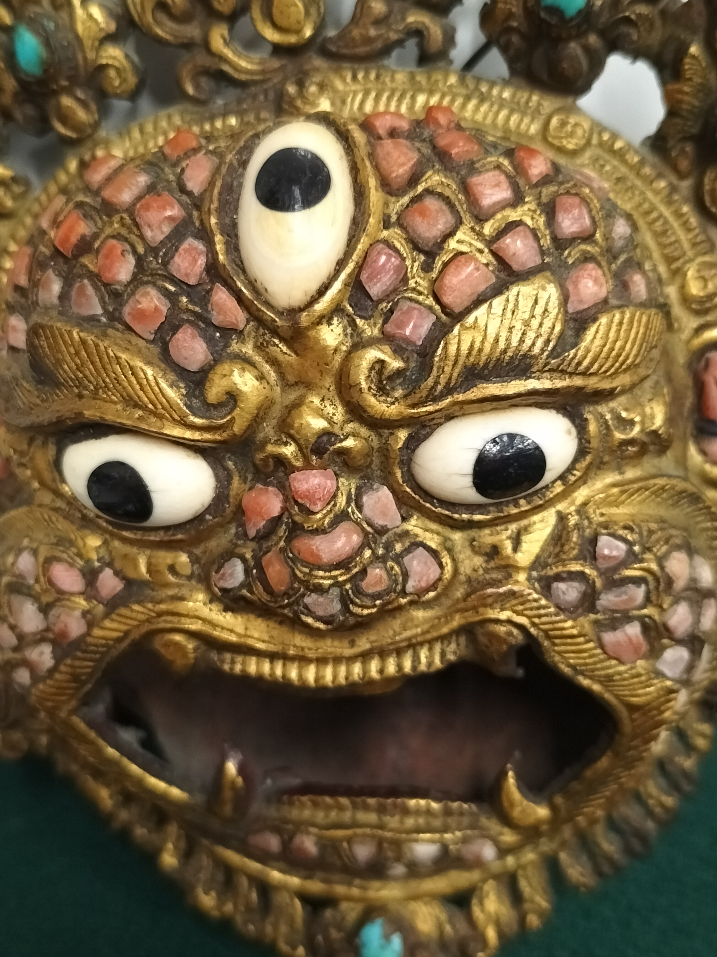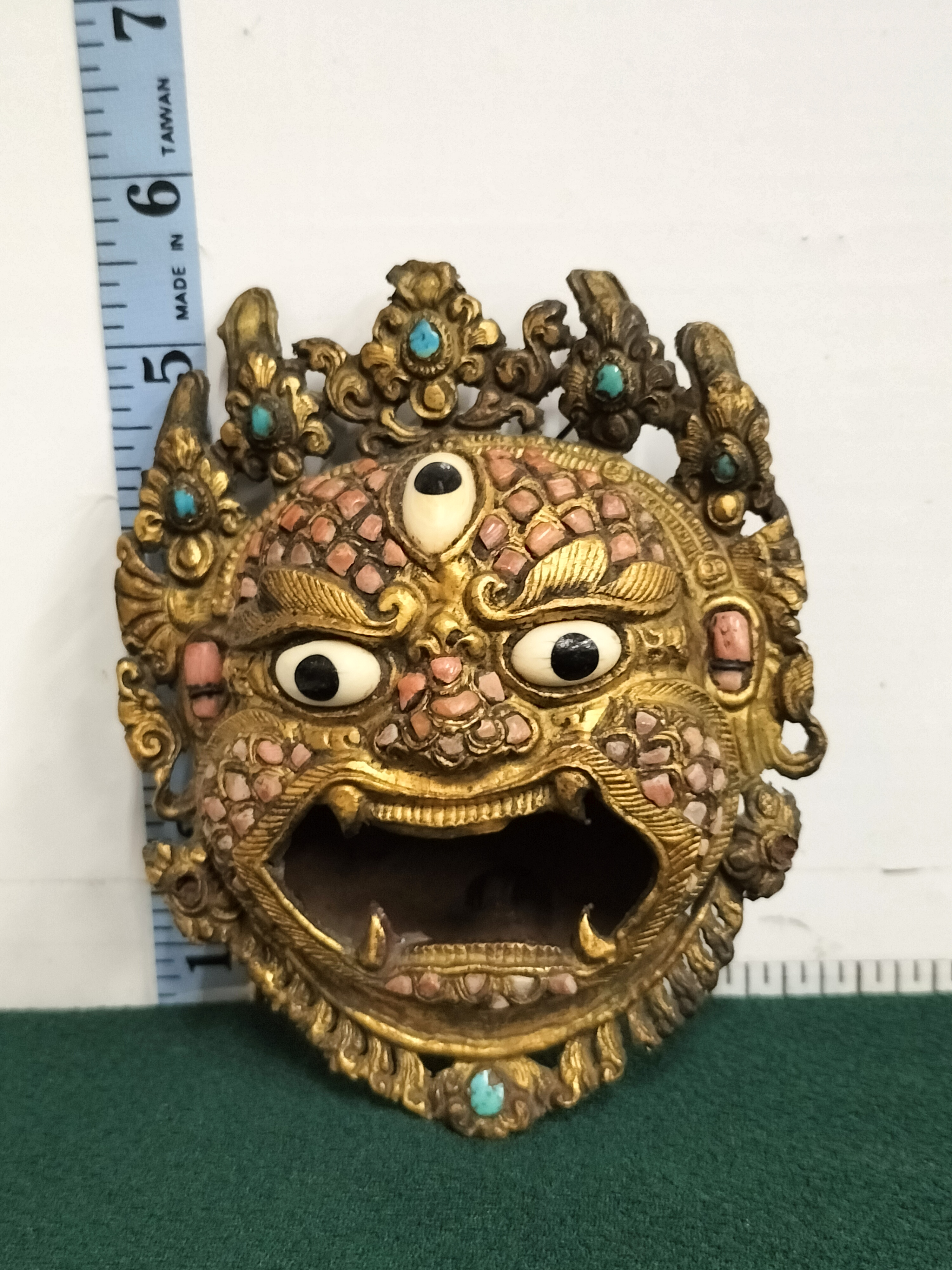 A 20th-century Himalayan decorative wall plaque or mask, likely of Nepalese or Tibetan manufacture, depicting the wrathful Buddhist deity Mahakala or a protective Kirtimukha. The piece is executed in gilt-copper repoussé and is heavily embellished with a mosaic of coral and turquoise fragments. The deity is characterised by three bulging eyes rendered in bone, flaming eyebrows, and bared fangs. The figure wears an ornate scrolling foliate crown set with turquoise cabochons. The reverse reveals a hand-beaten copper surface with a simple wire loop for hanging. As a specialist in Russian art, I note that this item is of non-Russian origin and bears no Cyrillic signatures, hallmarks, or maker’s marks. It does not correspond to Imperial Russian, Soviet, or modern Russian production. Dimensions: Height approximately 15 cm.