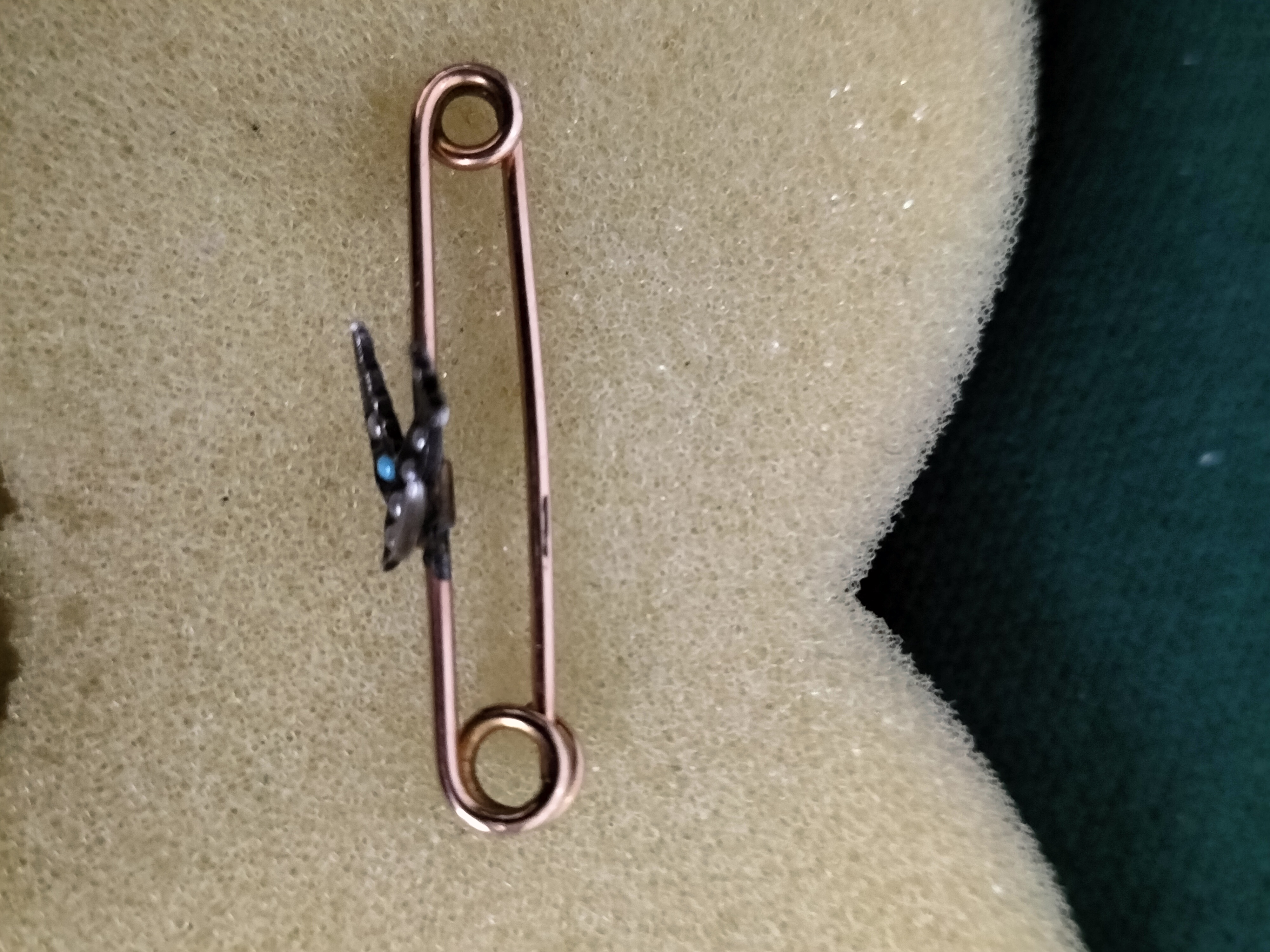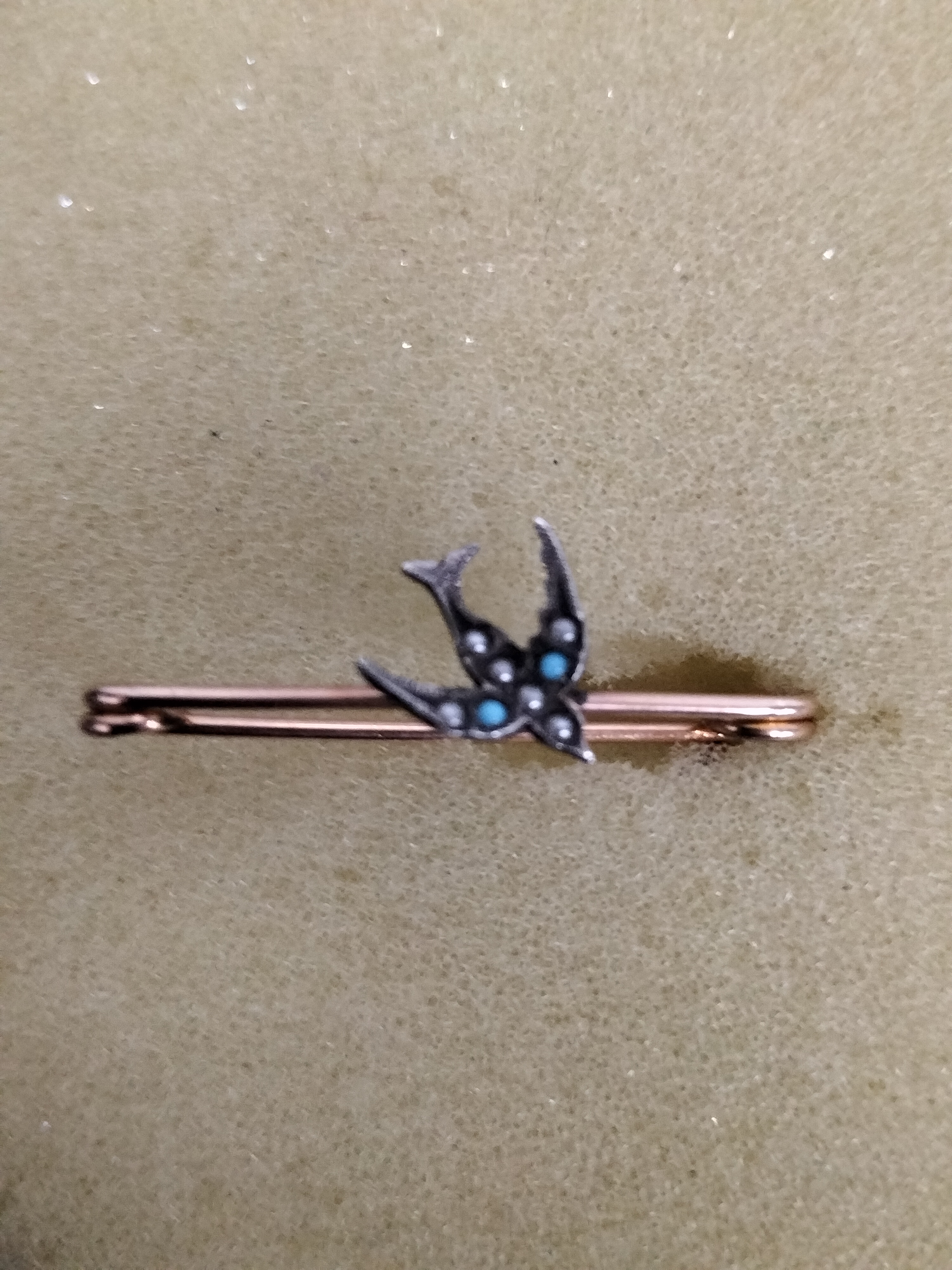 An antique Victorian to Edwardian era safety pin brooch, also known as a lace or lapel pin. The piece features a central applied motif of a swallow in flight, a popular sentimental symbol of the period representing loyalty and a safe return. The swallow is crafted from silver-topped metal with a darkened antique patina, set with two round turquoise cabochons and accented with several small seed pearls.