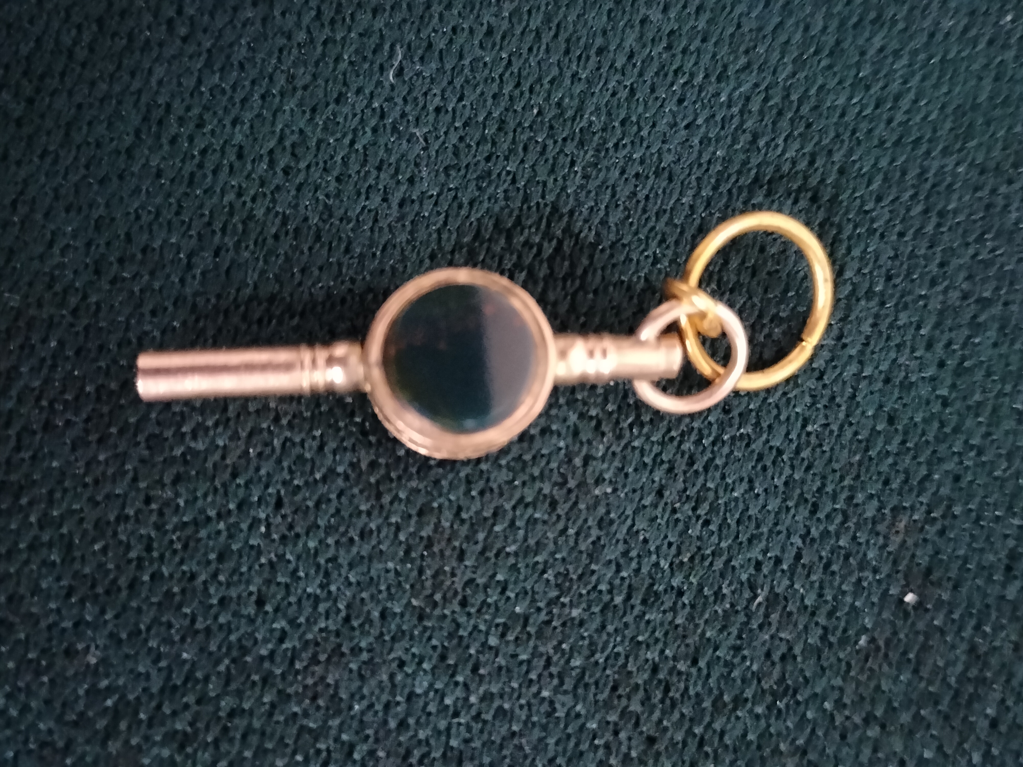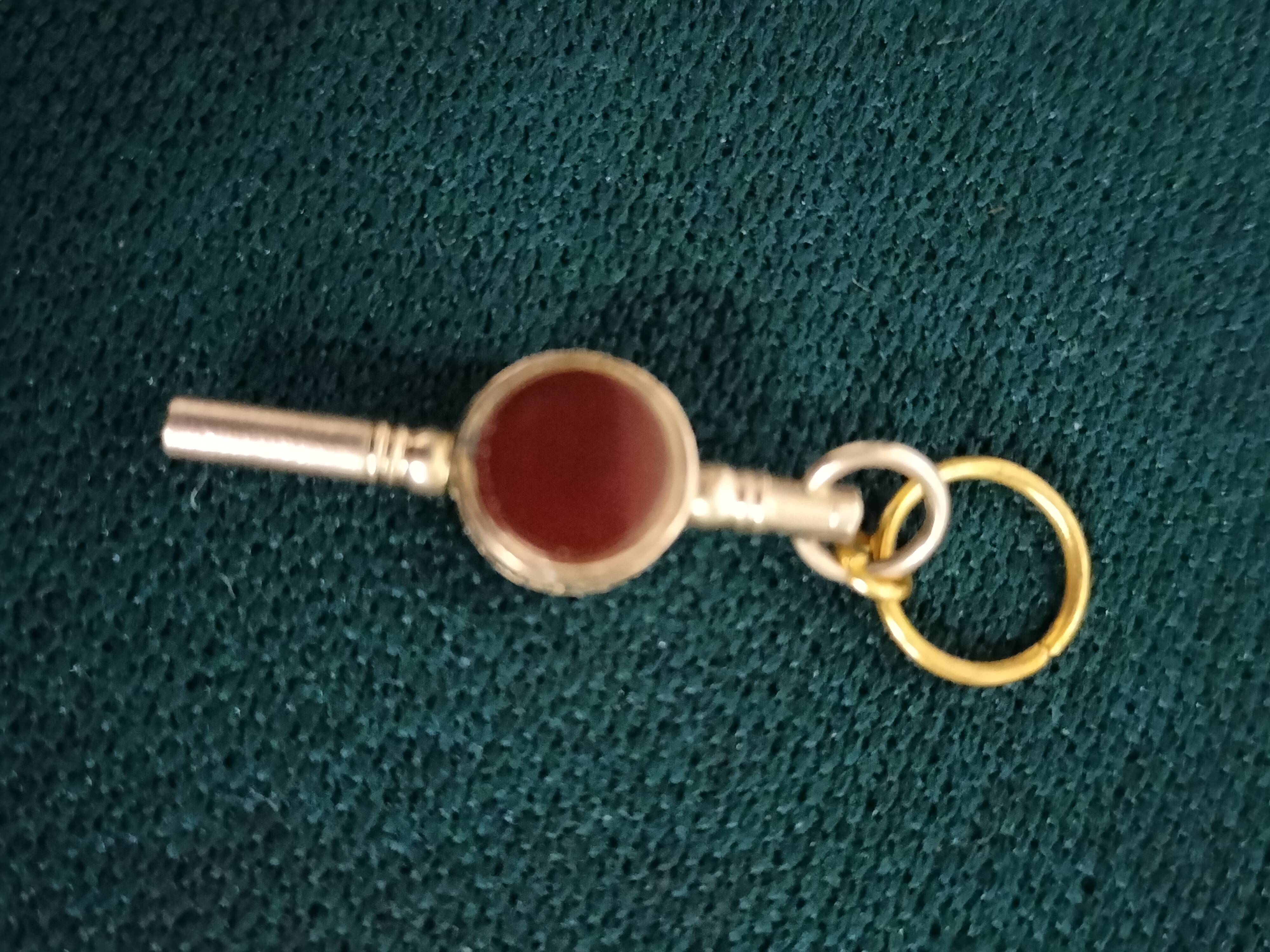 An unbranded mid-to-late 19th-century Victorian watch winding key and fob accessory. The piece is constructed from yellow metal, featuring a decorative turned tubular barrel that terminates in a square-profile socket designed for winding pocket watch movements. The centrepiece consists of a double-sided swivel mount set with two circular hardstone tablets: a translucent red carnelian and a dark green bloodstone. This functional tool was designed to be worn on an Albert chain or chatelaine, and it includes both its original suspension loop and a secondary gold-coloured split ring. While often collected alongside Victorian fob pencils, this item served as a dedicated horological tool for non-stem-winding watches of the era.