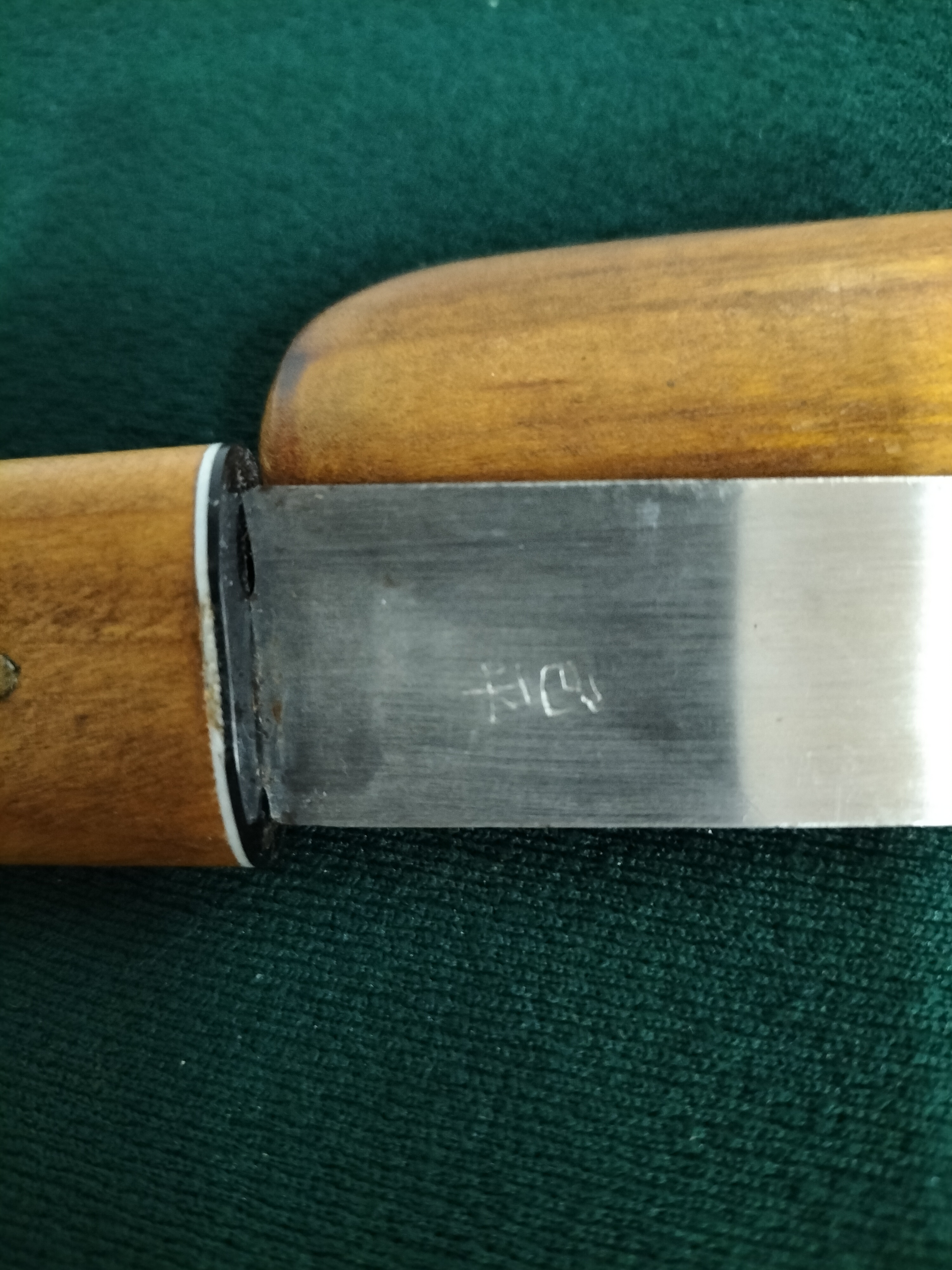 Produced by the maker Washi, this fixed-blade Japanese-style utility knife (Kogatana) is housed in a shirasaya mount. The single-edged carbon steel blade features a traditional chisel grind and a two-tone finish. The handle is crafted from light-coloured hardwood and is secured to the tang by a single brass pin. The blade features a hand-struck tang stamp consisting of two Japanese characters: 「和四」 (Washi). Blade length: 3.5 inches.