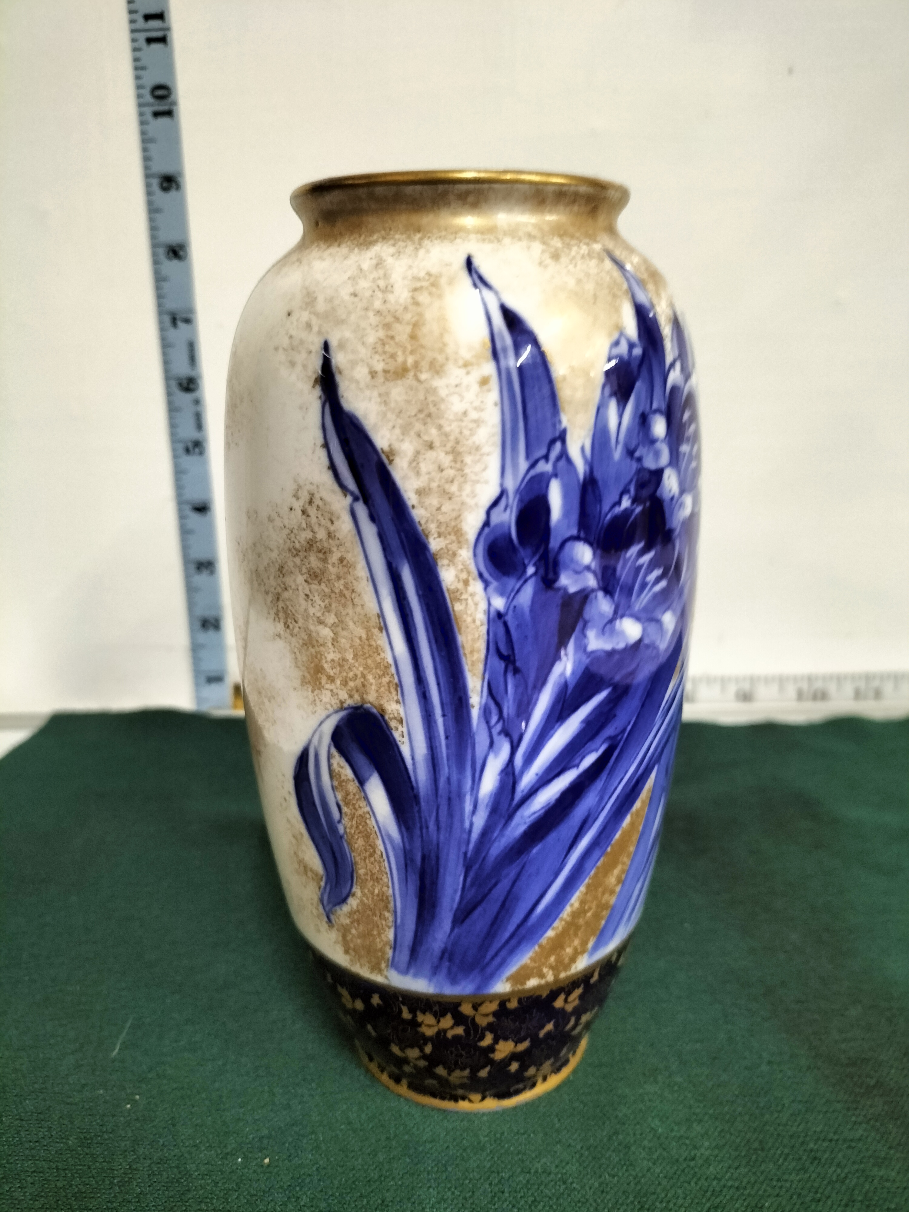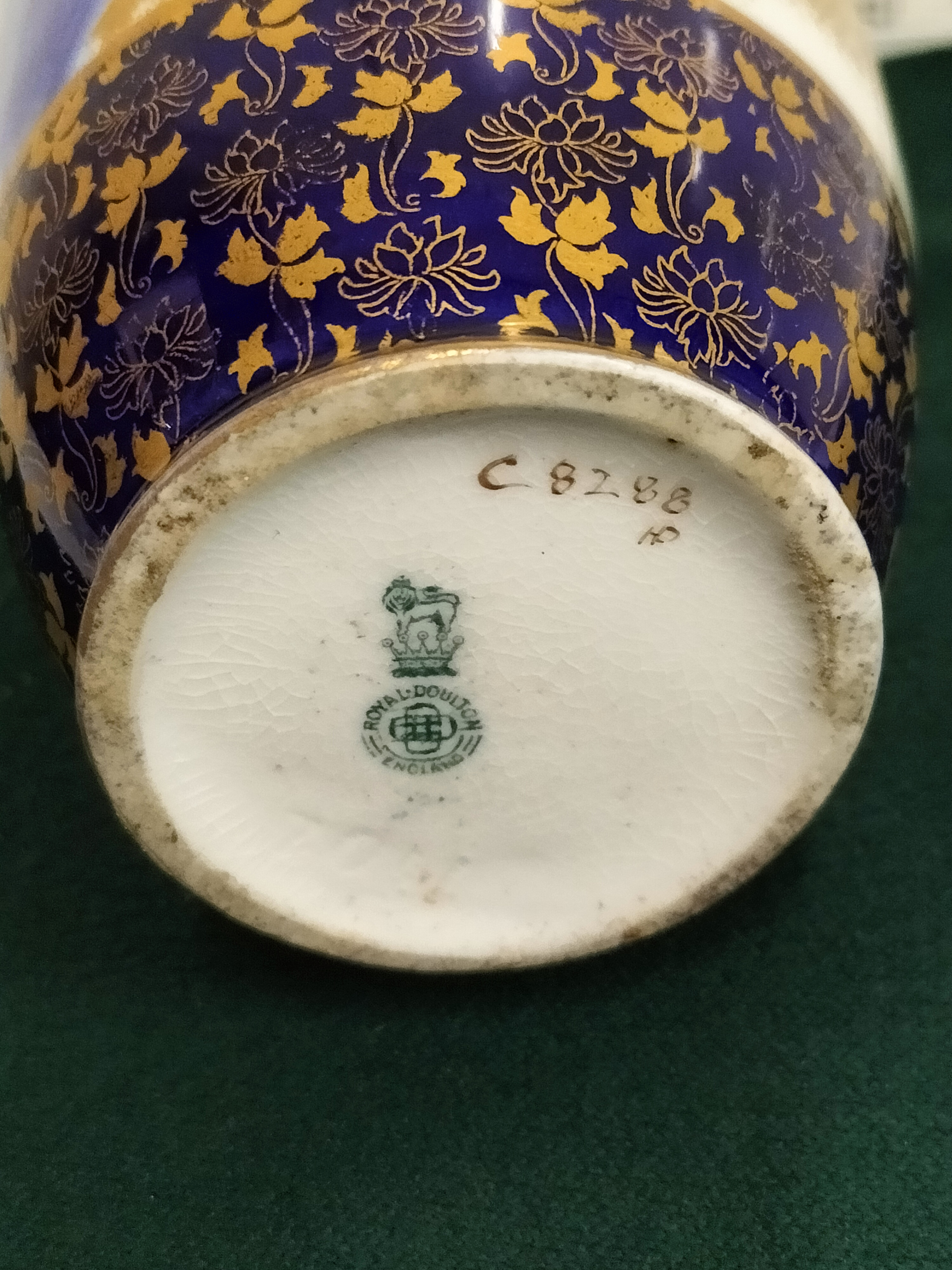 A fine Royal Doulton porcelain vase of slender ovoid form, dating to the Art Nouveau period. The body features a hand-painted Flow Blue iris motif against a cream-coloured ground, further enhanced by delicate gold-sponged highlights and a flared gilded rim. The lower section is defined by a deep cobalt blue band decorated with an intricate, repeating gilt floral pattern. The underside bears the green Royal Doulton England transfer mark with a lion atop a crown, alongside the hand-painted pattern number C 8288 and artist’s initials HP. Height: approximately 8.5 inches.