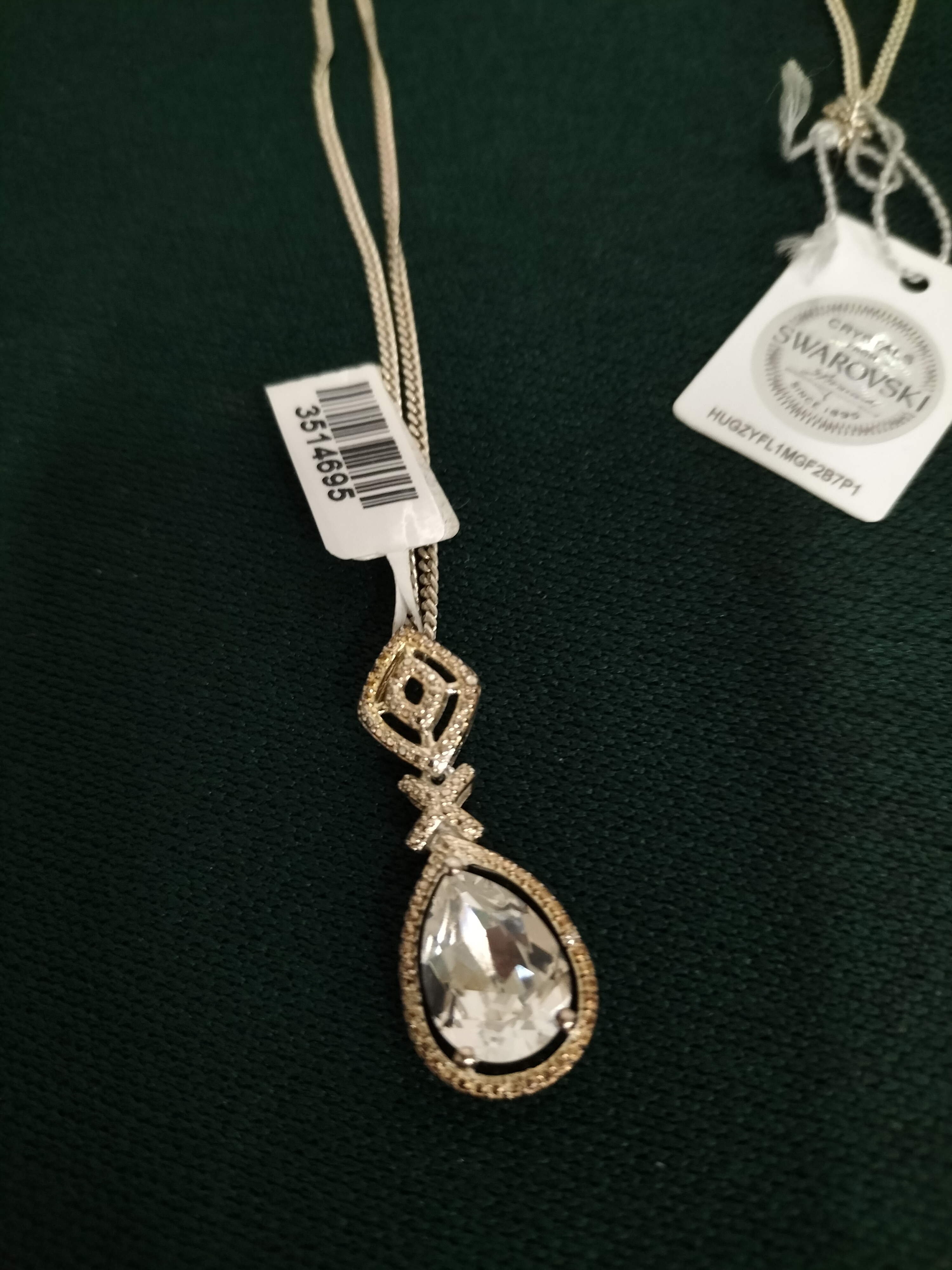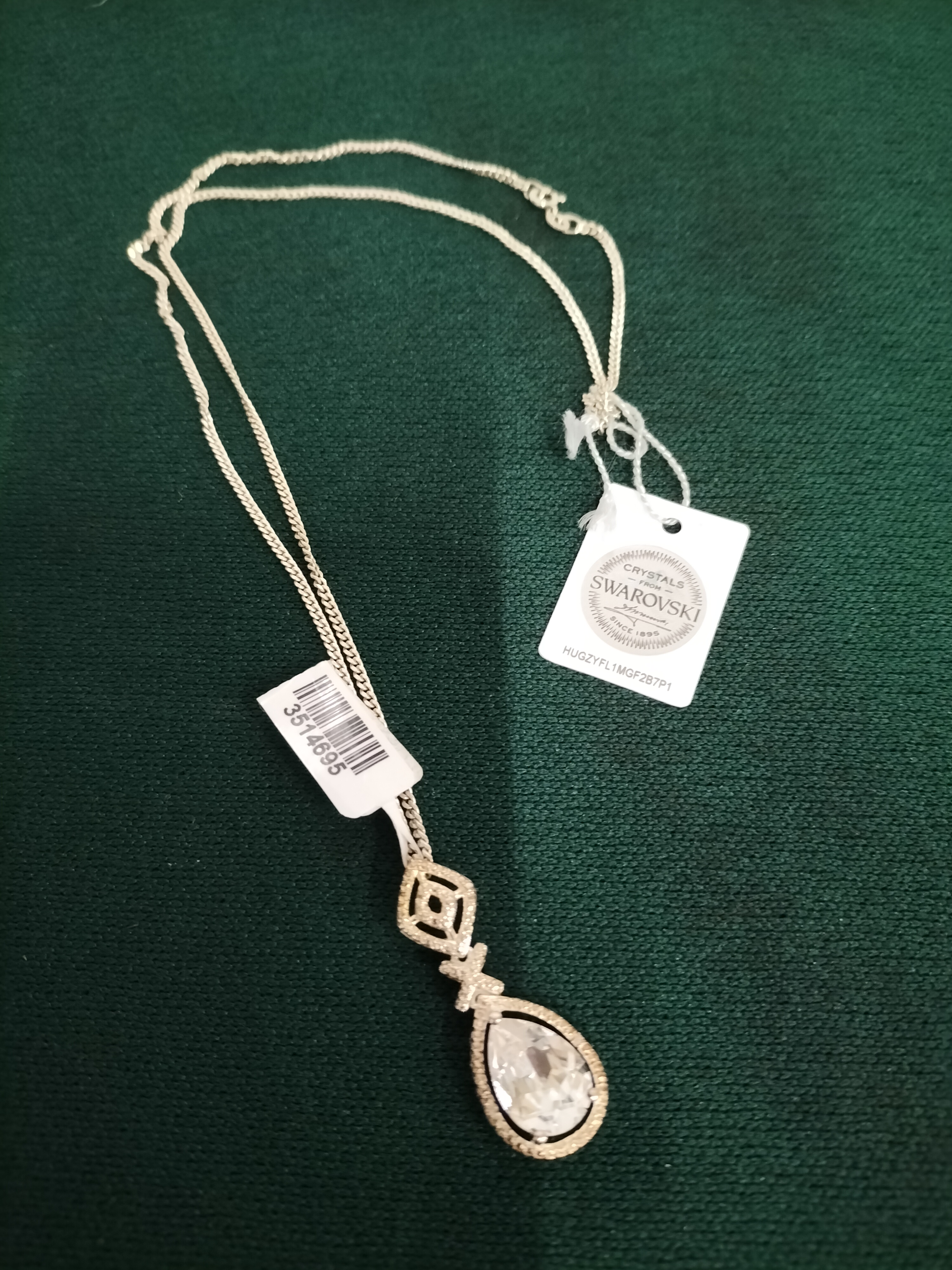 A polished silver-tone metal pendant necklace featuring a fine-link curb chain. The necklace supports an articulated drop pendant, showcasing a large, faceted pear-cut clear crystal centre stone. This primary stone is secured in a bezel setting and surrounded by a halo of pavé-set accent crystals. The drop is suspended from a decorative, openwork geometric bale, also embellished with pavé-set crystals. The piece is accompanied by an official Crystals from Swarovski seal of authenticity bearing the unique code HUGZYFL1MGF2B7P1 and an inventory barcode tag numbered 3514695. No visible metal purity hallmarks are present. Length: Approximately 18 inches.