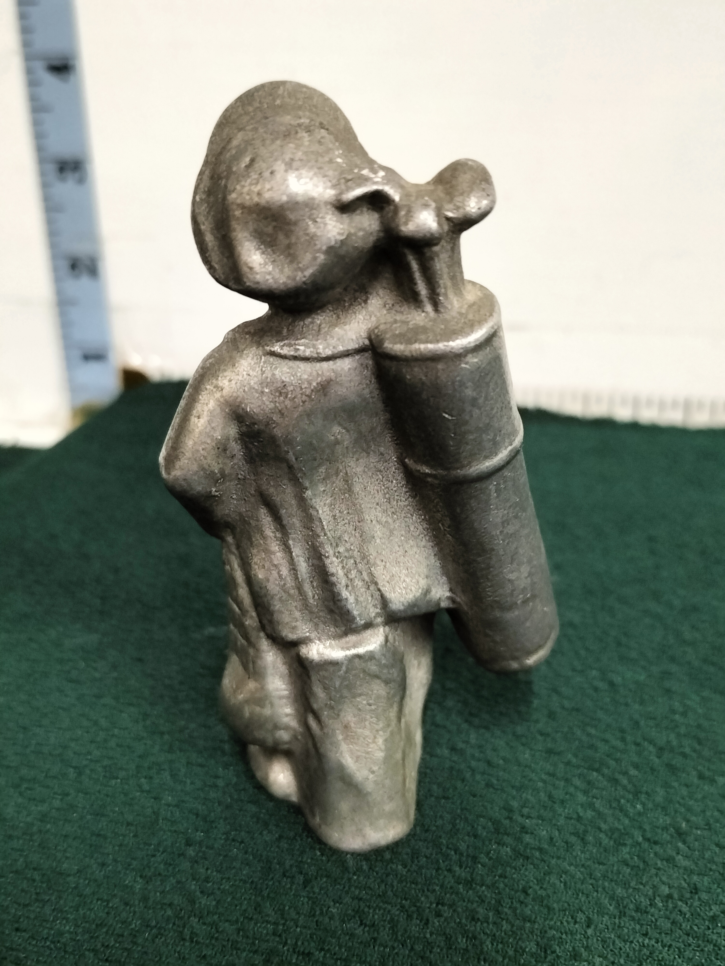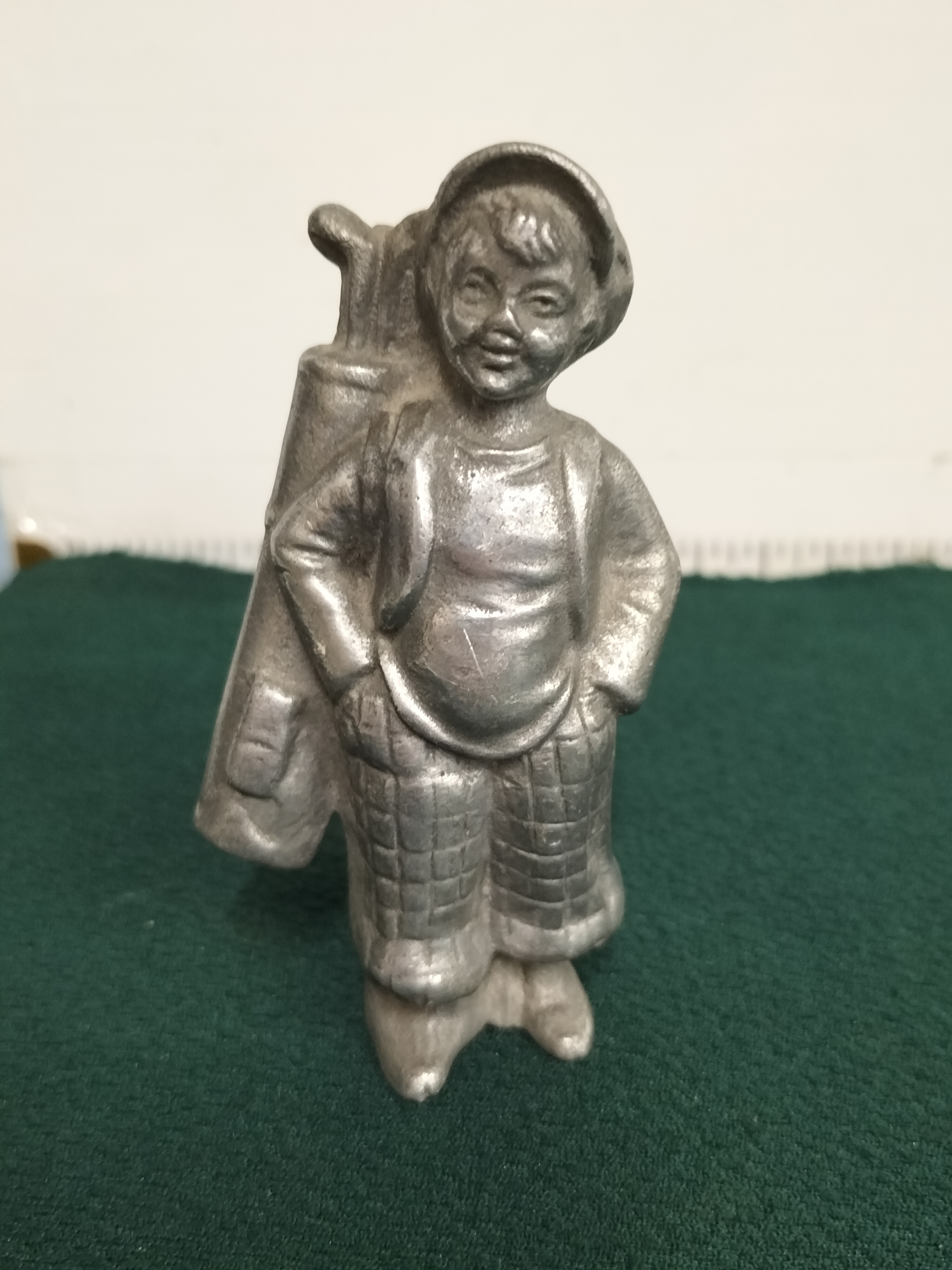 A cast pewter figurine attributed to Michael Ricker, depicting a young male golf caddy in period attire. The figure is rendered in a traditional style, wearing a flat cap and knickerbockers while carrying a golf bag over his right shoulder. The piece exhibits a textured surface resulting from the moulding process, finished in a matte grey patina. Although no maker’s marks are visible on this specific example, the subject matter and casting technique align with the Americana series produced by the Ricker studio during the 1980s. Height: approximately 8.5 cm.