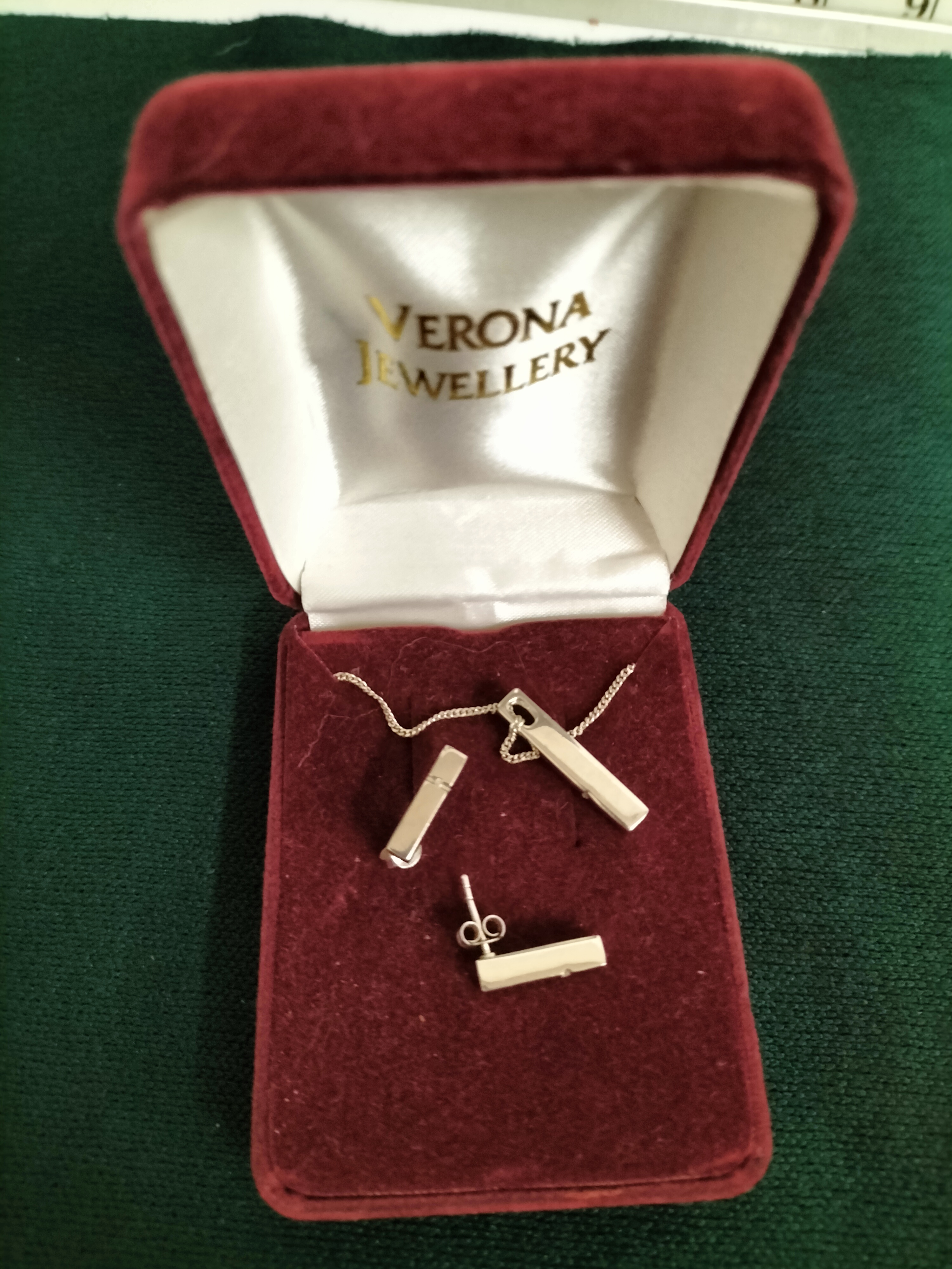 A contemporary jewellery suite comprising a pendant and matching earrings, crafted in a polished white-toned metal that appears to be sterling silver. The design features a minimalist rectangular bar aesthetic. The suite includes a bar pendant suspended from a fine-link chain and a pair of matching bar stud earrings with post-and-butterfly backings. The items are presented in a red velvet box with the Verona Jewellery brand name printed on the interior satin lining. No hallmarks, purity stamps, or maker’s marks are visible on the pieces. Weight and measurements are not available.