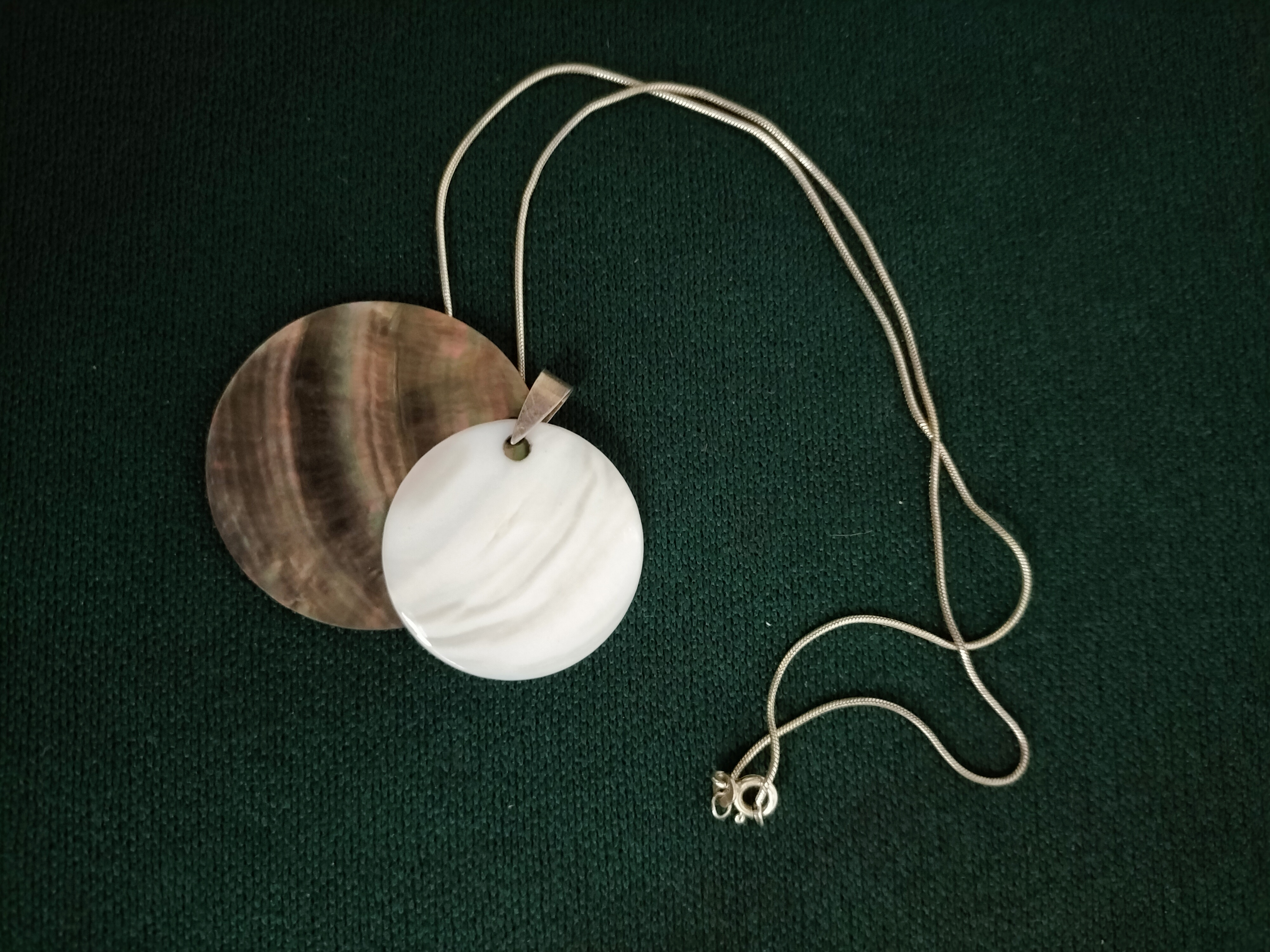 This contemporary costume jewellery piece features a double-pendant design suspended from a fine silver-tone snake chain. The focal point consists of two overlapping circular discs that appear to be crafted from iridescent mother-of-pearl; one disc exhibits a dark, smoky grey-brown lustre, while the other presents a creamy white nacreous finish. The white disc is suspended via a simple silver-tone metal bail. The necklace is secured with a standard spring ring clasp. No hallmarks or maker’s marks were observed during inspection. The metal appears to be a non-precious silver-tone alloy. Weight and measurements are unavailable.