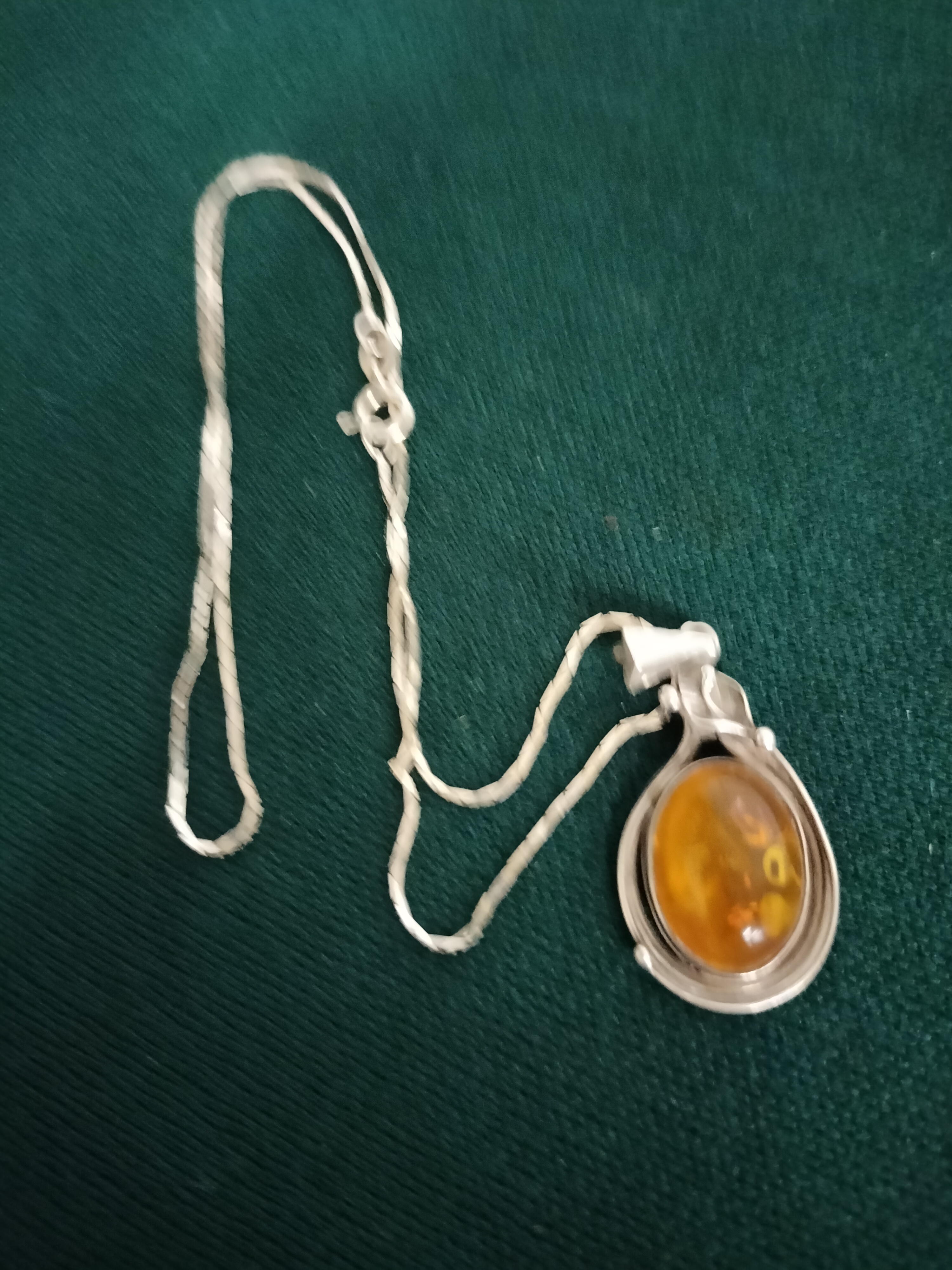 Silver pendant necklace, fine twisted rope-style chain. The detachable pendant features a modernist openwork frame with a double-banded border. It is set with a large oval honey amber cabochon containing characteristic internal spangles. No hallmarks are visible. Length: approximately 18–20 inches.