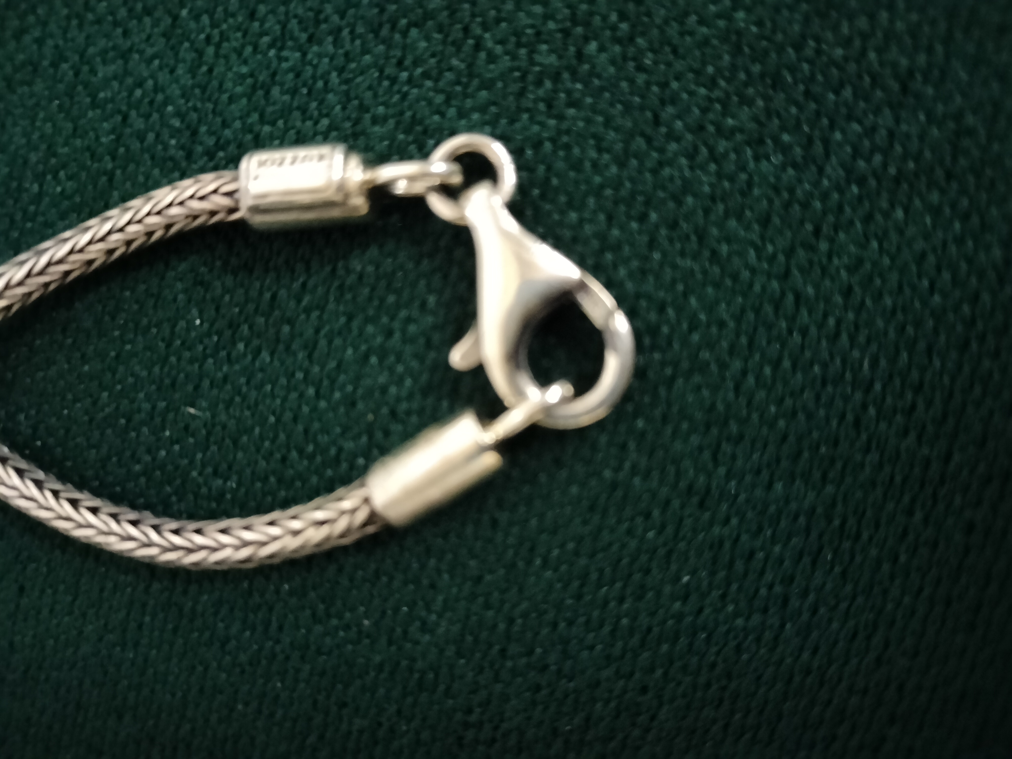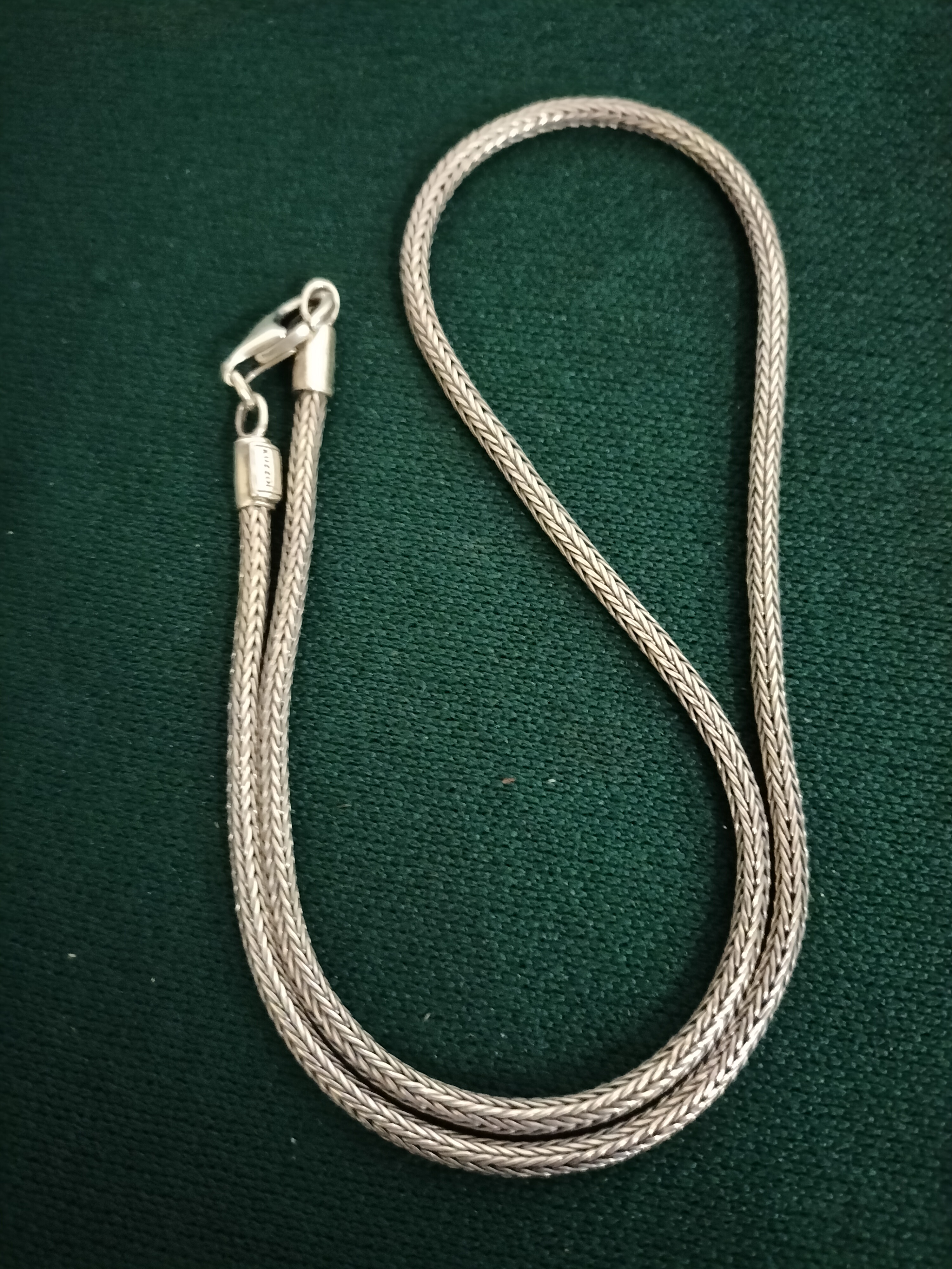 A sterling silver chain necklace featuring a woven wheat or spiga style design, commonly known as a Bali foxtail weave. The four-sided braided chain is crafted from sterling silver and terminates in stamped end caps. The hallmarks on the end caps include 925, indicating sterling silver, alongside a maker’s mark or geographic origin. The necklace is secured with a lobster claw clasp and a circular jump ring. No gemstones are present. Length: Estimated 18-20 inches.