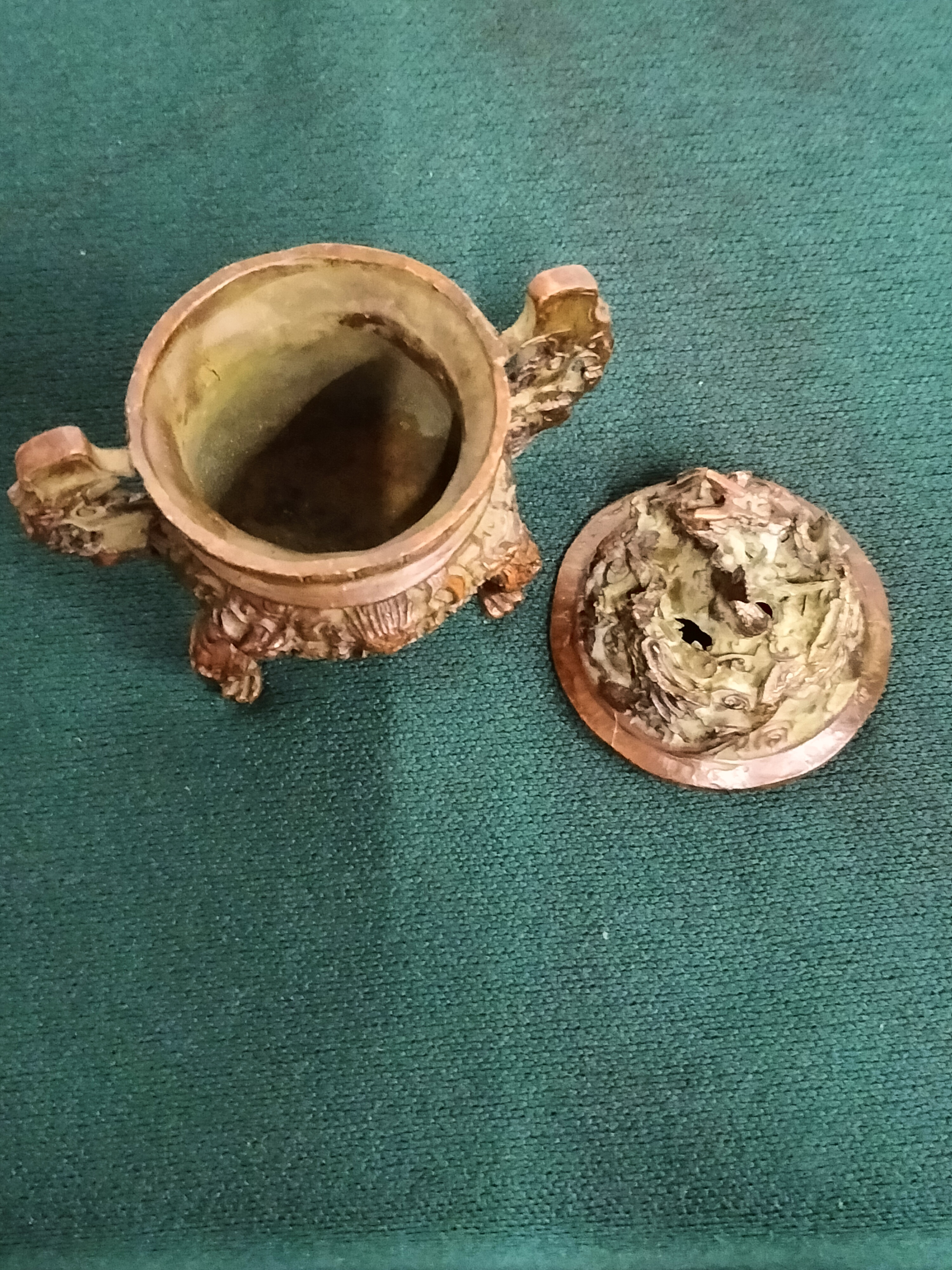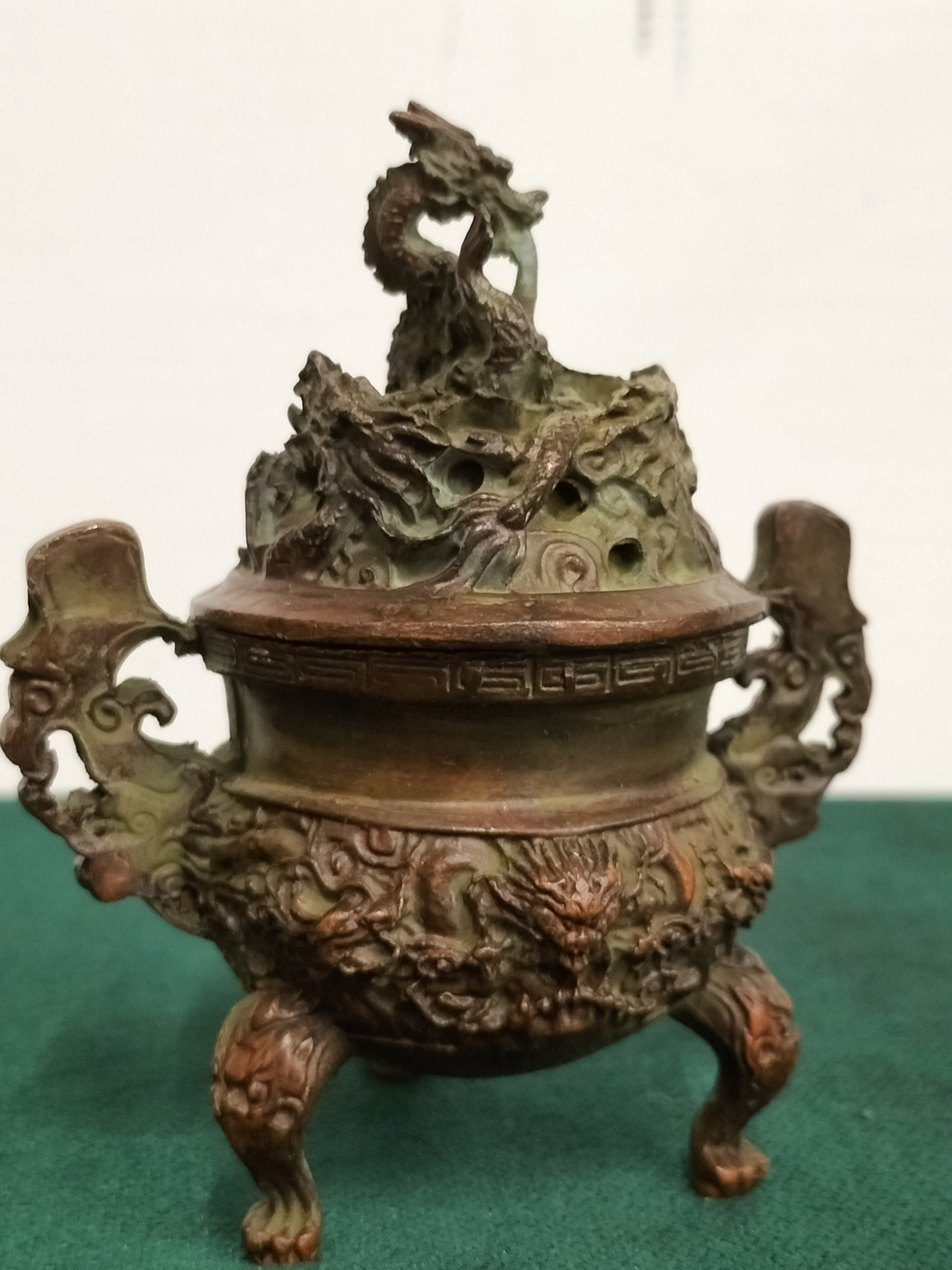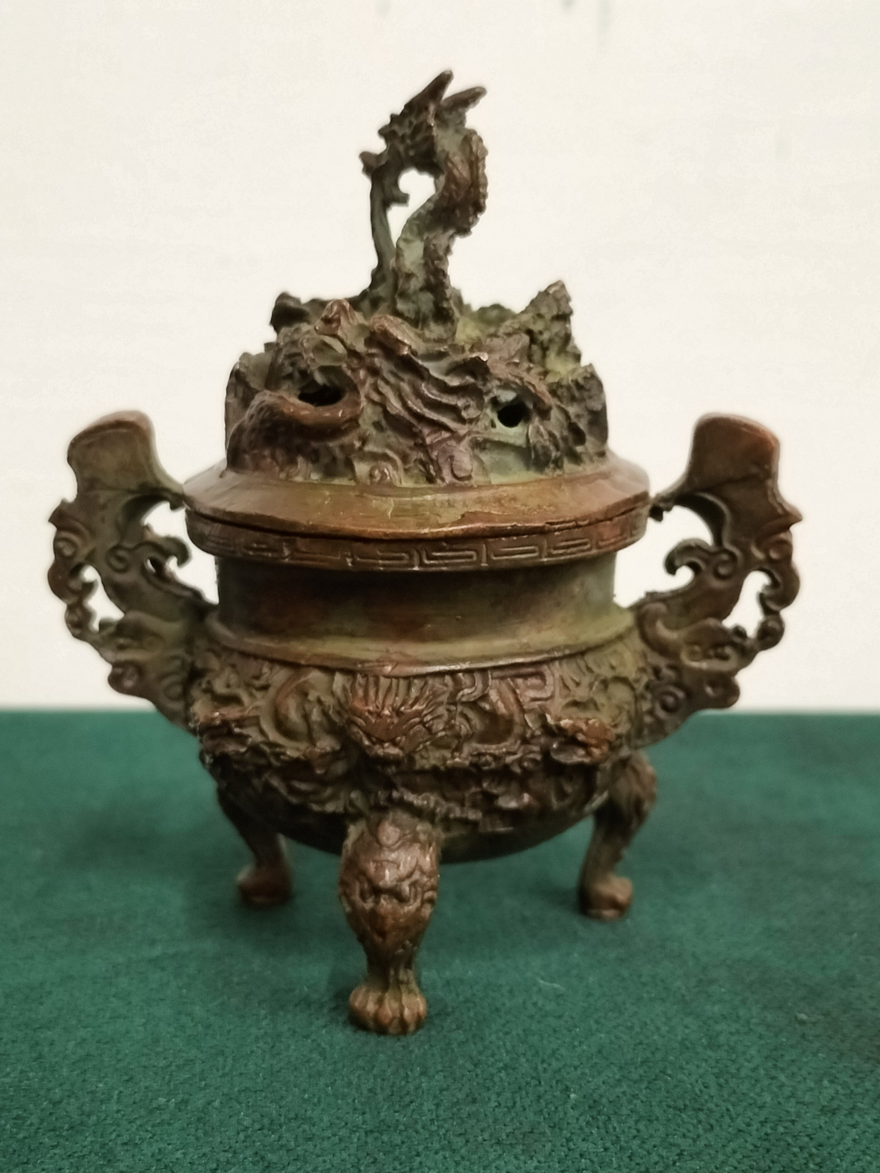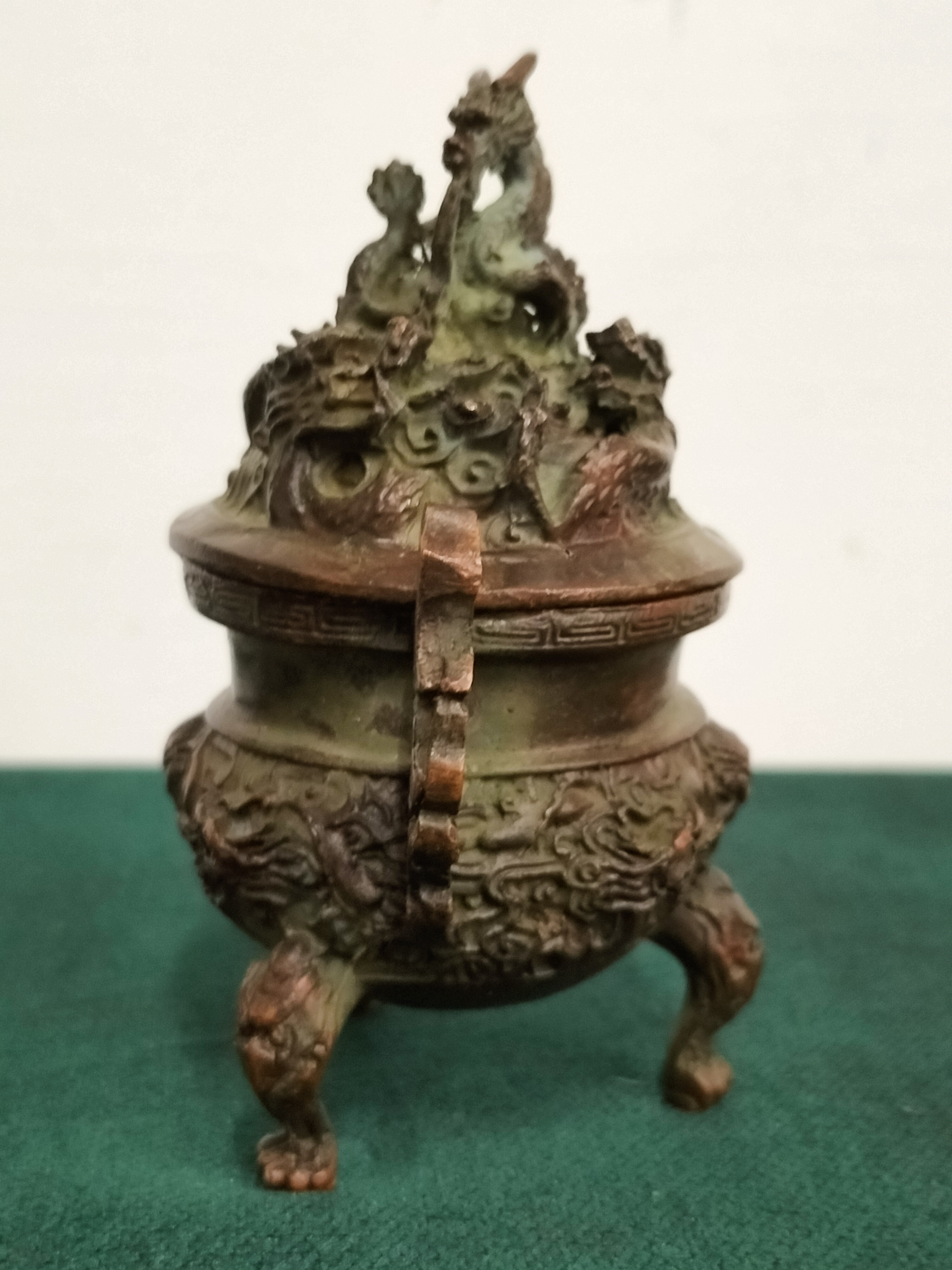 A Chinese cast bronze tripod censer and cover, dating to the late Qing dynasty or Republic period. The globular body is decorated in high relief with a continuous scene of dragons amidst stylised clouds. The vessel is flanked by two elaborate S-curved zoomorphic handles and is supported by three cabriole legs, each headed by a lion mask and terminating in a paw foot. A band of key-fret pattern borders the rim. The domed, openwork cover is surmounted by a prominent dragon-form finial, designed to allow the passage of incense smoke. This form is often referred to as a Nine Dragon stove or censer, symbolising power and longevity. No reign marks or inscriptions are visible. Dimensions: Height approximately 11 cm; Width approximately 9 cm (estimated).