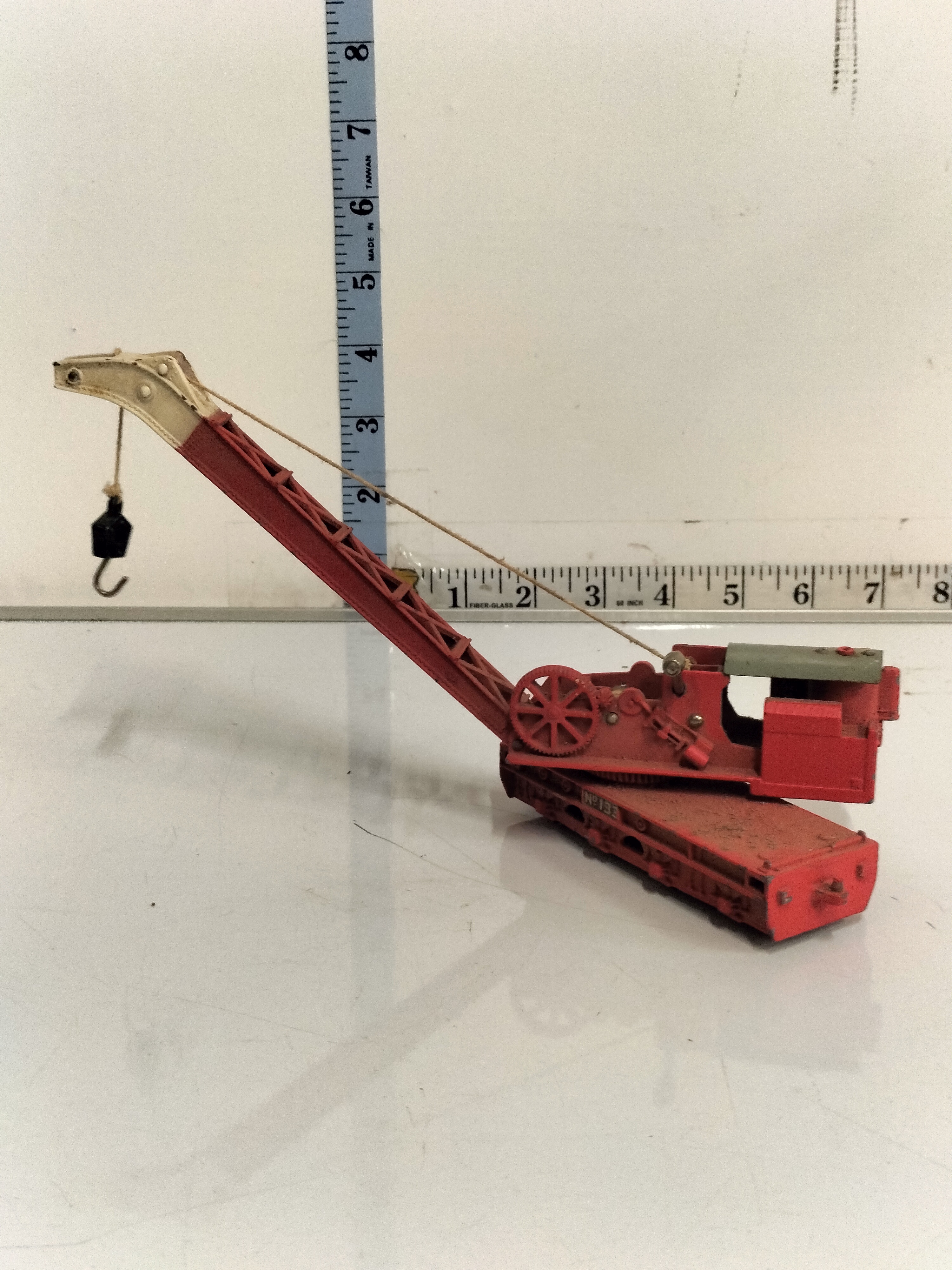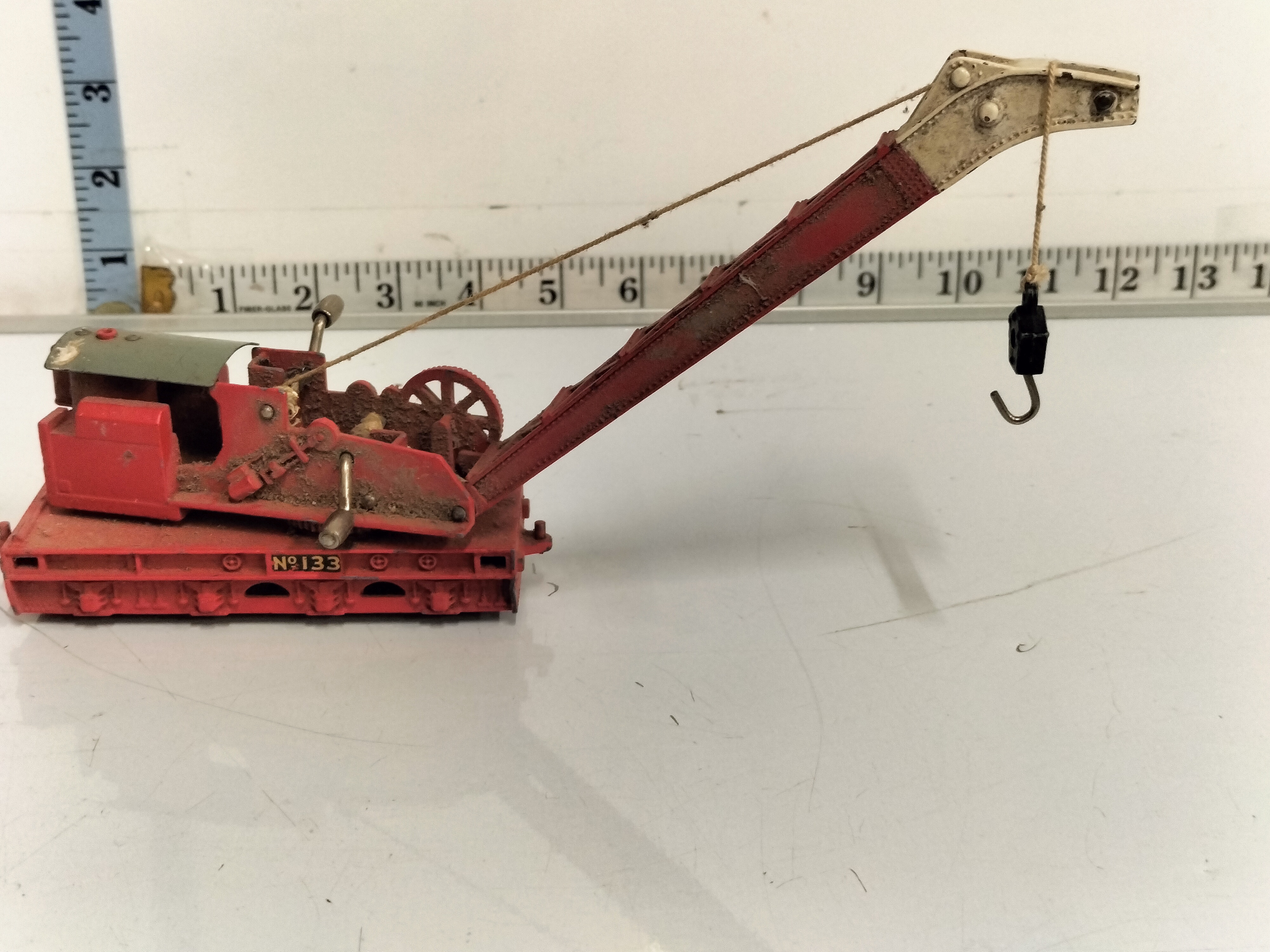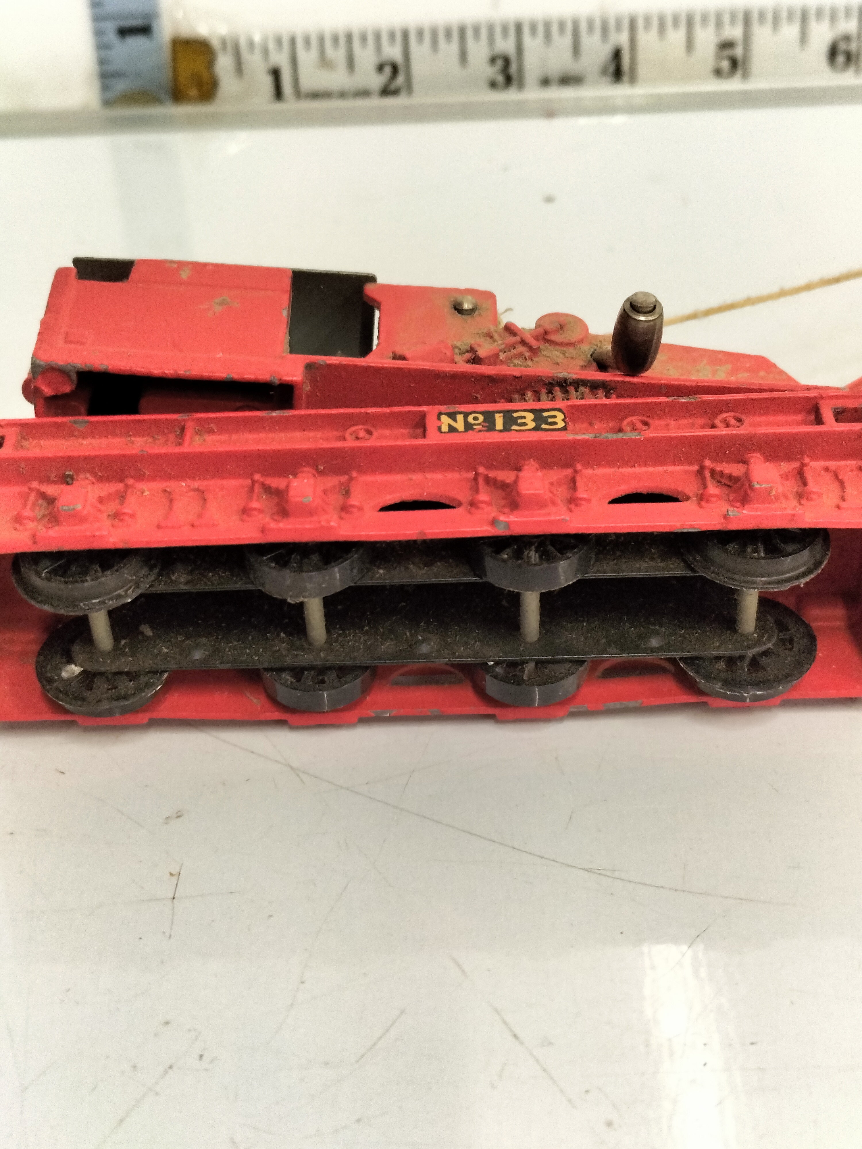 A vintage Hornby Dublo 00 gauge breakdown crane, model number 4620, constructed from heavy die-cast metal. The piece features a red-painted chassis and lattice boom with a cream-coloured jib tip. The base is detailed with the number “Nº 133” in yellow and black lettering, a characteristic marking for this British Railways (BR) inspired model. The crane is designed with a rotating superstructure, manual crank handles for operating the boom elevation and hook height, and an exposed gear system. The underside reveals four pairs of black wheels on fixed axles. This model was a staple of the Meccano-produced Hornby Dublo range during the late 1950s and early 1960s. Base length: approximately 6 inches. Total boom length: approximately 11 inches.