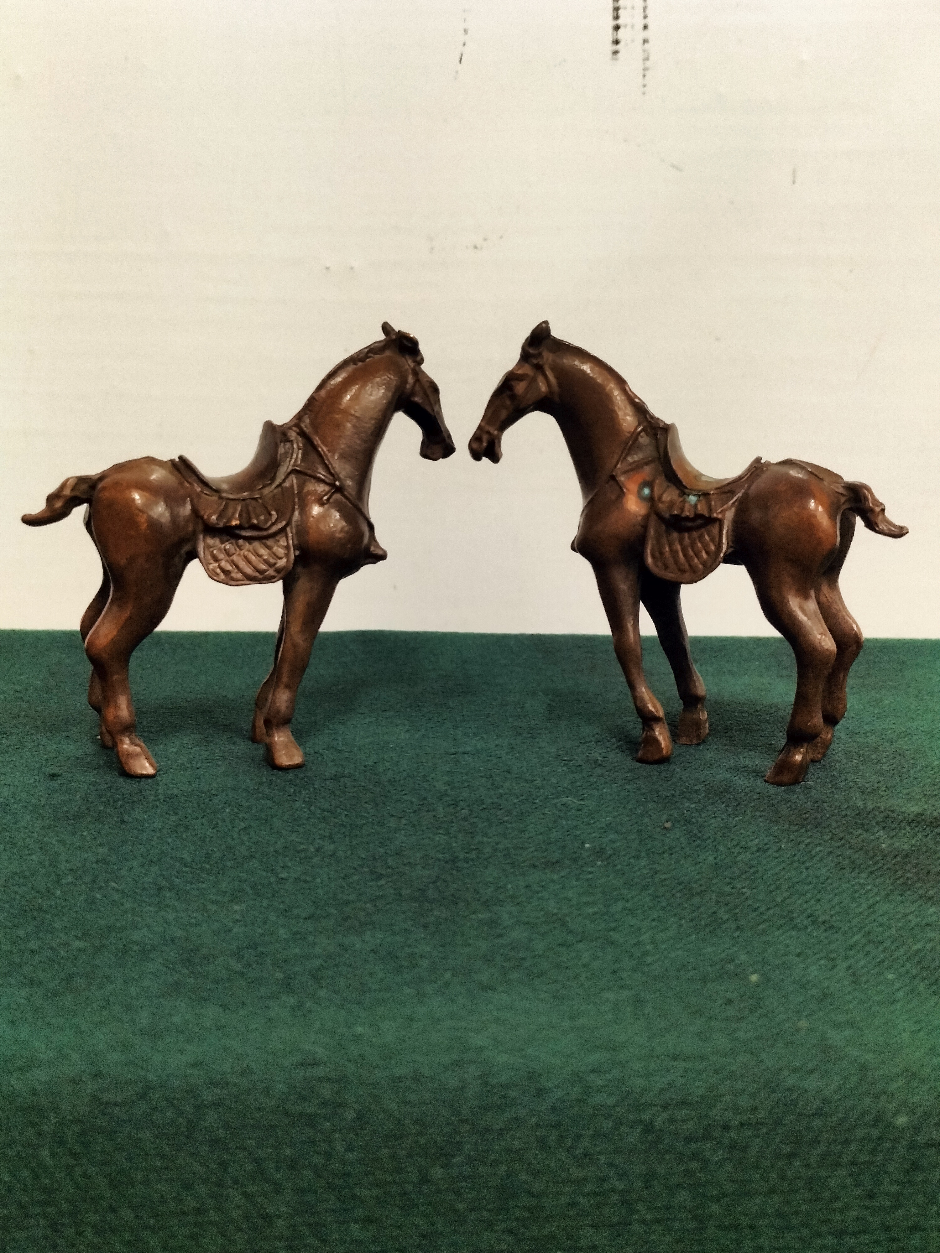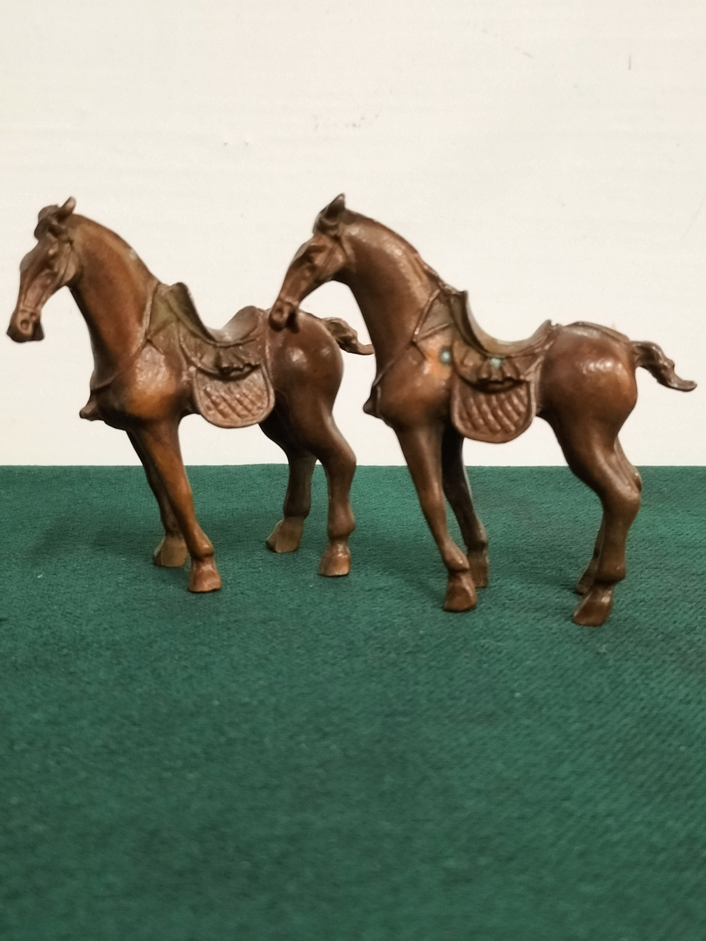 A pair of cast metal horse figurines, likely bronze or spelter, featuring a deep brown patinated finish. These figures are modelled in the traditional Tang Dynasty style, characterised by their arched necks, docked tails, and powerful, stylised musculature. Each horse is depicted fully caparisoned with intricate tack, including detailed bridles and saddles draped with textured blankets. The casting captures fine decorative elements in the saddlecloths and harness. These pieces are decorative interpretations of ancient Chinese funerary art, likely produced in the mid to late 20th century. No maker’s marks or signatures are present. Height: Approximately 8.5 cm.