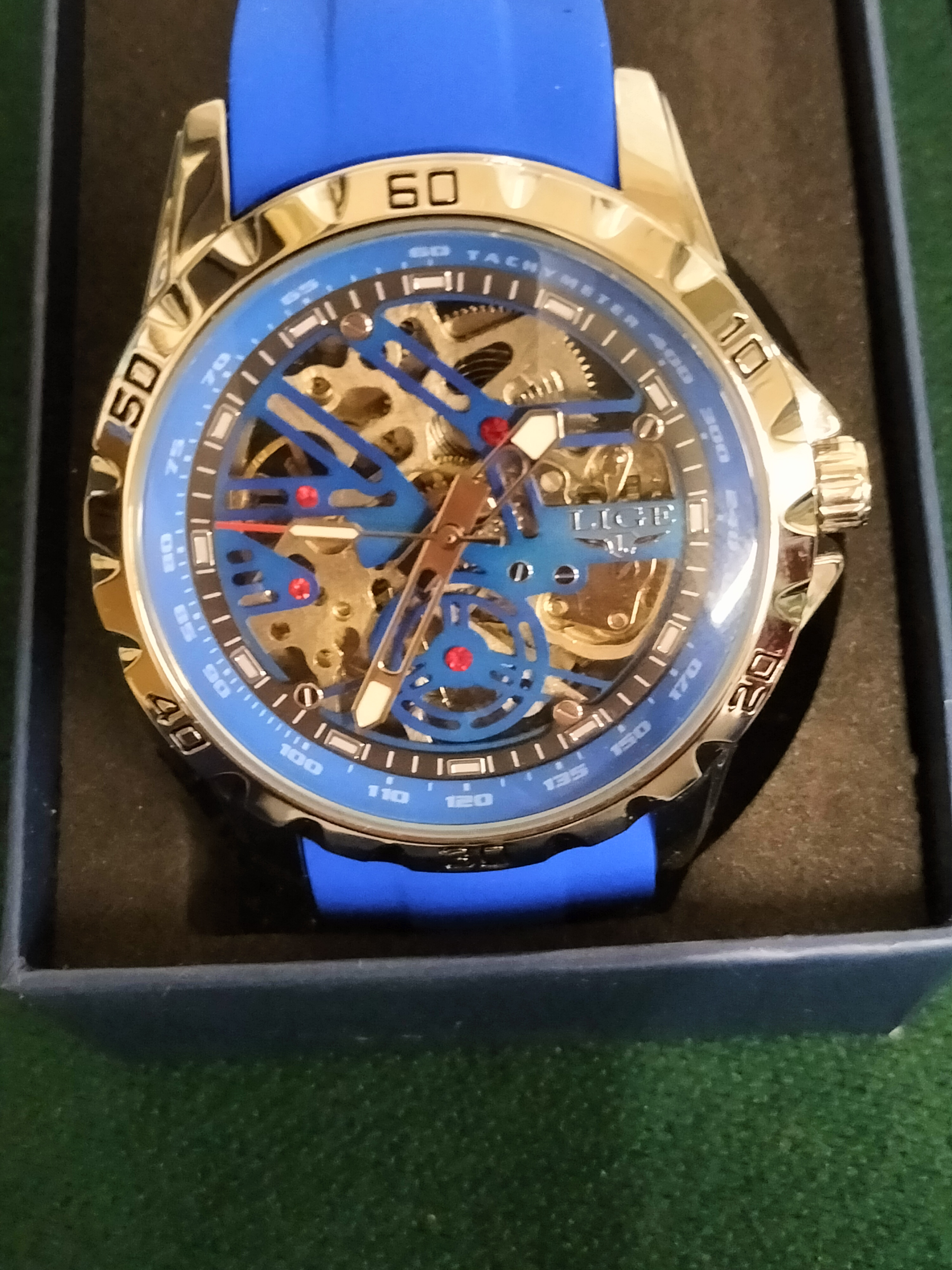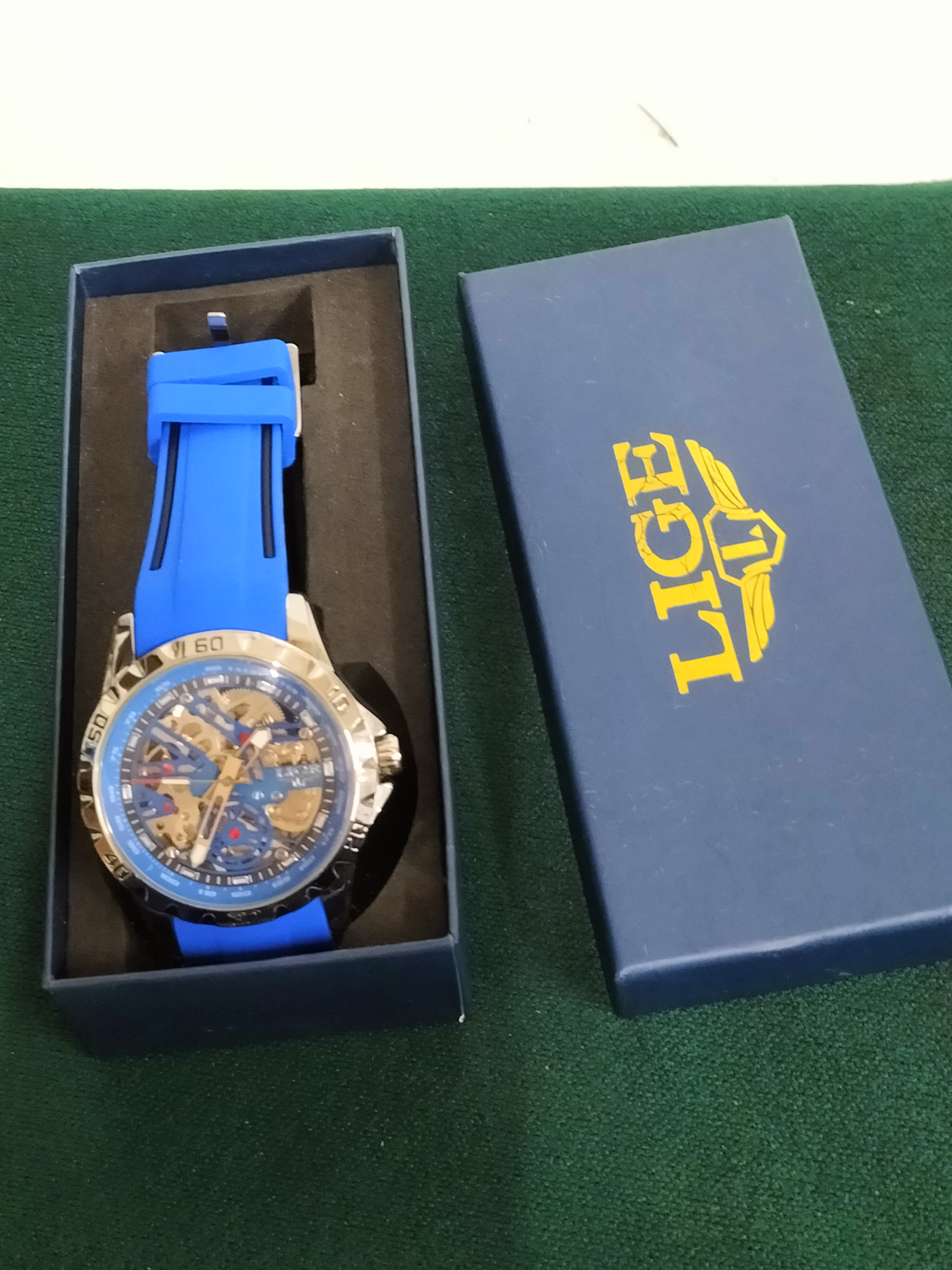 Brand: LIGE. Model: Skeleton Automatic Mechanical Fashion Watch. Reference: Not visible. Movement: Automatic mechanical self-winding. Case: Gold-tone polished metal alloy. Dial: Skeletonised design featuring blue accents, gold-tone mechanical components, a blue inner tachymeter bezel, and luminous hands. Bracelet: Integrated blue silicone strap with a gold-tone tang buckle. Serial: Not visible. Box/Papers: Accompanied by the original LIGE branded presentation box. Case size 43mm.