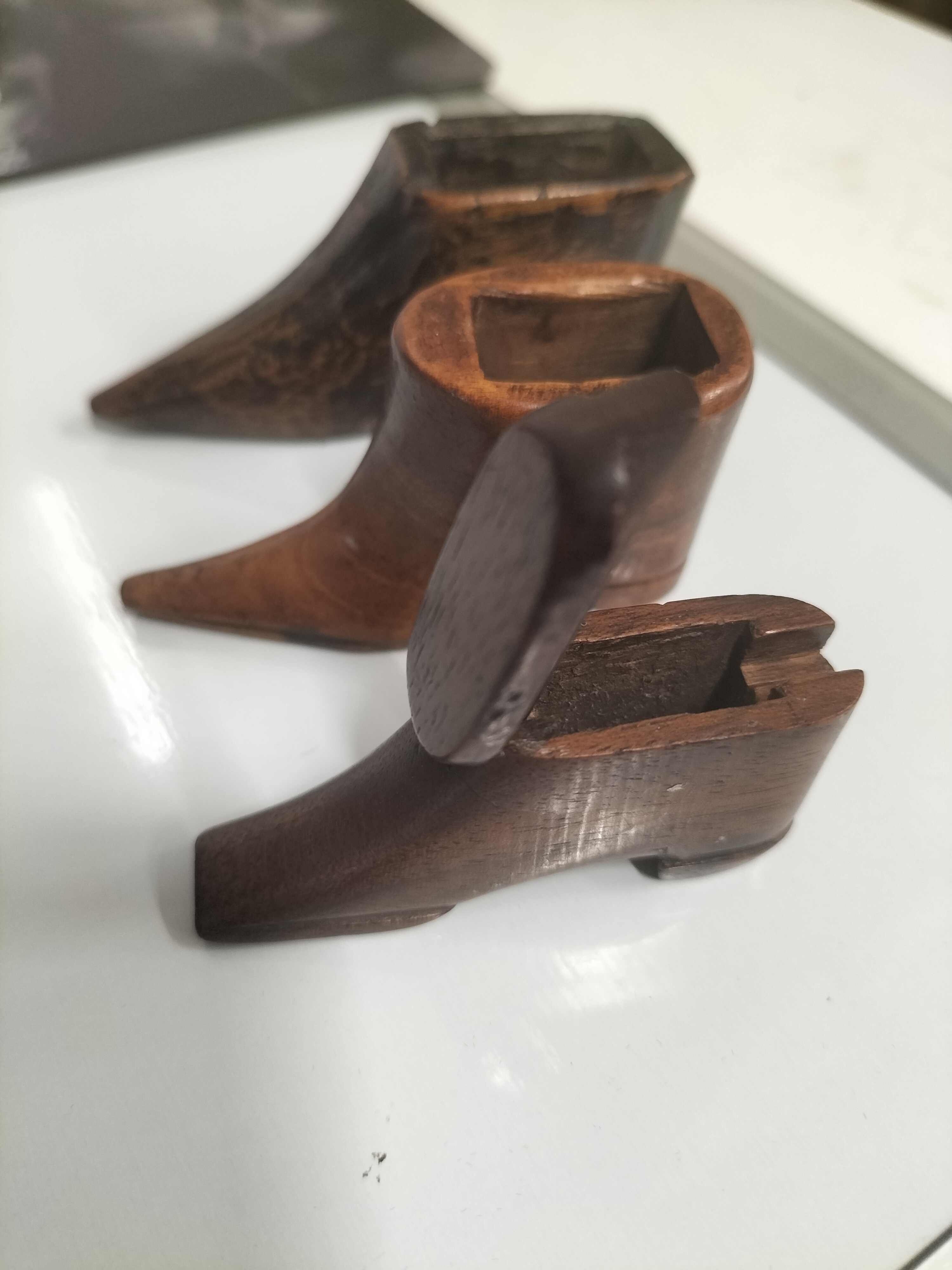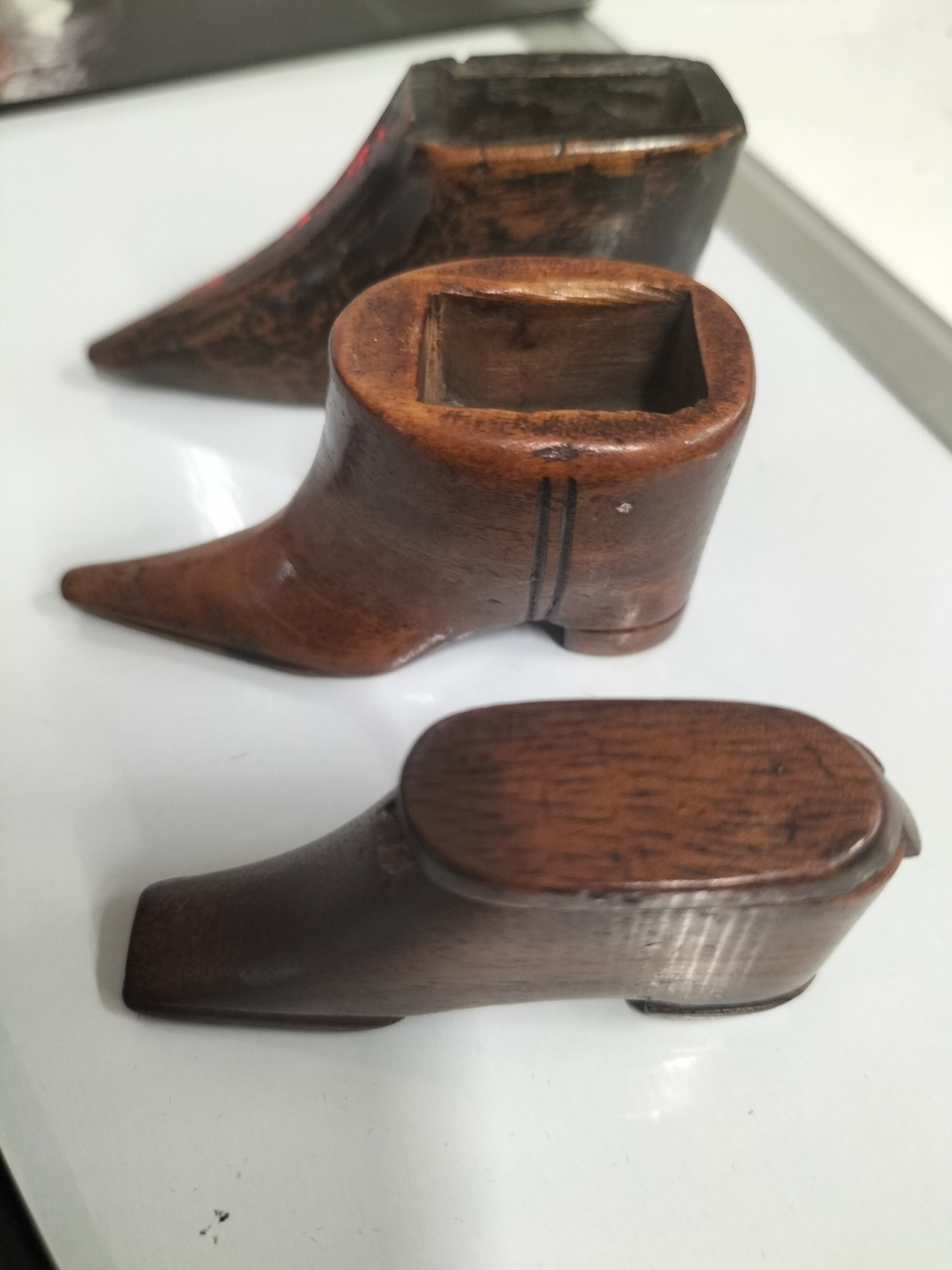 A collection of three miniature novelty snuff boxes, each hand-carved from dark-toned hardwoods, likely mahogany, in the form of various footwear styles. The group includes examples with pointed and square toes, low heels, and one featuring incised linear decoration to the sides. Each piece is hollowed to the interior to serve as a container, with one example retaining a functional swiveling lid. These items are characteristic of 19th-century European folk art, often referred to as treen, and were popular as whimsical personal accessories. The wood exhibits a deep, polished patina developed through age and handling. No maker’s marks or signatures are present. Length: approximately 7 cm – 10 cm each.