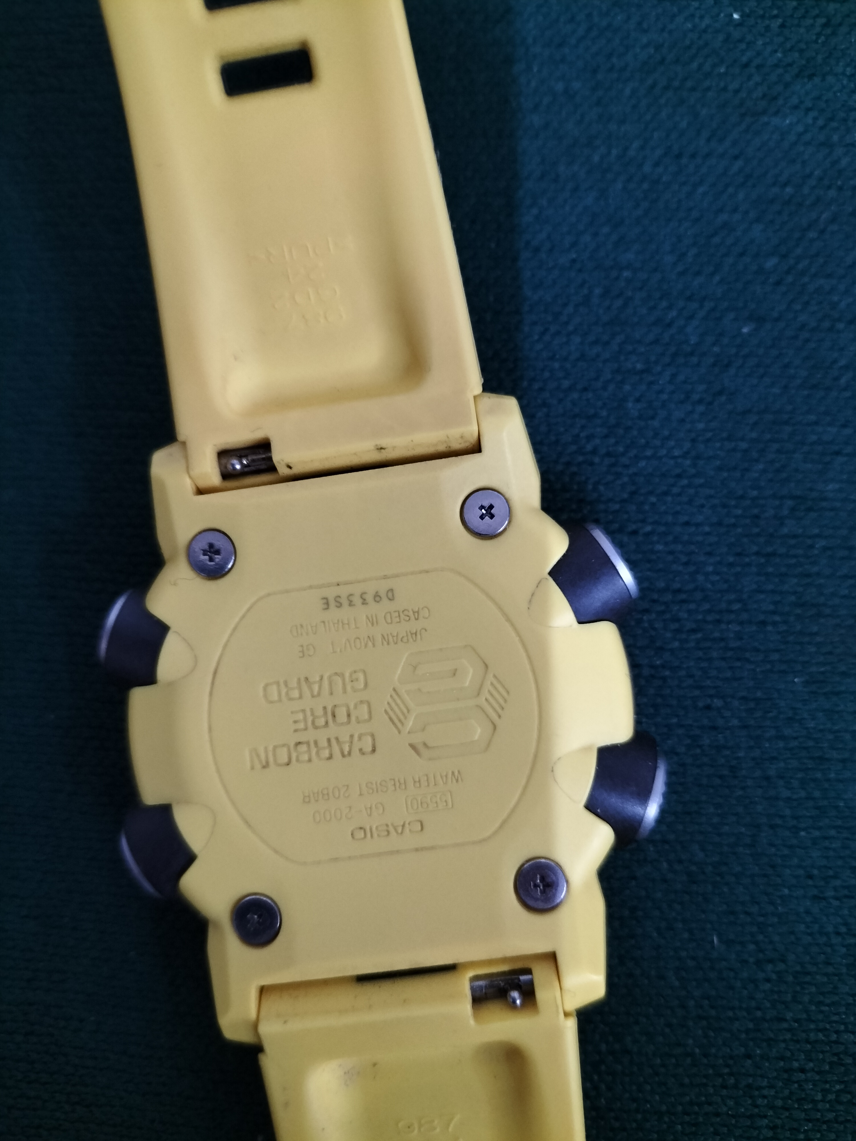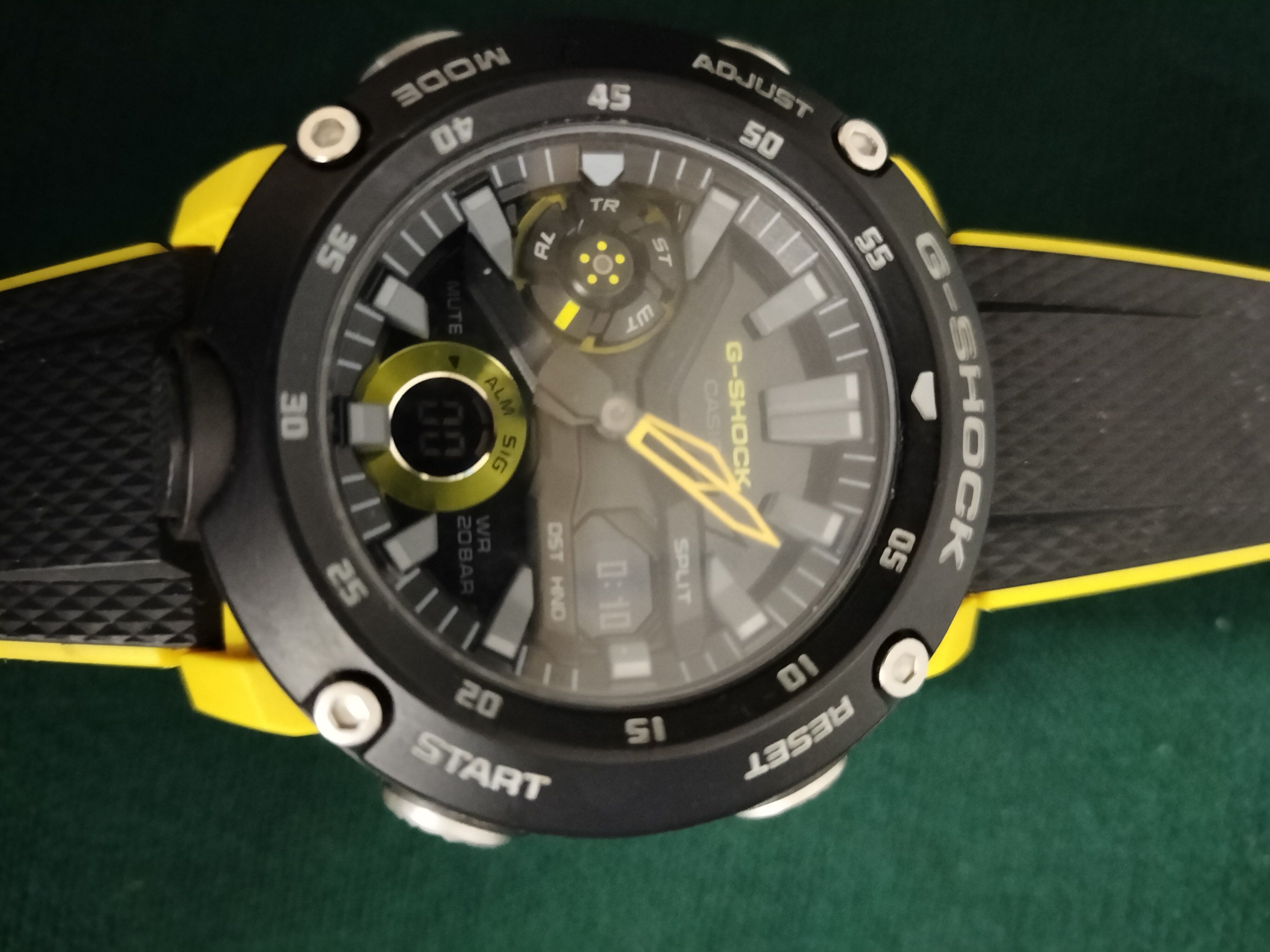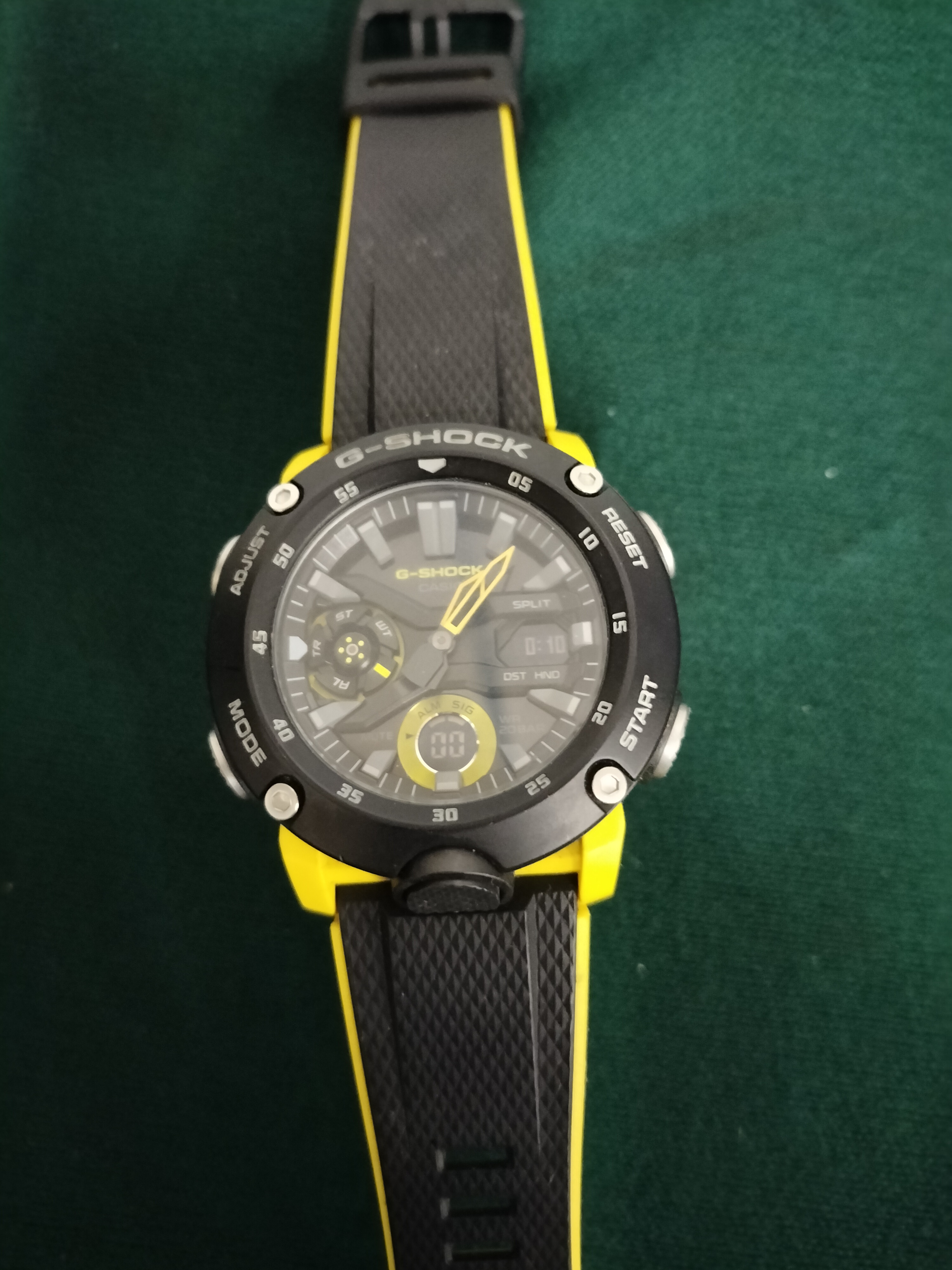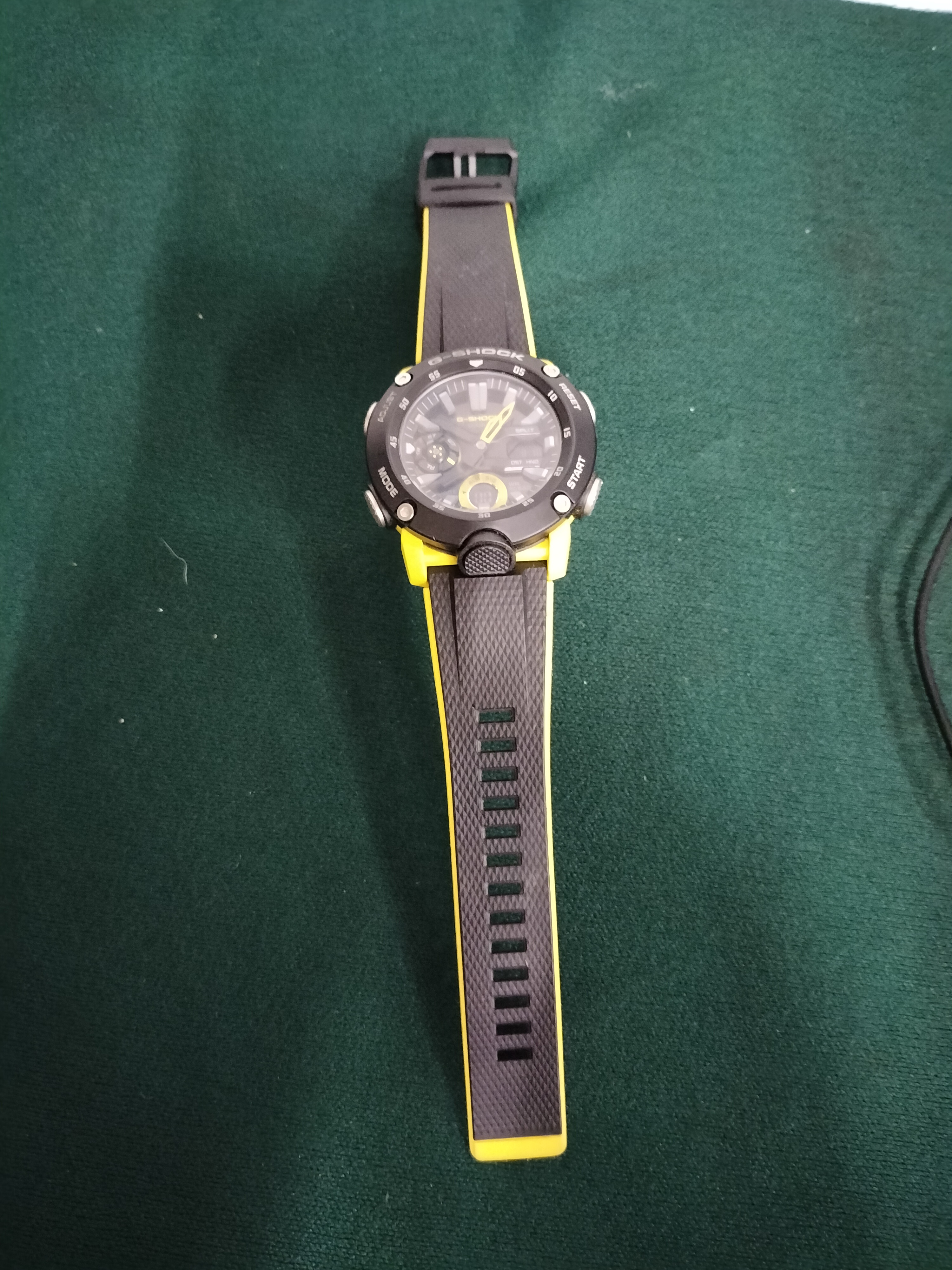 Brand: Casio. Model: G-Shock GA-2000 Carbon Core Guard. Reference: GA-2000-1A9. Movement: Quartz Module 5590. Case: Carbon-reinforced resin with a yellow outer casing and black resin bezel. Dial: Dark grey textured dial with yellow accents, featuring analog hands and dual digital displays. Bracelet: Original bi-colour resin strap in black and yellow. Serial Number: D933SE. Box and papers are not included. Case size: 48.7mm.