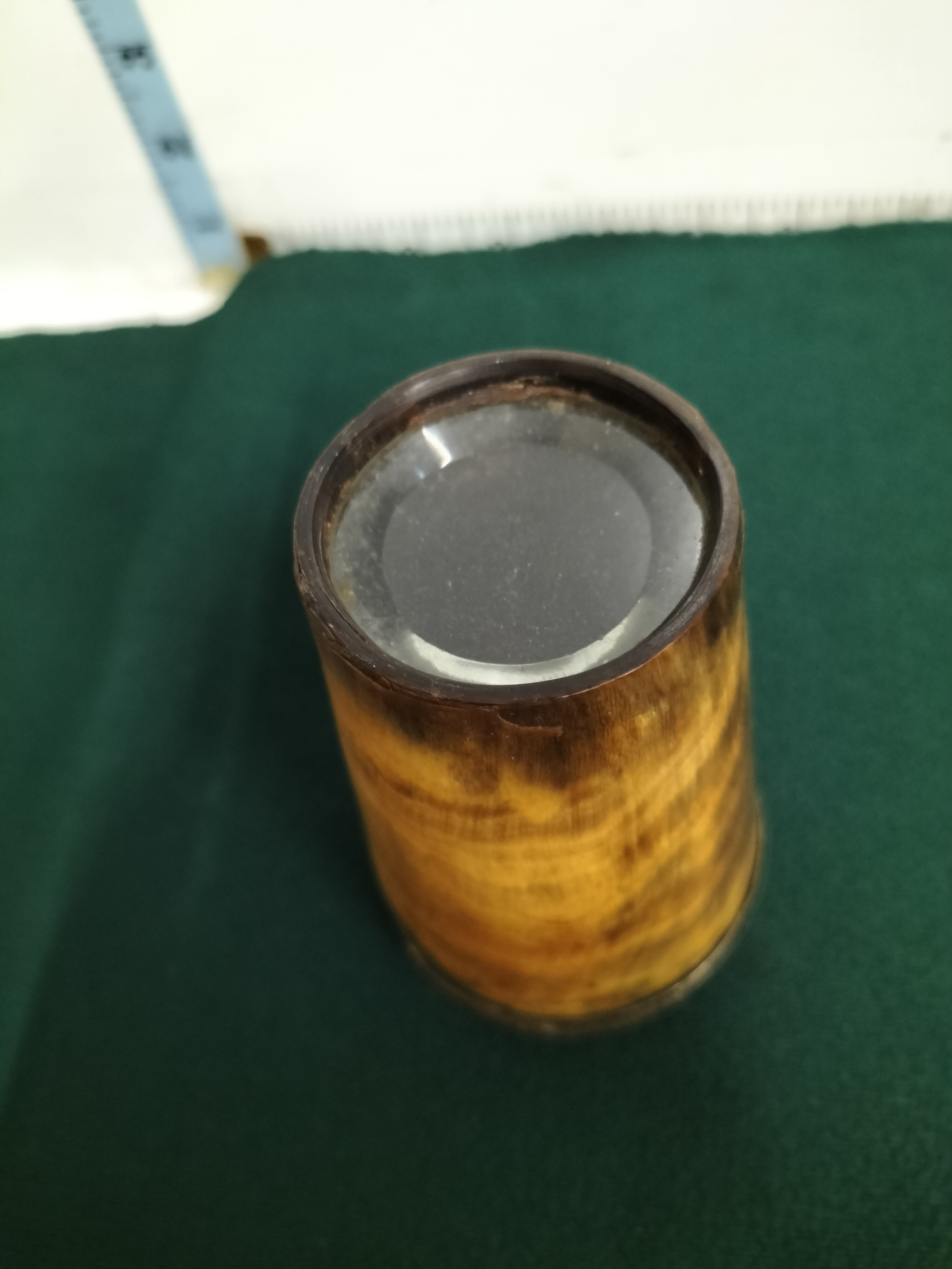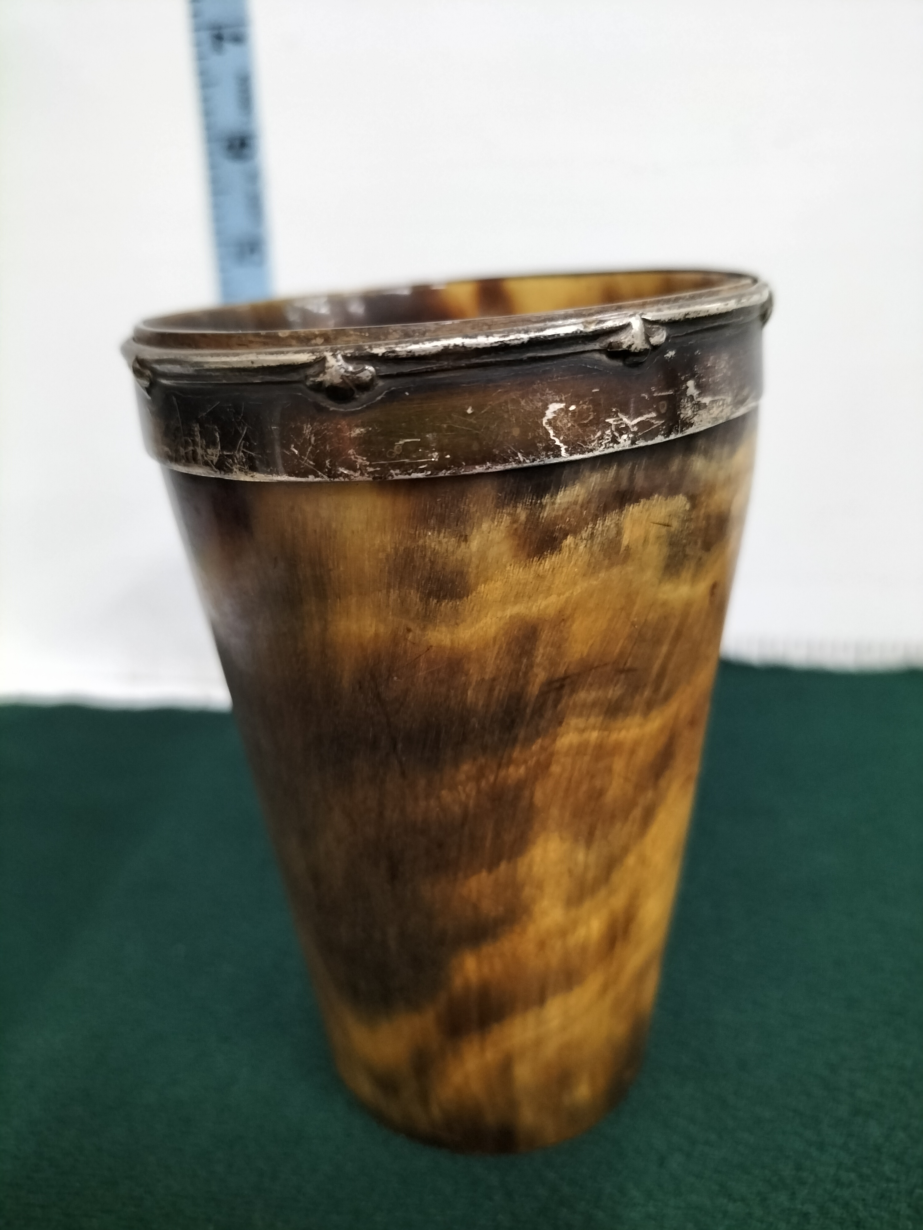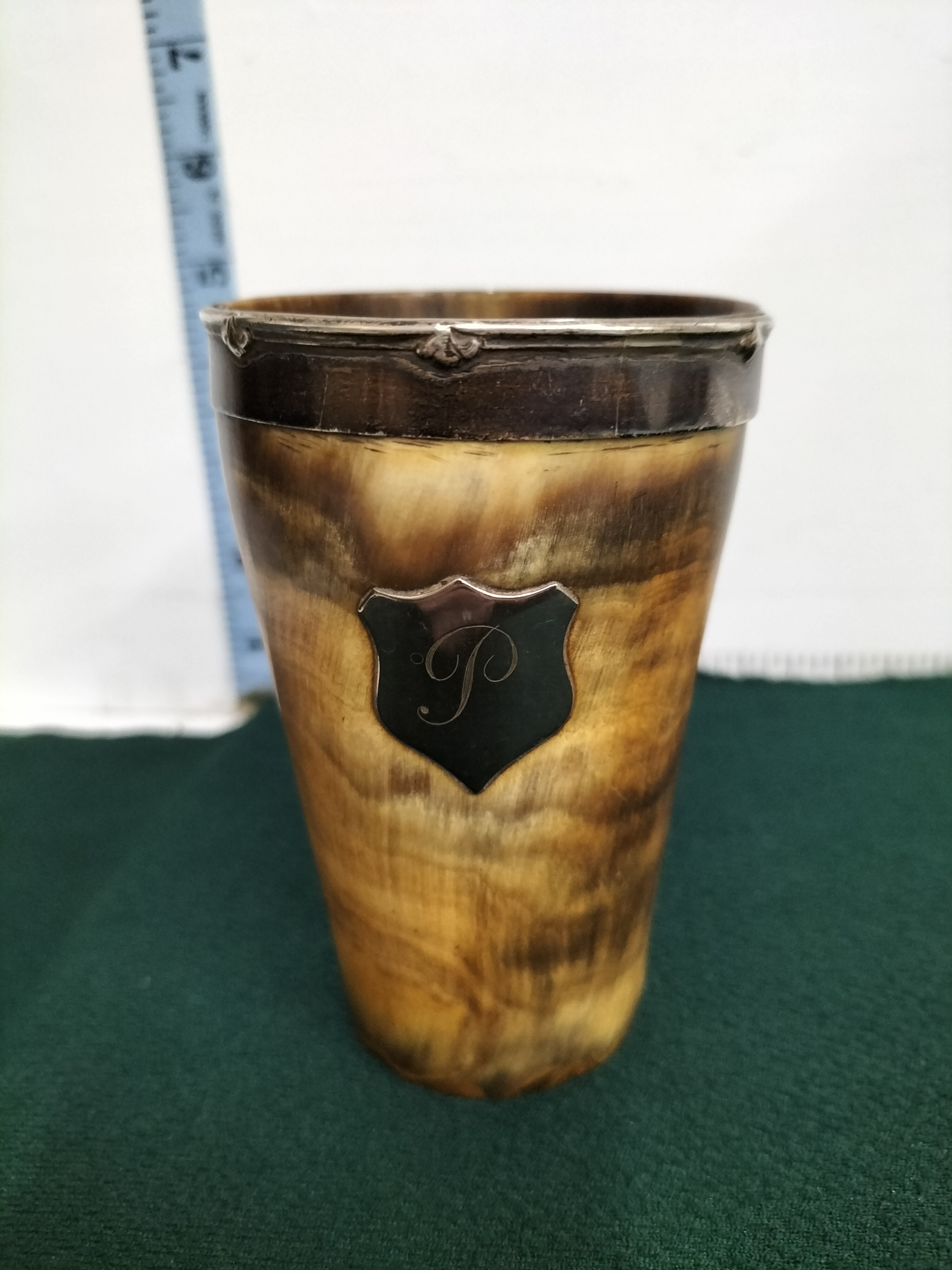 A Victorian-period tapered beaker of traditional sporting design, crafted from variegated natural horn. The body displays characteristic natural banding in tones of amber, cream, and dark brown. The vessel is fitted with a silver-toned metal rim and an applied shield-shaped metal cartouche to the front, featuring an engraved cursive monogram P. A distinctive feature of this piece is the inset clear glass base, a design common in 19th-century hunting and campaign cups to ensure the clarity of the beverage or for visibility during use. The metal mounts show no visible hallmarks and are likely silver plate or white metal. Height: approximately 11.5 cm.