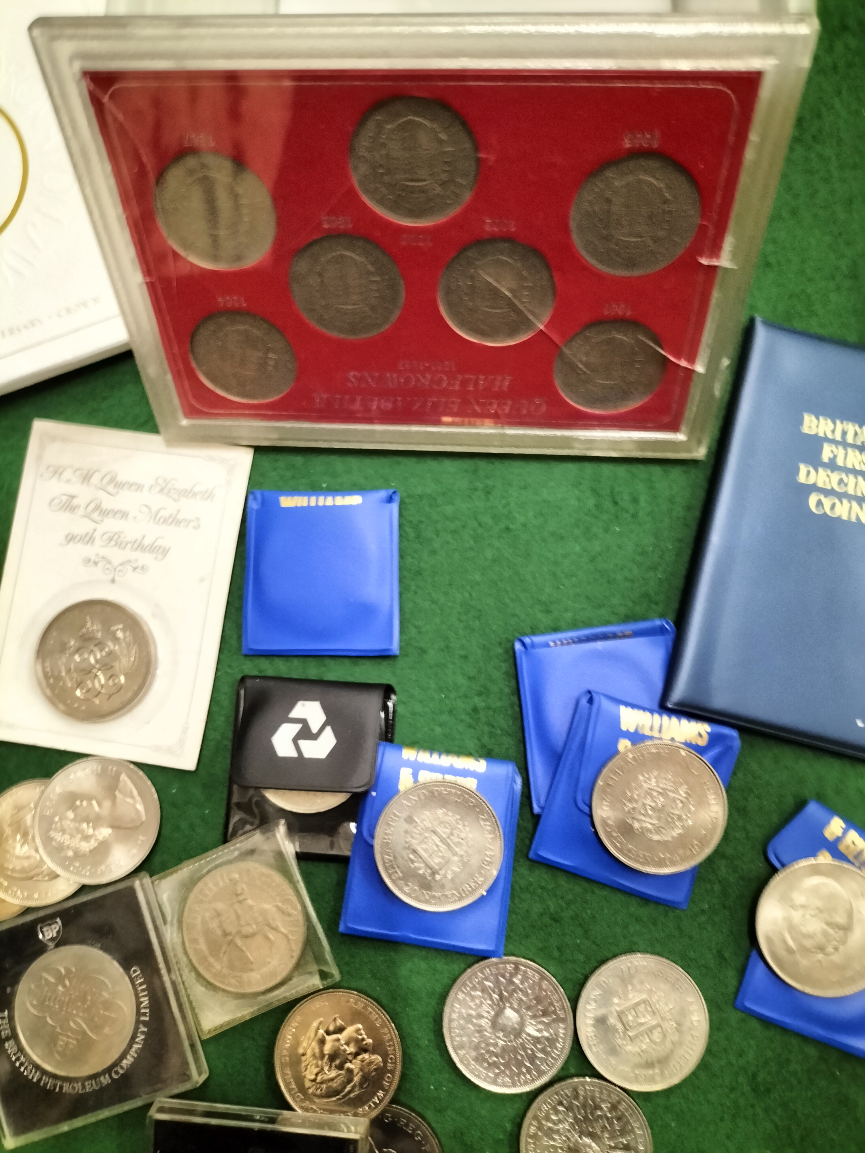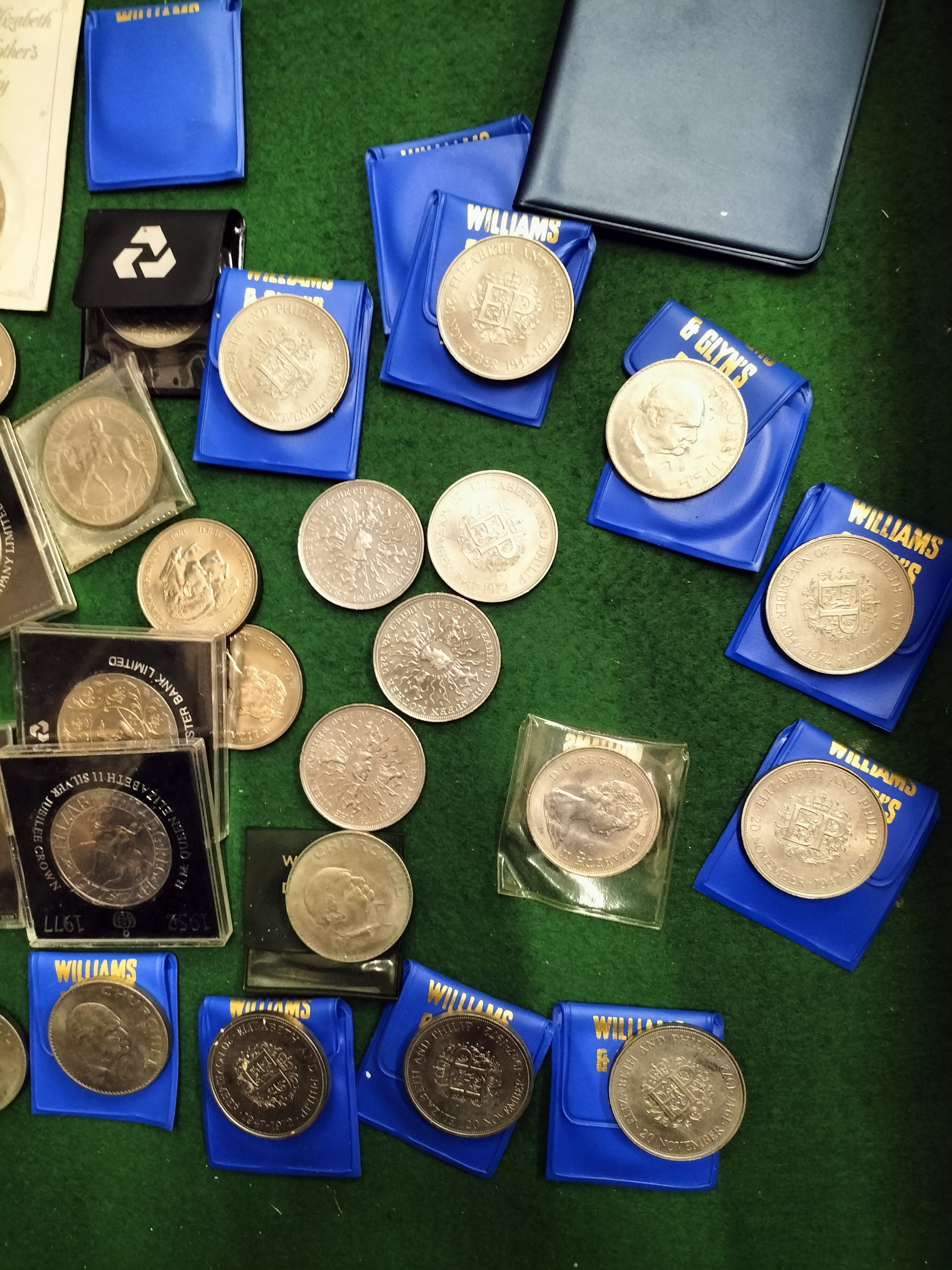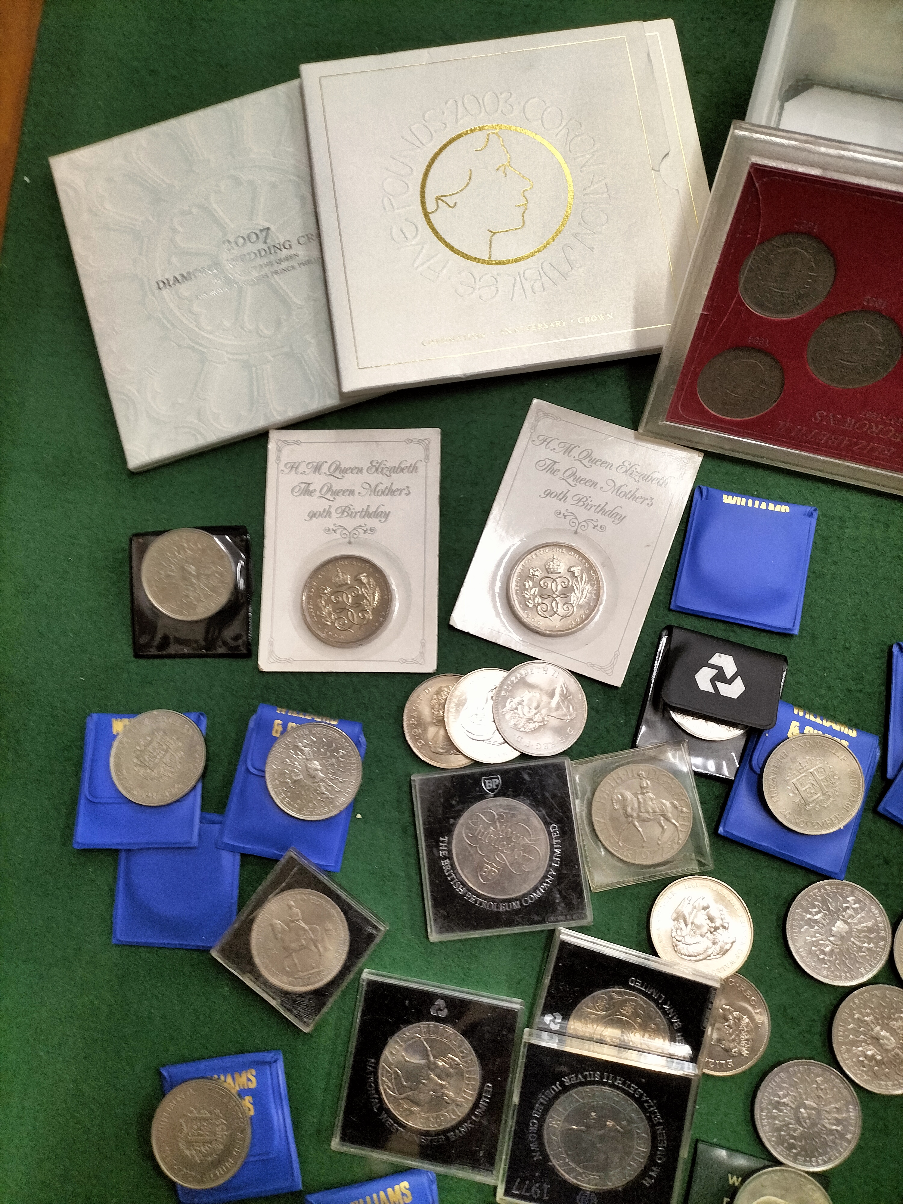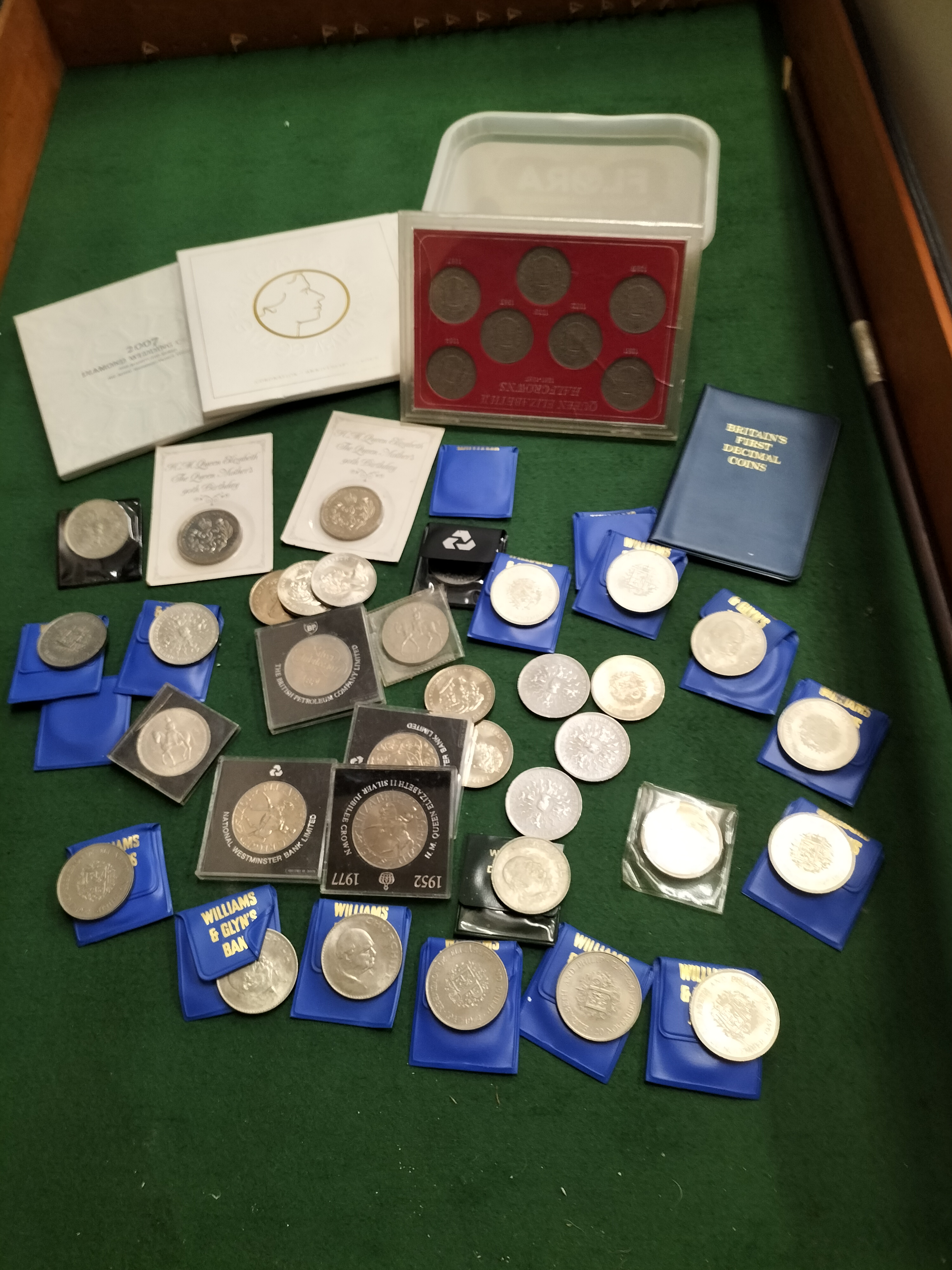 A collection of United Kingdom commemorative coinage and sets. Includes a cased set of Queen Elizabeth II halfcrowns dated 1953 to 1967 and a Britain’s First Decimal Coins folder. Featured boxed issues include a 2003 Coronation Jubilee five-pound coin and a 2007 Diamond Wedding crown. The lot contains a significant quantity of cupro-nickel crowns including 1965 Winston Churchill memorials (KM-910), 1972 Silver Wedding commemoratives (KM-917), 1977 Silver Jubilee crowns (KM-920), 1980 Queen Mother 90th birthday issues (KM-921), and 1981 Royal Wedding crowns (KM-925). Many crowns are housed in original promotional vinyl pouches from Williams & Glyn’s Bank and National Westminster Bank.