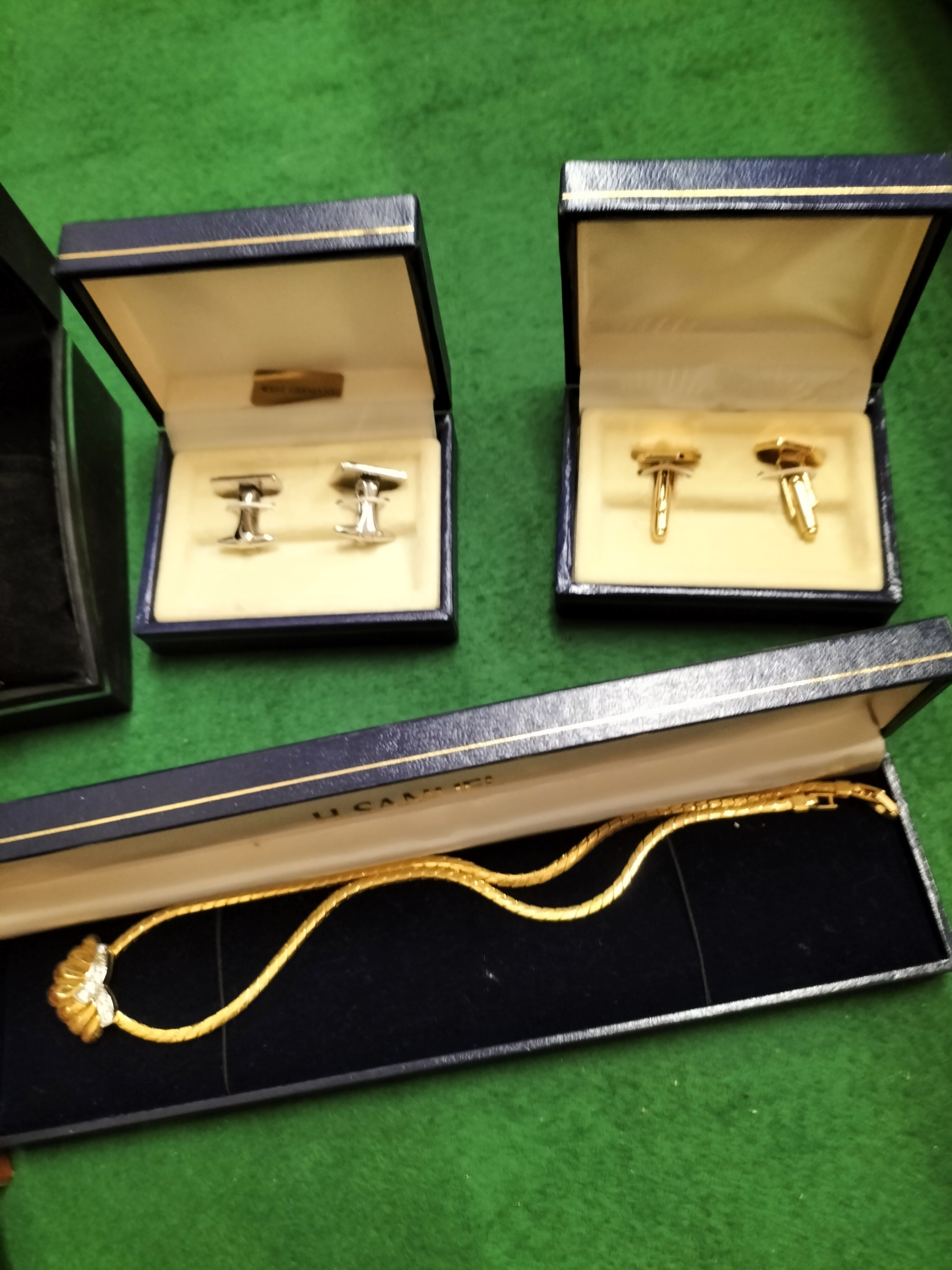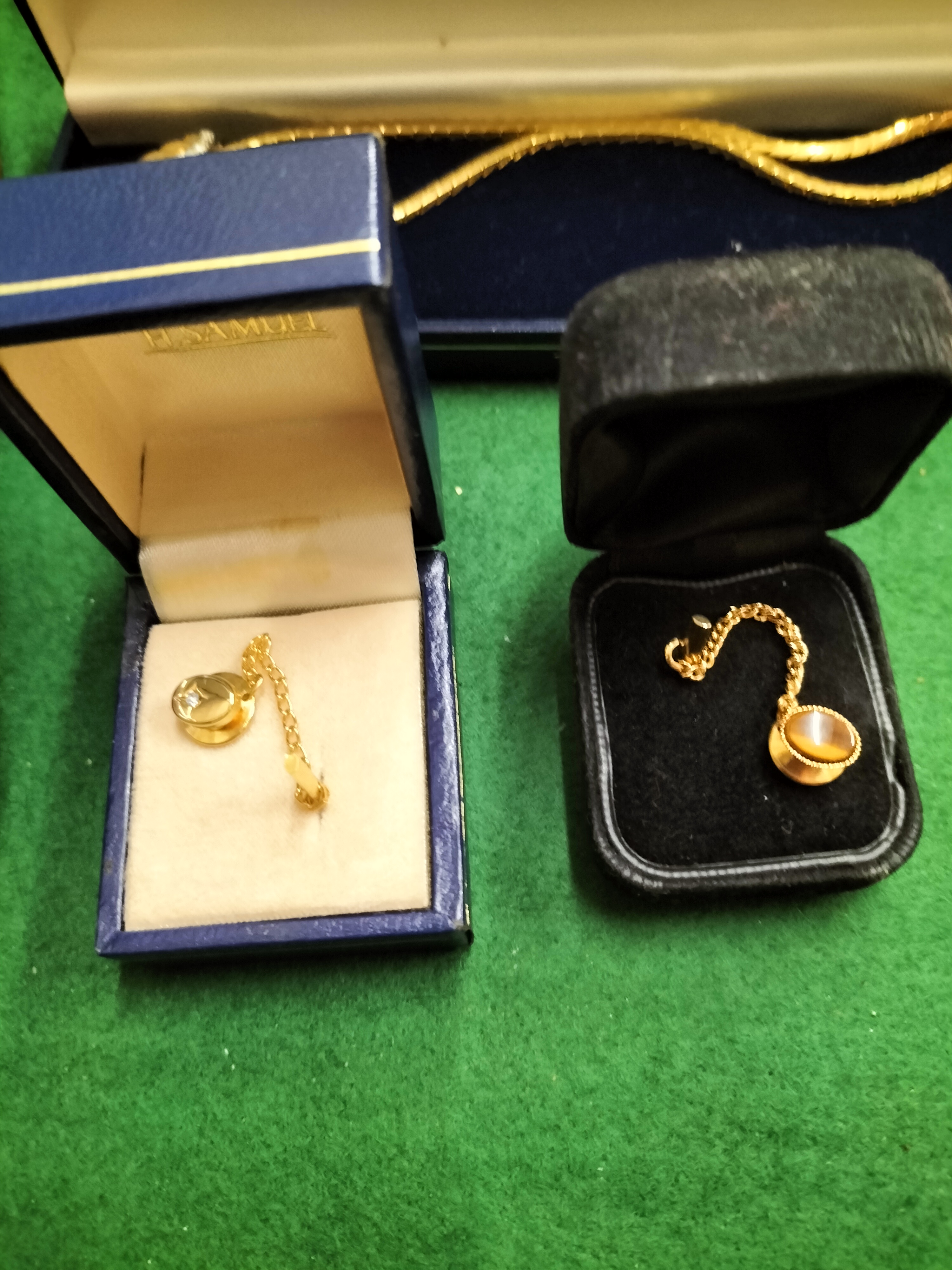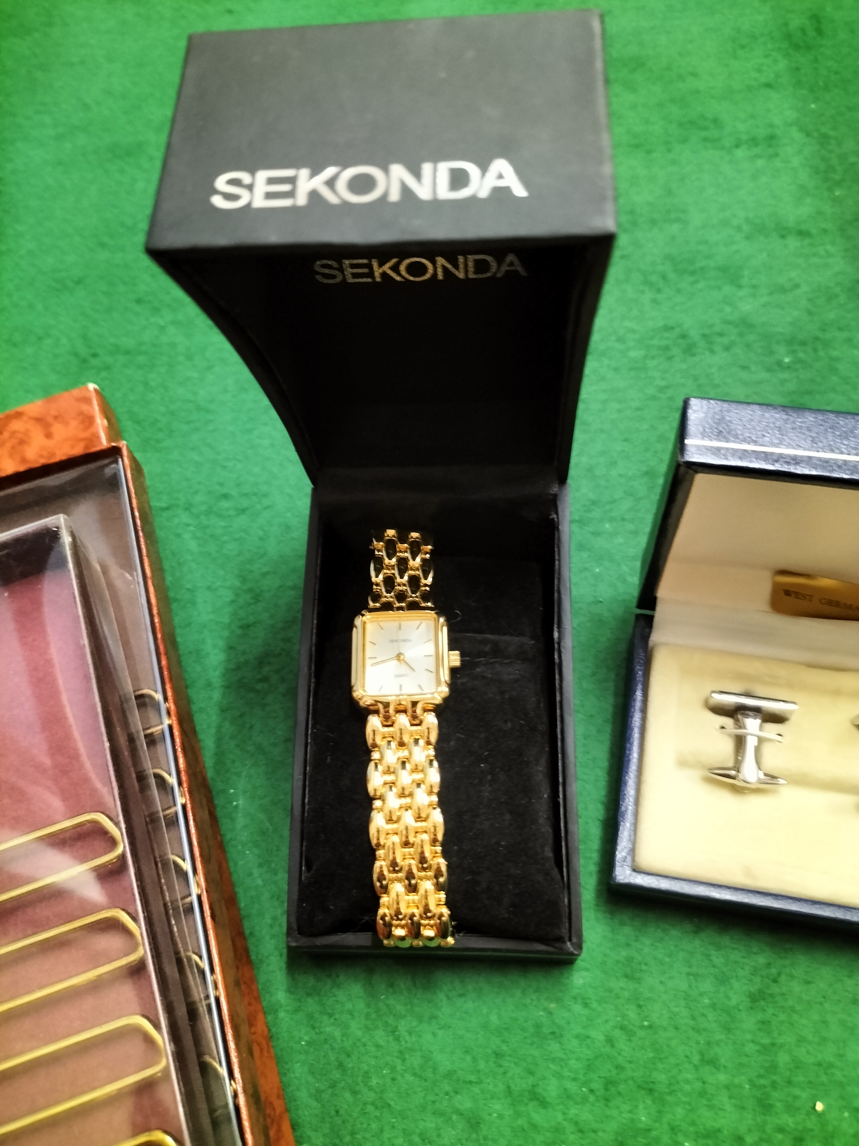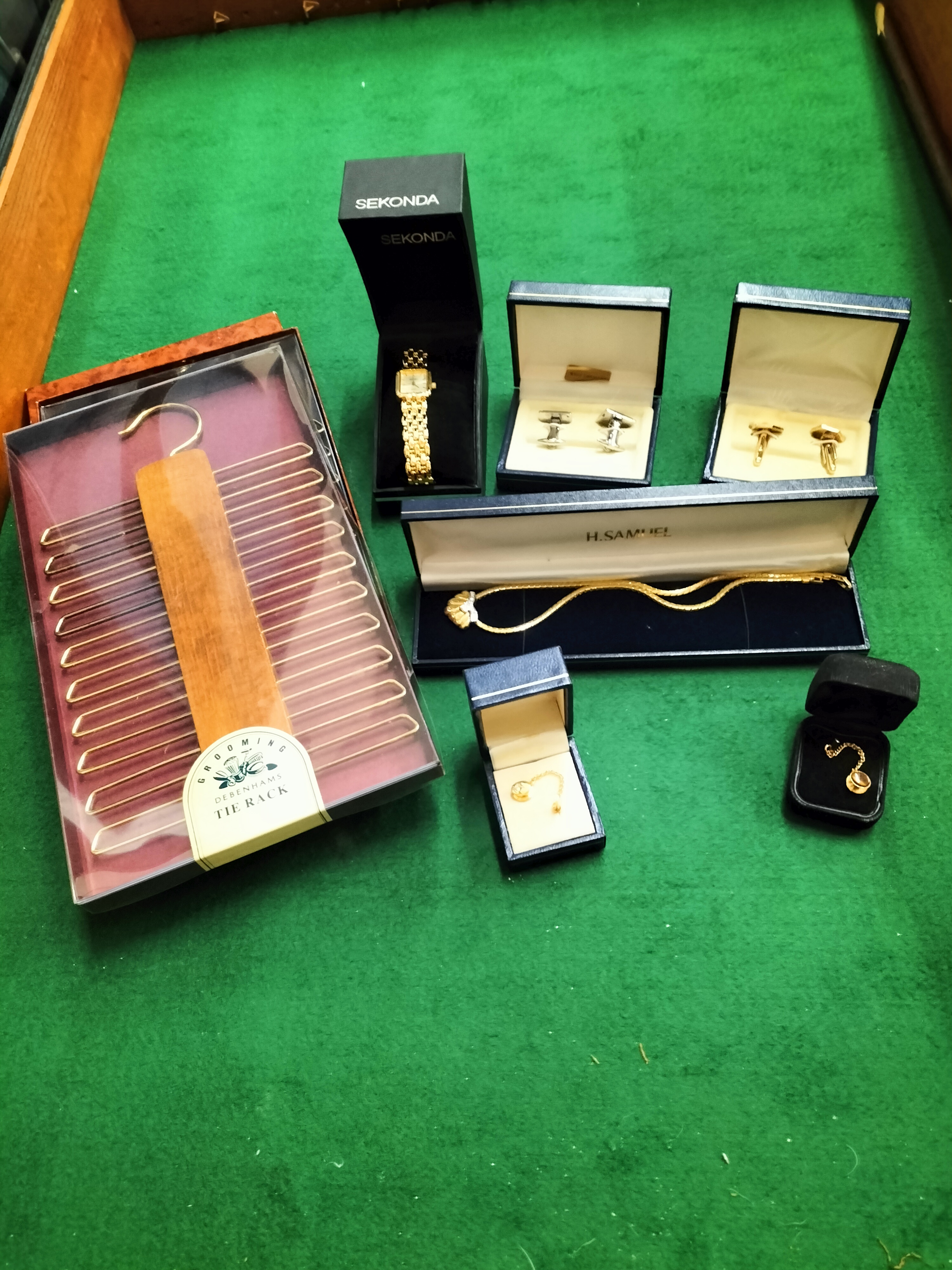 A varied collection of costume jewellery and men’s accessories. The lot features a ladies’ Sekonda quartz wristwatch with a gold-tone finish, a square dial with baton hour markers, and a decorative articulated link bracelet, housed in its original retail box. Included is a gold-tone snake-link necklace with a central shell-motif element set with small clear accent stones that appear to be crystals, presented in an H. Samuel presentation case. The collection also contains two pairs of T-bar cufflinks, one silver-tone and one gold-tone, and two tie tacks. One tie tack is set with a small clear stone, and the other features an oval brownish cabochon that appears to be tiger’s eye, complete with a safety chain. Additionally, the lot includes a boxed Debenhams wooden and wire tie rack. All jewellery pieces appear to be gold-plated or base metal; no hallmarks are visible.