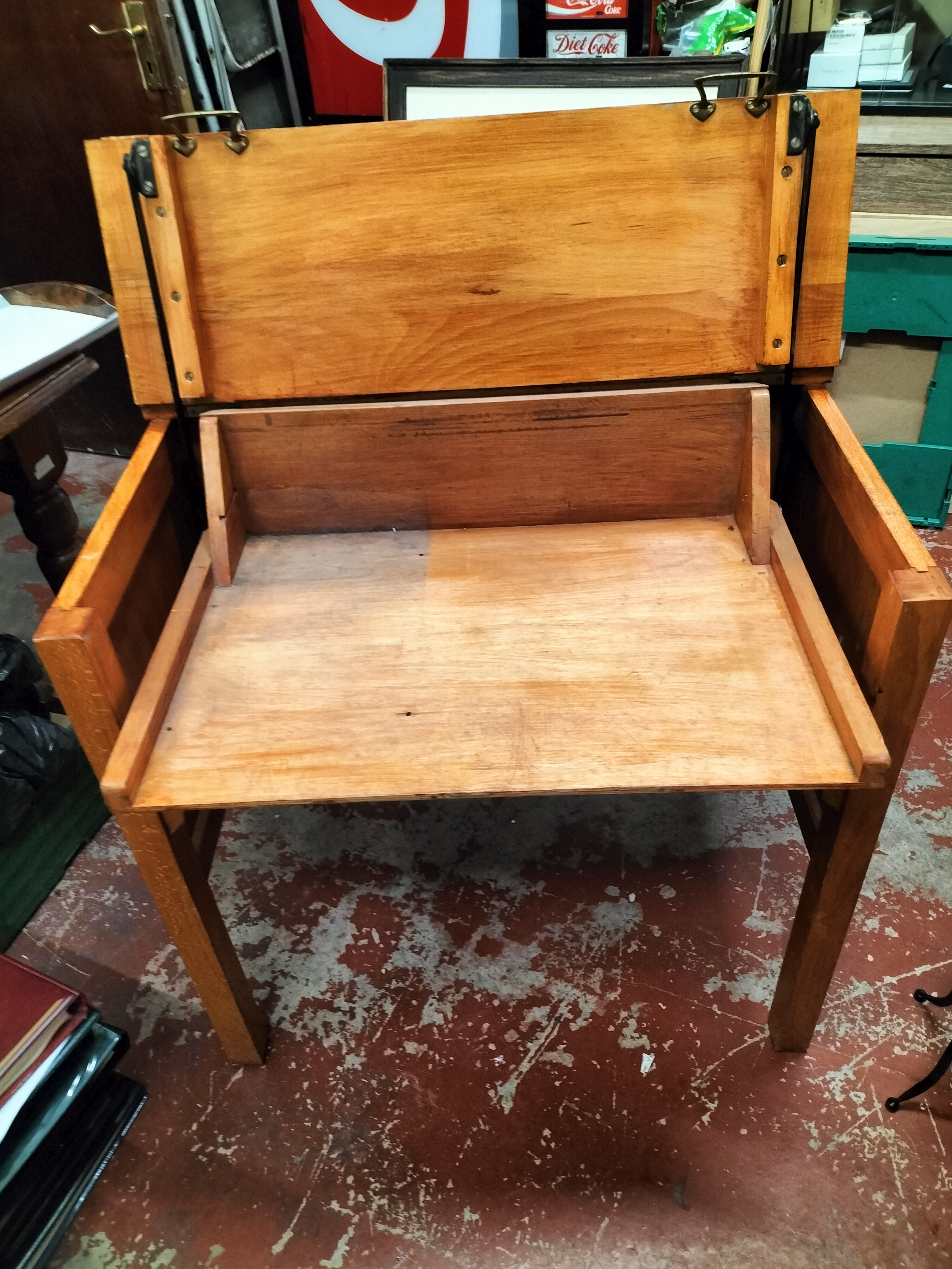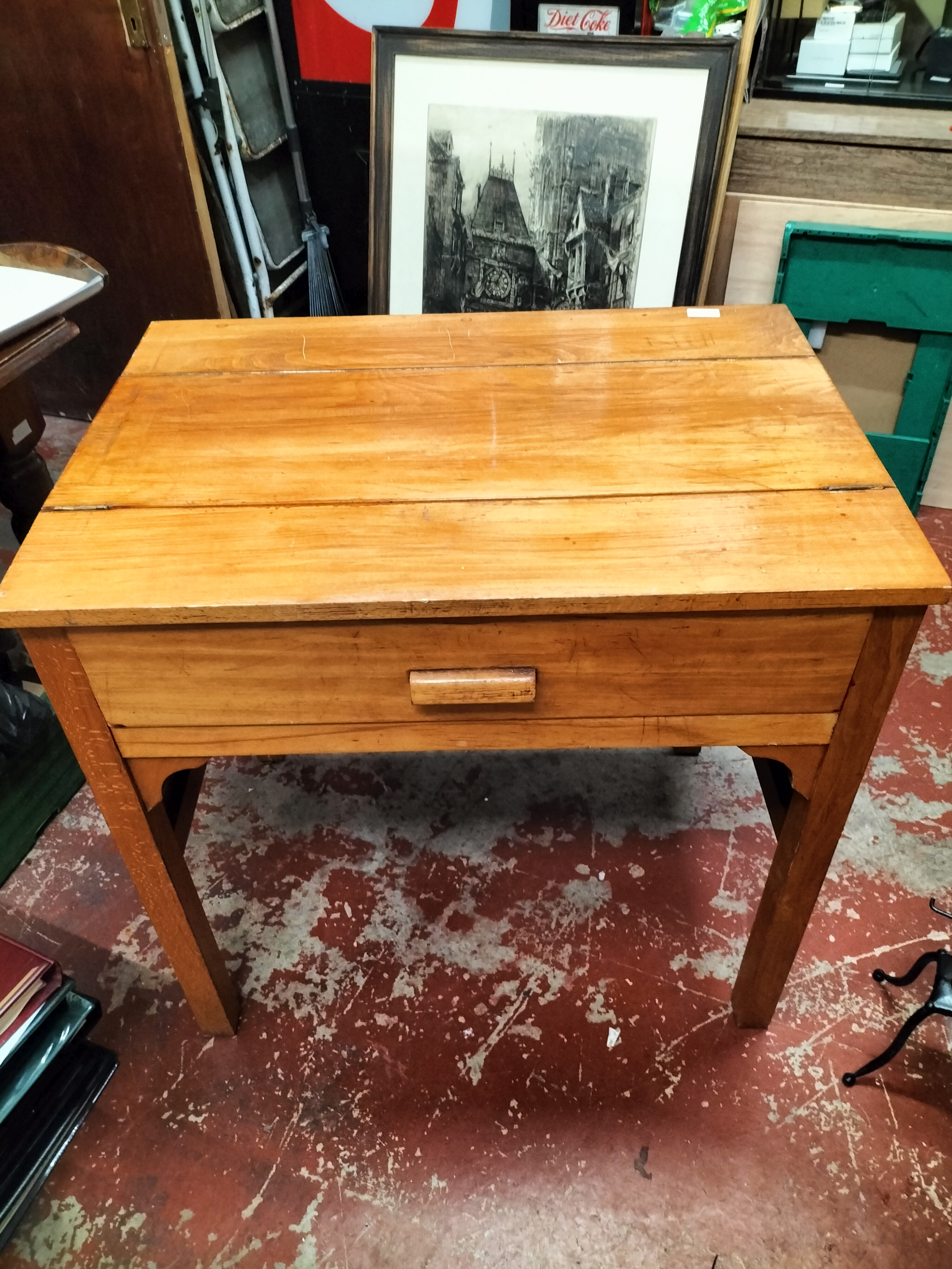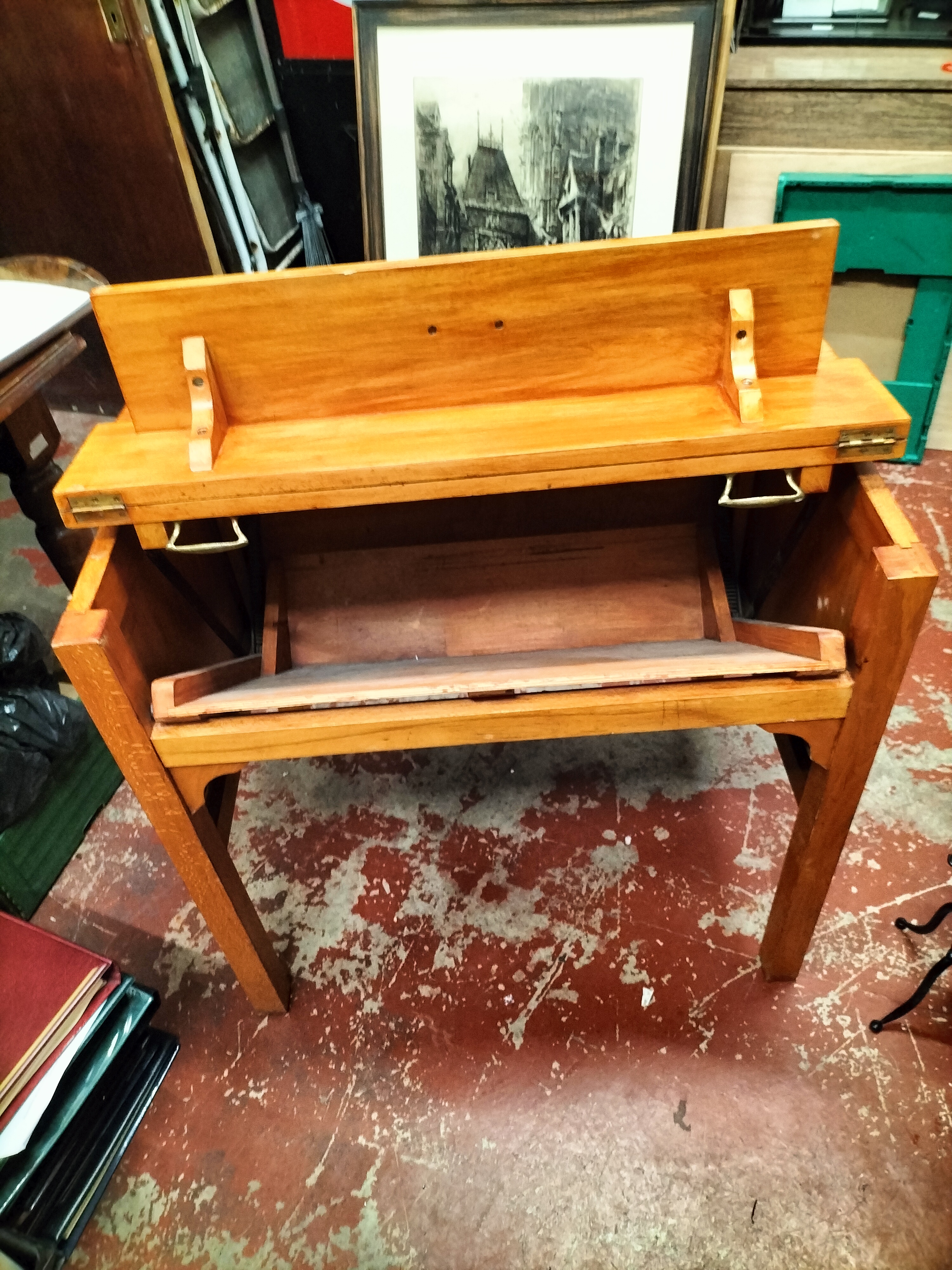 A late 19th to early 20th-century mechanical writing desk of metamorphic design, constructed from solid light-coloured hardwoods, likely oak and beech, with a warm honey-coloured finish. The piece features a sophisticated multi-part hinged top that unfolds via a series of metal sliding mechanisms and brass hinges to reveal a tiered interior with a slanted writing surface and integrated brass-toned bale handles. The desk stands on four square-tapered legs joined by a simple apron with arched corner brackets, and the front face features a single utilitarian wooden handle. The interior components appear to be constructed of a secondary softwood such as pine. This design reflects the transition from primitive school furniture to more complex mechanical domestic pieces of the late Victorian period. Dimensions: H 82cm x W 76cm x D 51cm.