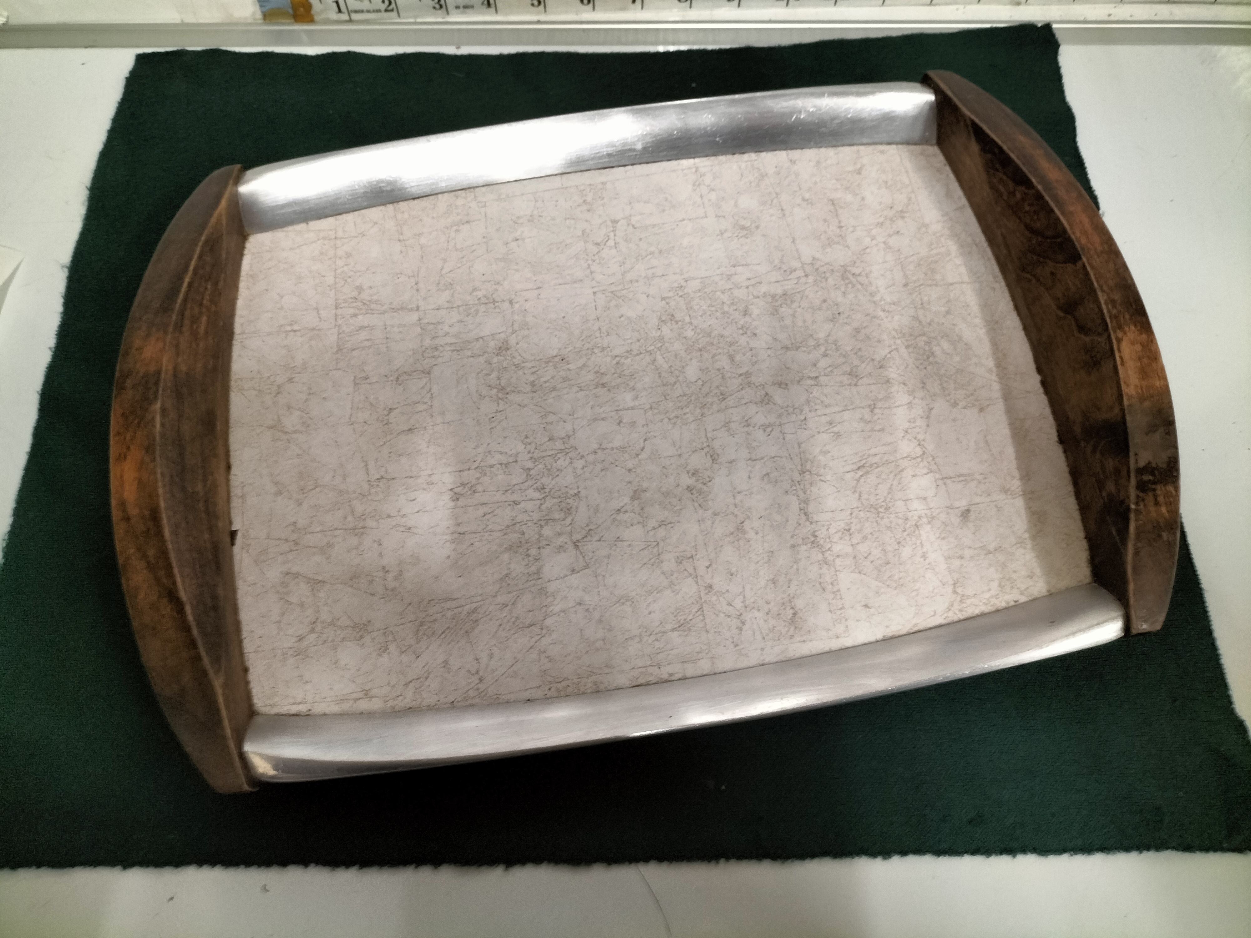 A rectangular Mid-Century Modern serving tray featuring a polished aluminium frame with distinctive curved side handles in a dark-stained wood. The centre of the tray is inset with a composite laminate material displaying a neutral-toned cracked ice or parchment-style pattern, characteristic of 1950s and 1960s design. The underside reveals the structural integration of the wooden handles secured to the metallic frame. This piece exemplifies the functionalist aesthetic of the era, blending industrial metals with organic wooden elements and synthetic surfaces. Dimensions: Approximately 39.4 cm (15.5 inches) in length.