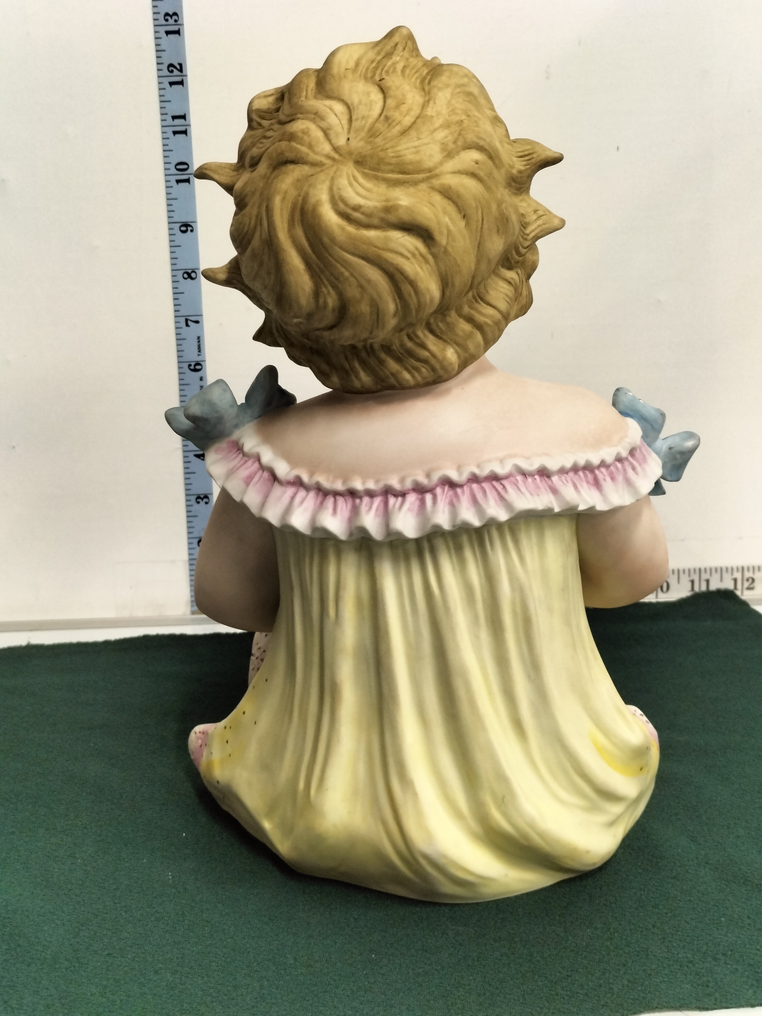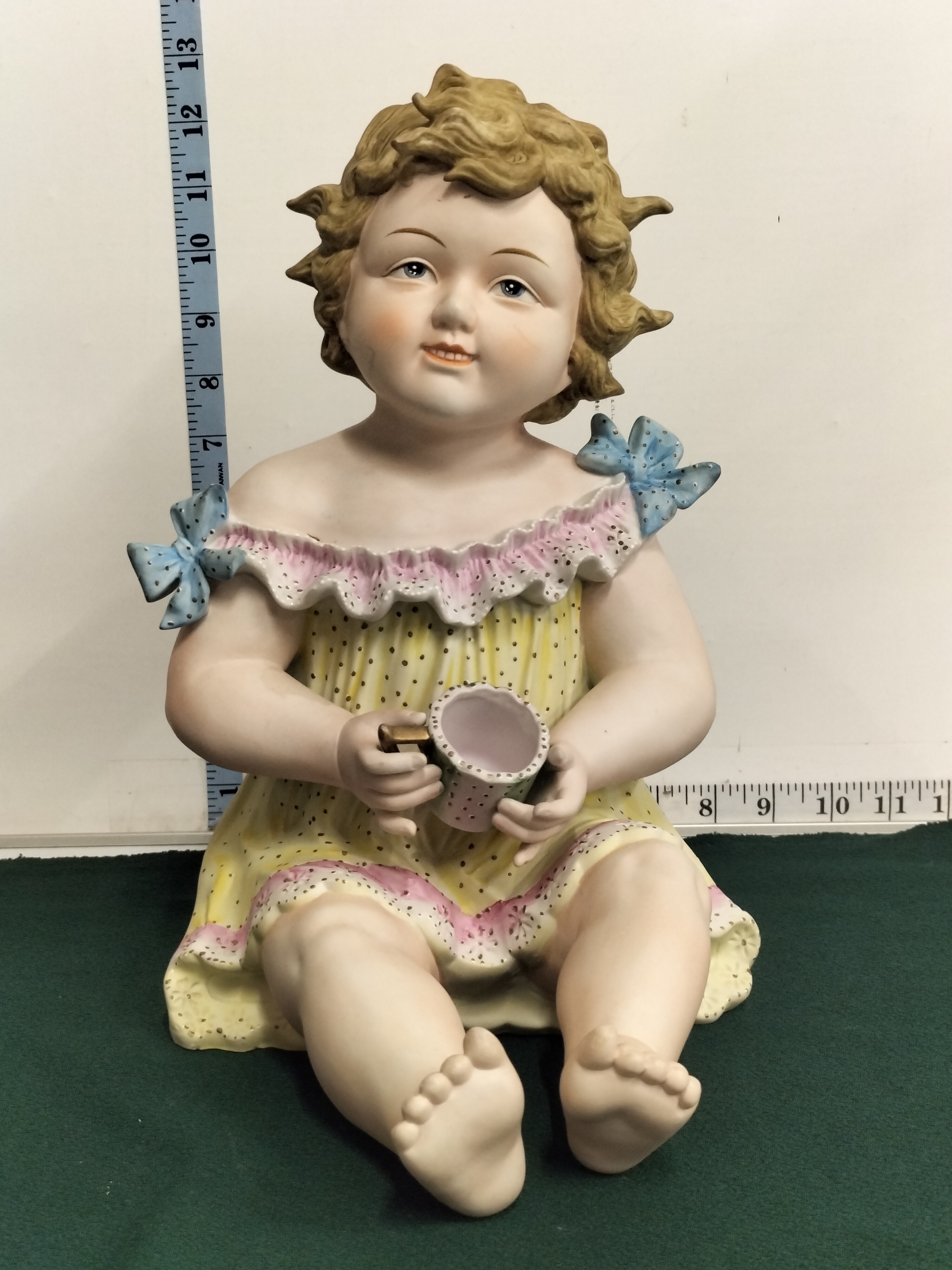 A large-scale hand-painted bisque porcelain figurine attributed to Andrea Sadek, depicting a seated toddler girl in the traditional piano baby style. The figure features finely detailed curly blonde hair, blue eyes, and a pleasant facial expression. She is dressed in a pale yellow dotted dress with a ruffled pink and white collar and hem, accented by blue bows on each shoulder. The child is shown holding a small matching decorative mug in both hands. The piece exhibits a characteristic matte, unglazed finish allowing for soft, blended colour application. While no factory marks are visible in the photographs, this model is consistent with the 6111X series produced by Sadek. Height: 33 cm.
