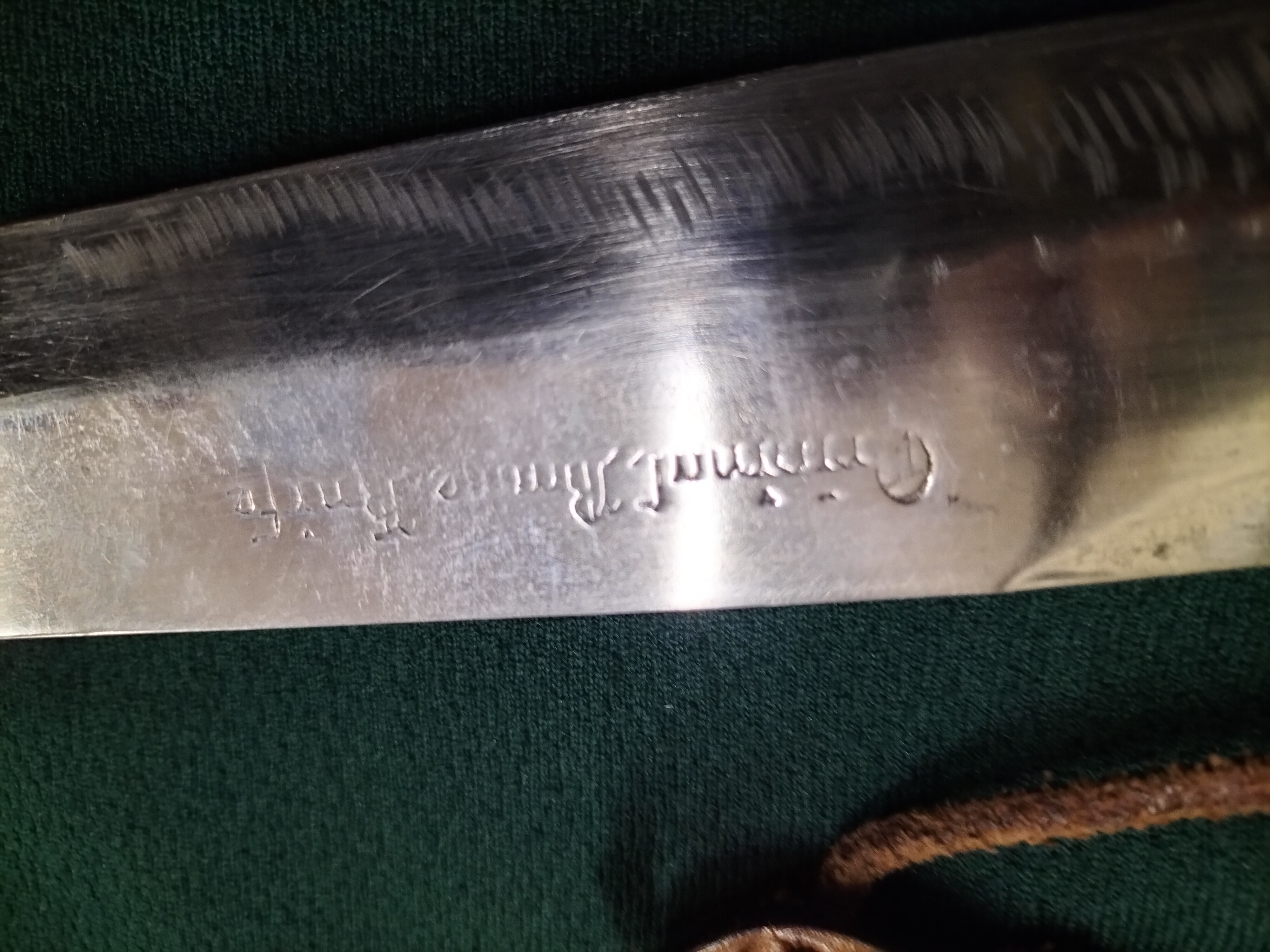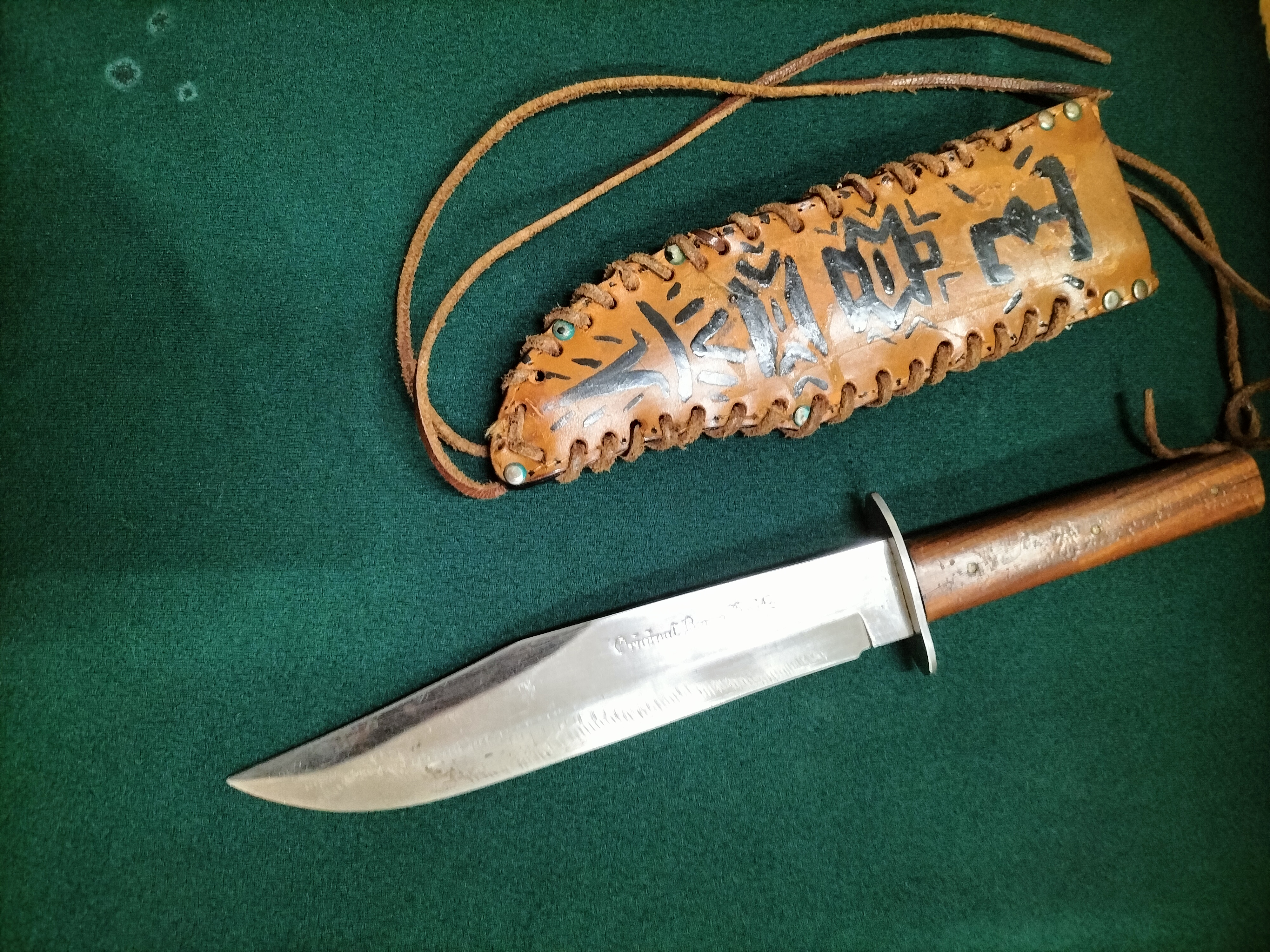 Solingen, fixed blade Bowie knife, single clip point blade, smooth dark wood handle, etched Original Bowie Knife to the blade face. Includes a custom leather sheath with decorative lacing and hand-painted motifs. Blade length 10 inches.