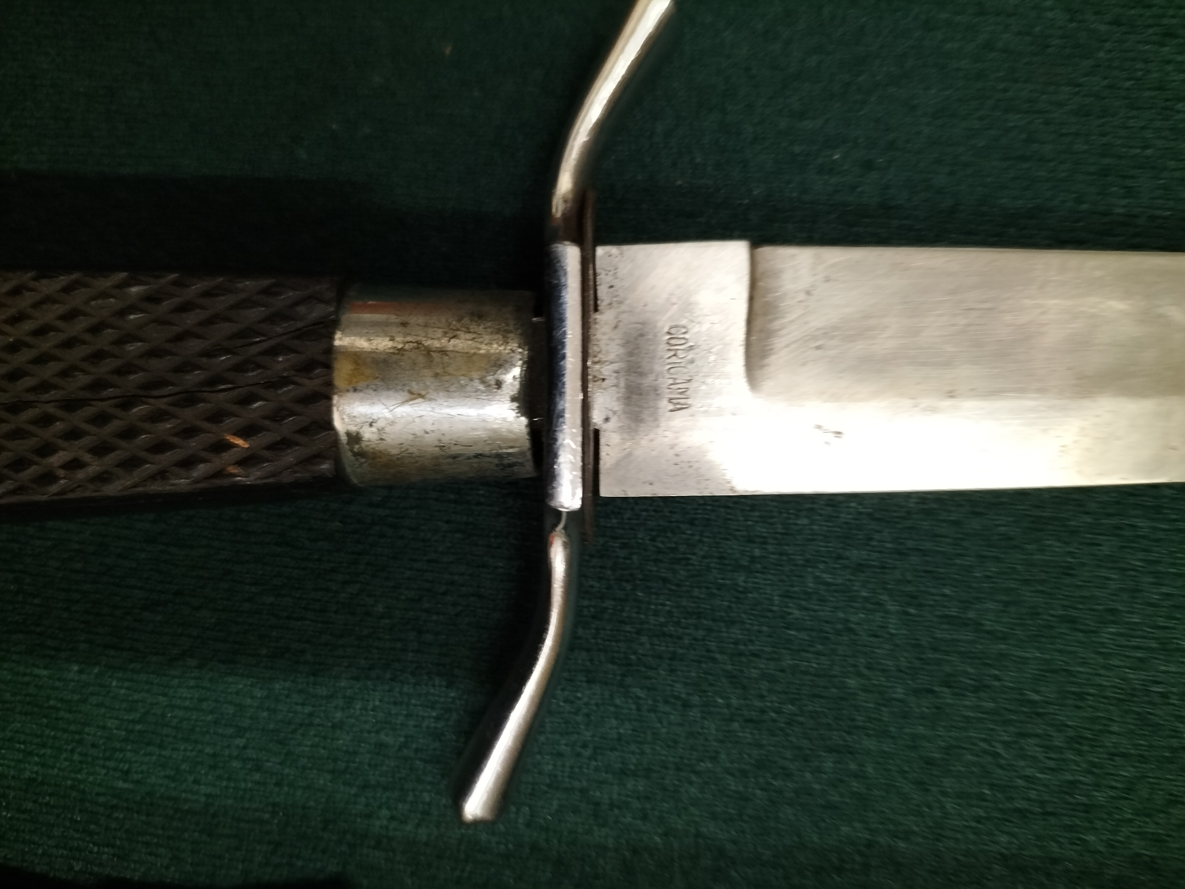 A lot of two distinct fixed-blade knives. The first is a Solingen hunting dagger manufactured by Friedrich Herder Abr. Sohn, featuring a polished steel double-edged spear-point blade and a dark, chequered synthetic composition handle. This piece is fitted with an S-curved steel crossguard and a polished metal ferrule, with the ricasso bearing the ORIGANA tang stamp. The second item is an unmarked decorative knife or letter opener featuring a single-edged steel drop-point blade and an intricately carved openwork floral scrollwork handle, likely of bone or ivory, with an engraved white metal ferrule. Blade lengths 15cm and 10cm.