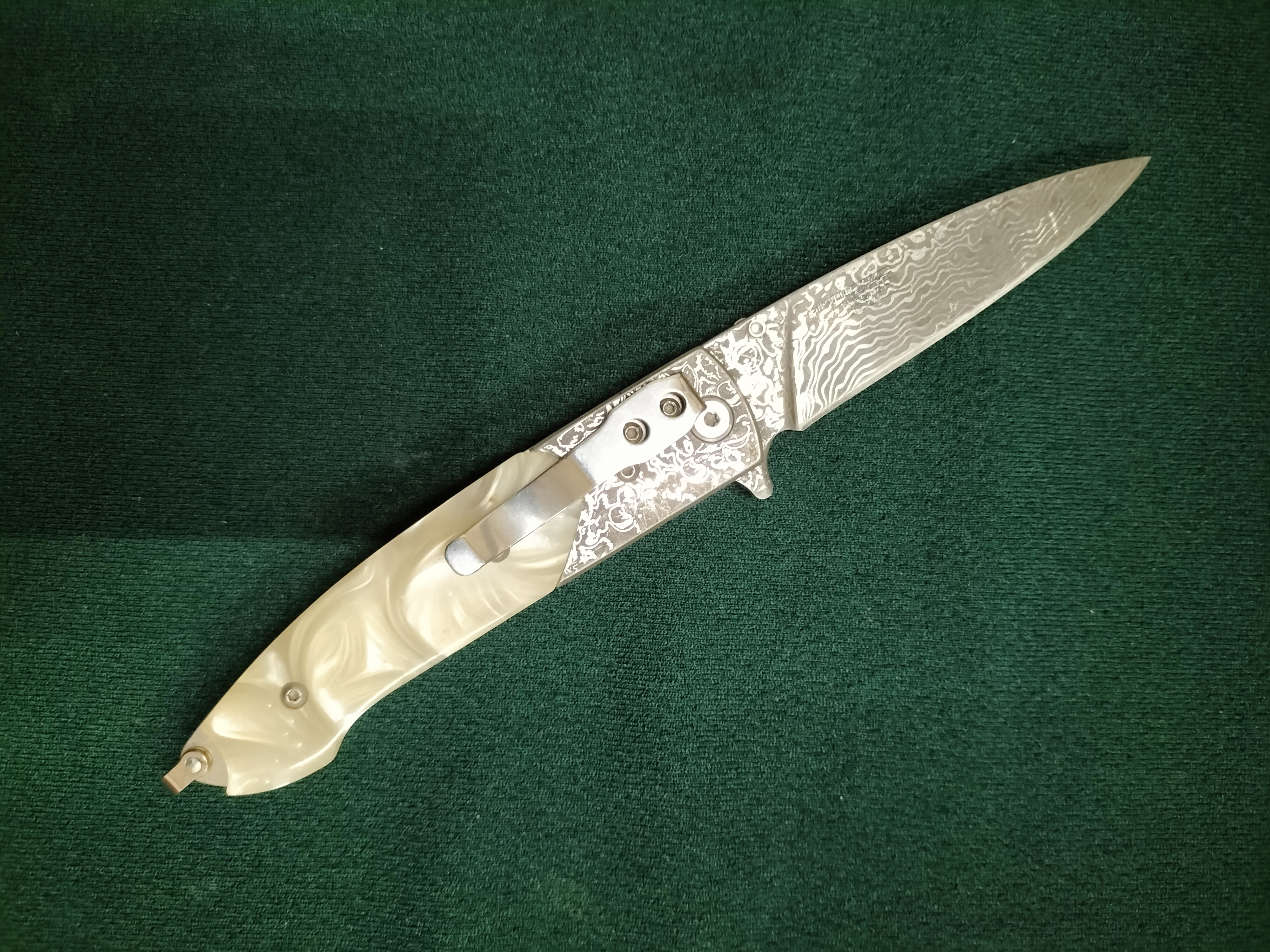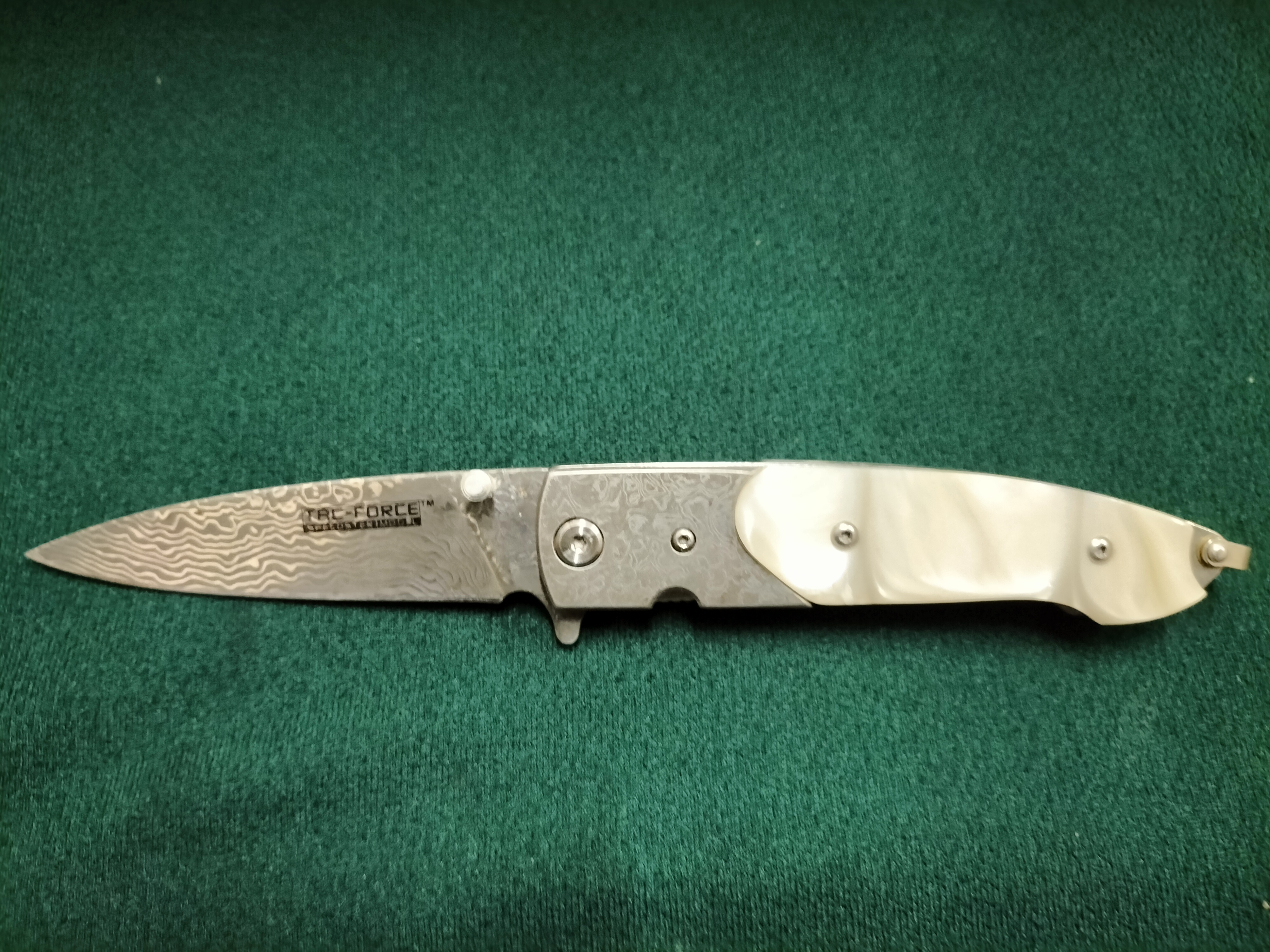 Tac-Force manual folding pocket knife featuring a single drop-point blade with a decorative laser-etched Damascus-style pattern. The handle is constructed with pearlescent synthetic scales and etched metal bolsters. The blade is laser-marked TAC-FORCE over SPEEDSTER MODEL. Blade length 3.25 inches.