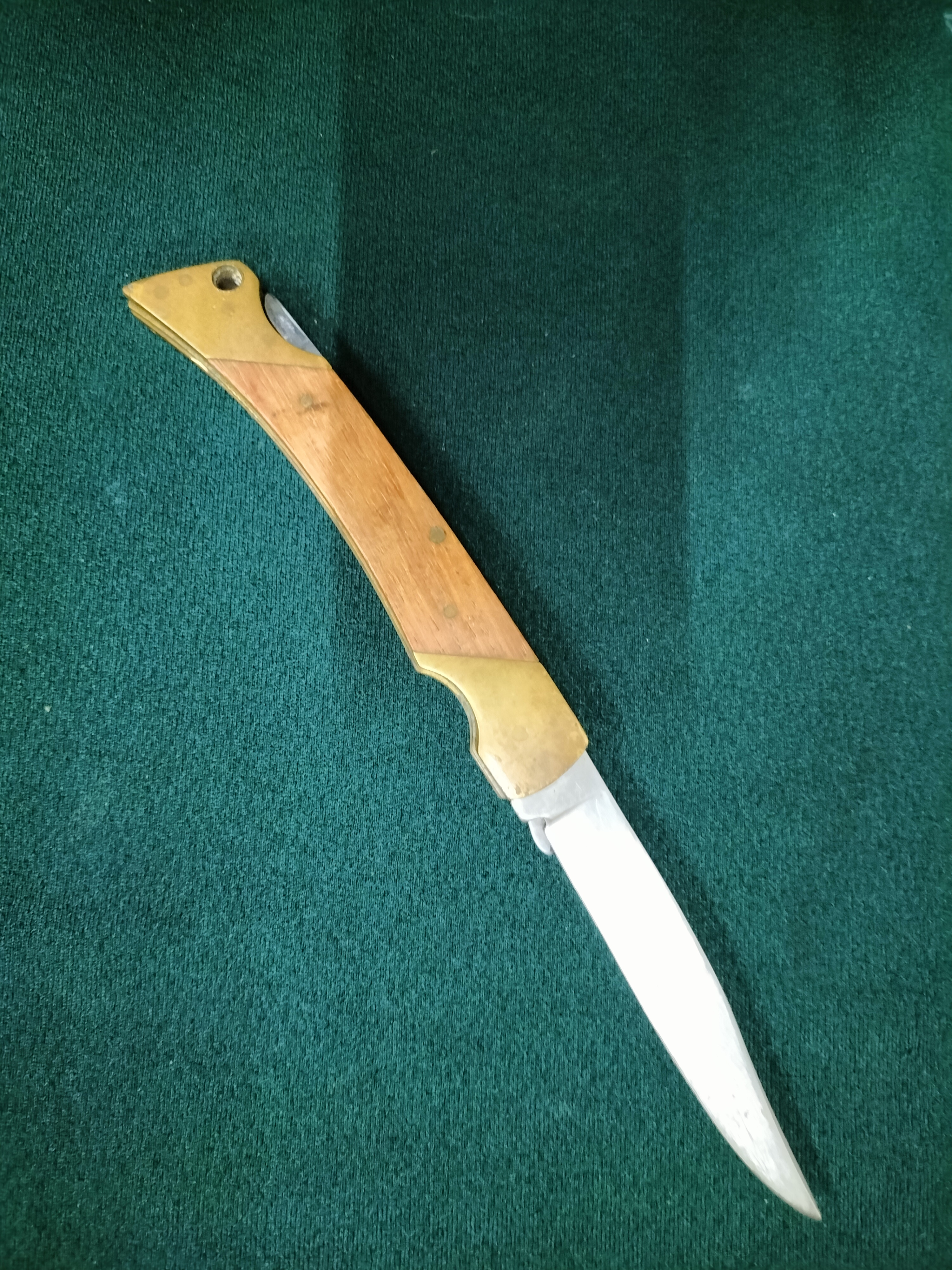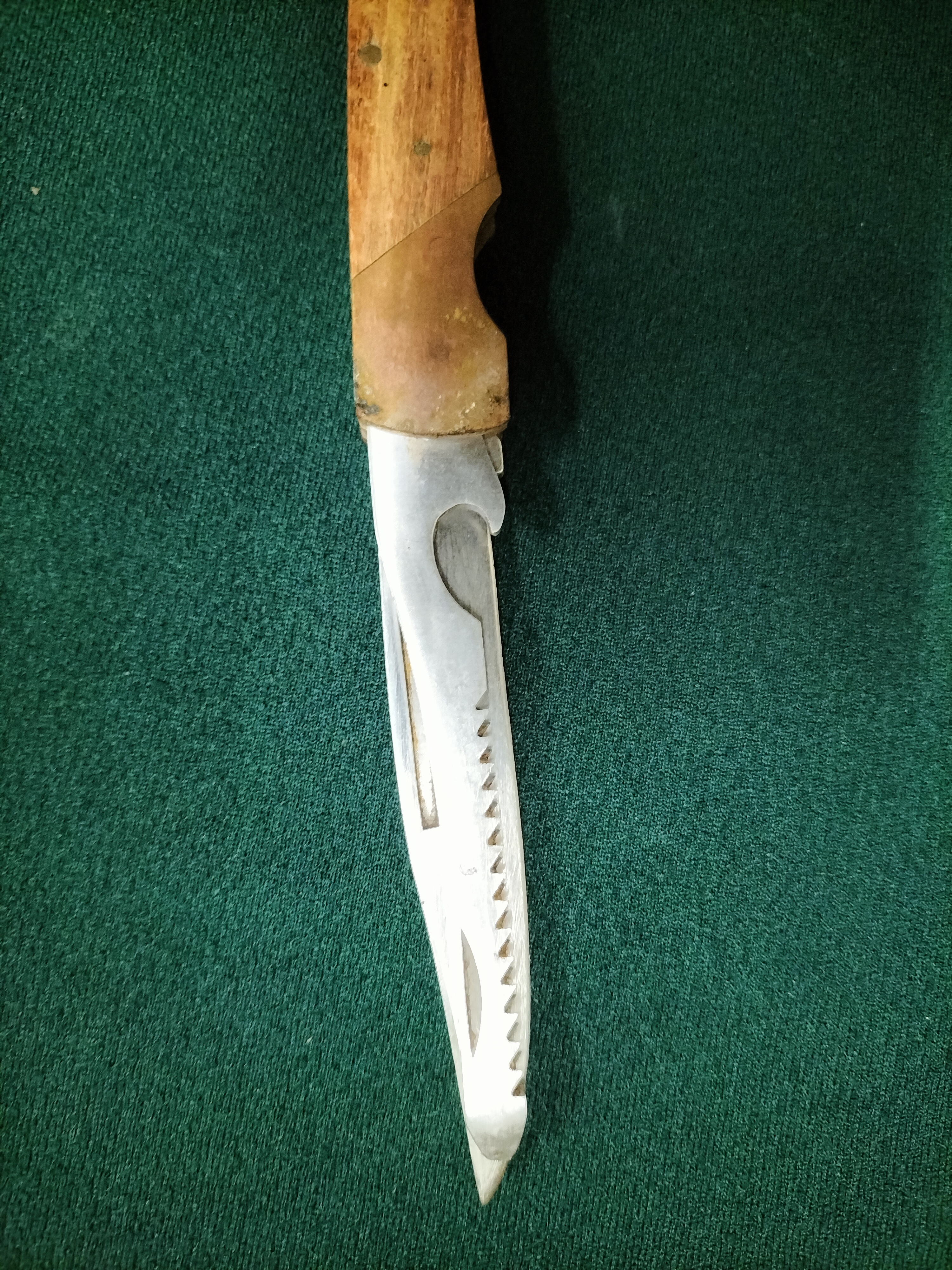An unmarked multi-blade lockback folding knife. This utility pattern features two stainless steel blades: a primary clip point blade and a secondary multi-tool blade incorporating a saw edge, bottle opener, and a flat-head screwdriver tip. The handle is fitted with light-coloured hardwood scales secured by brass pins, featuring brass bolsters and liners with a lanyard hole at the pommel. No tang stamp is present. Blade length: 9.5 cm.